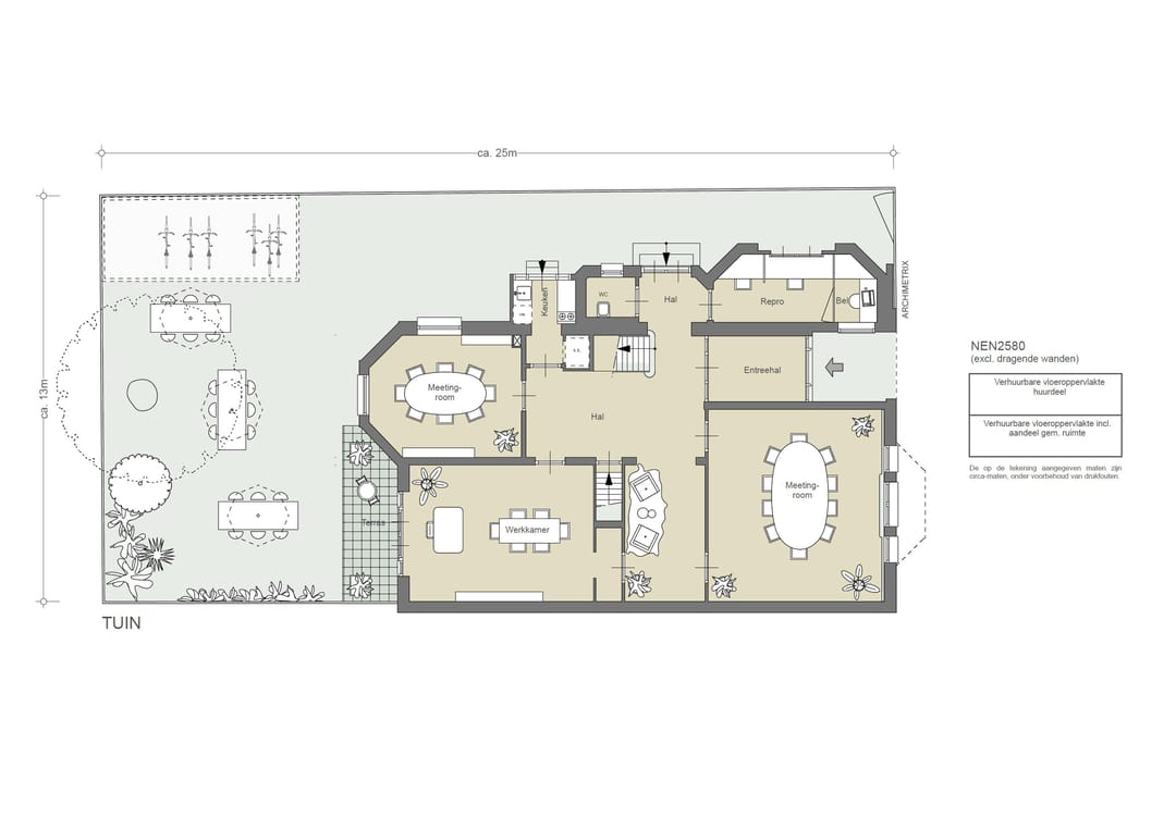 Toegang tot de tuin van royaal formaat is mogelijk vanuit de kantoorruimtes op de begane grond of via de poort aan de zijkant van het gebouw. De tuin is gelegen op het westen waardoor de meeste zon in de middag en avond in de tuin schijnt. De tuin is voorzien van wit/grijze grindstenen. Opvallend is de prachtig grote beuk die zomerdag voor voldoende schaduw zorgt om in de tuin te kunnen genieten van een kop koffie, lunch of informeel overleg. Rondom is de tuin voorzien van een schutting. Er is een fietsenschuur waar het mogelijk is om fietsen, bakfietsen en scooters te parkeren.
