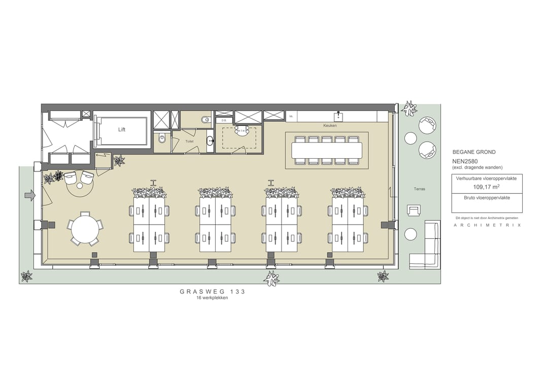 In het hart van dit ensemble ligt Verde, een markant gebouw met een uitgesproken architectonische uitstraling. Op de begane grond wordt een lichte kantoorruimte van circa 109 m² VVO te huur aangeboden. Het kantoor heeft hoge plafonds, grote raampartijen en een schuifpui naar een eigen buitenruimte op het zuidwesten. De ruimte wordt volledig afgebouwd naar ontwerp van TANK. Waarbij gebruik gemaakt wordt van met hoogwaardige materialen waardoor een smaakvol geheel zal ontstaan. Het beschikt over een eigentijdse keuken, een verzorgde toiletruimte en wanden met een combinatie van strak schilder- en tegelwerk. De kantoorruimte wordt opgeleverd met een duurzame WKO-installatie die tijdens het stookseizoen kan verwarmen en op warme zomerdagen kan koelen via de vloer.