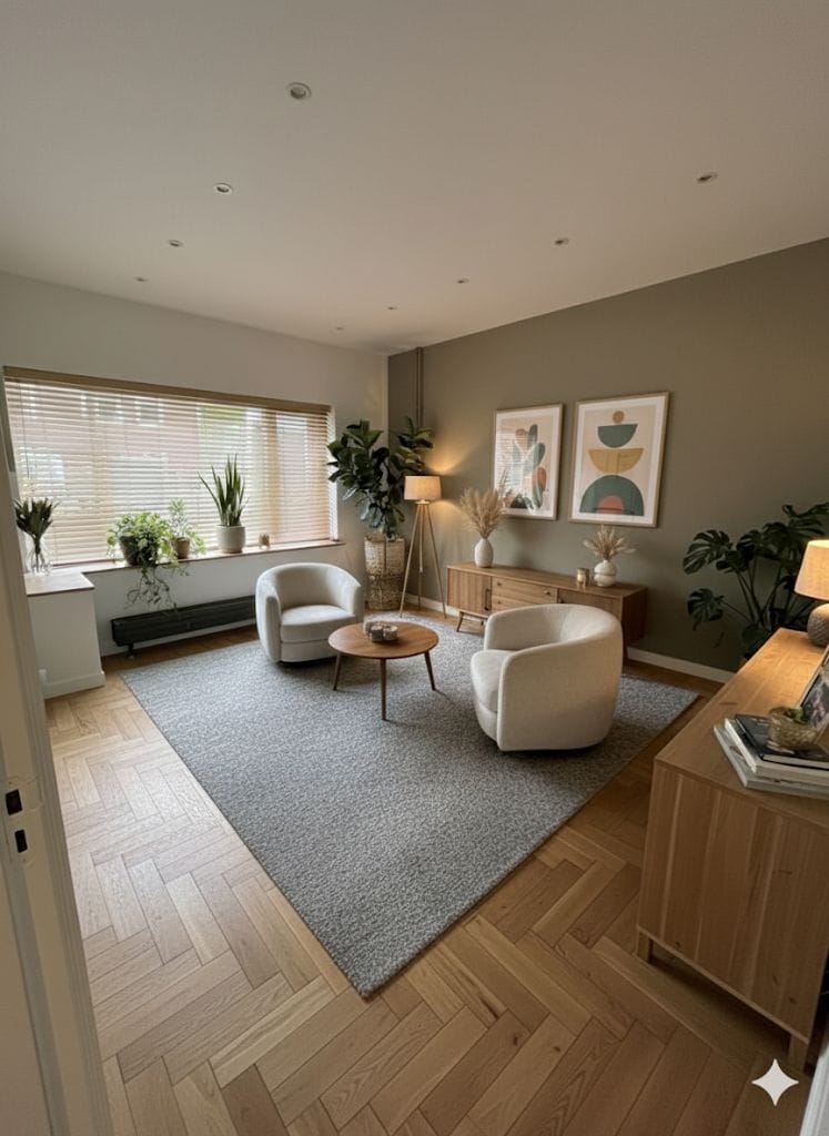 - Rear room: a quiet space overlooking the inner gardens, ideal for use as a practice or treatment room.