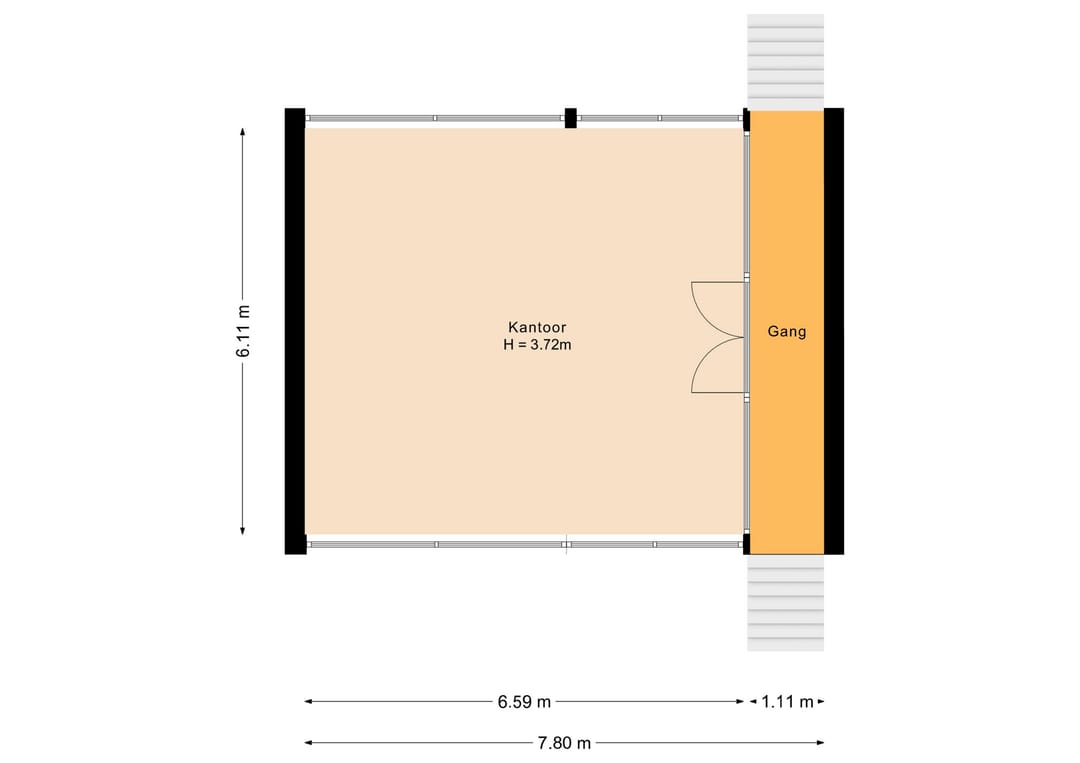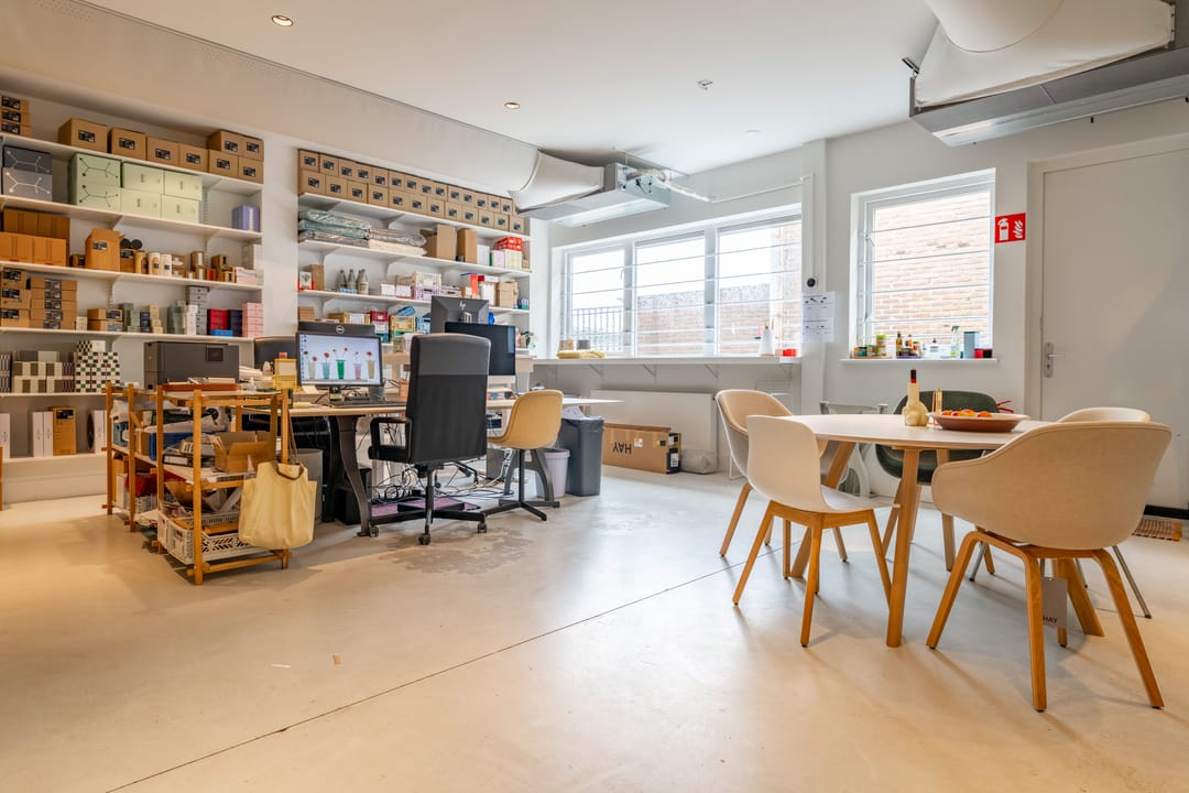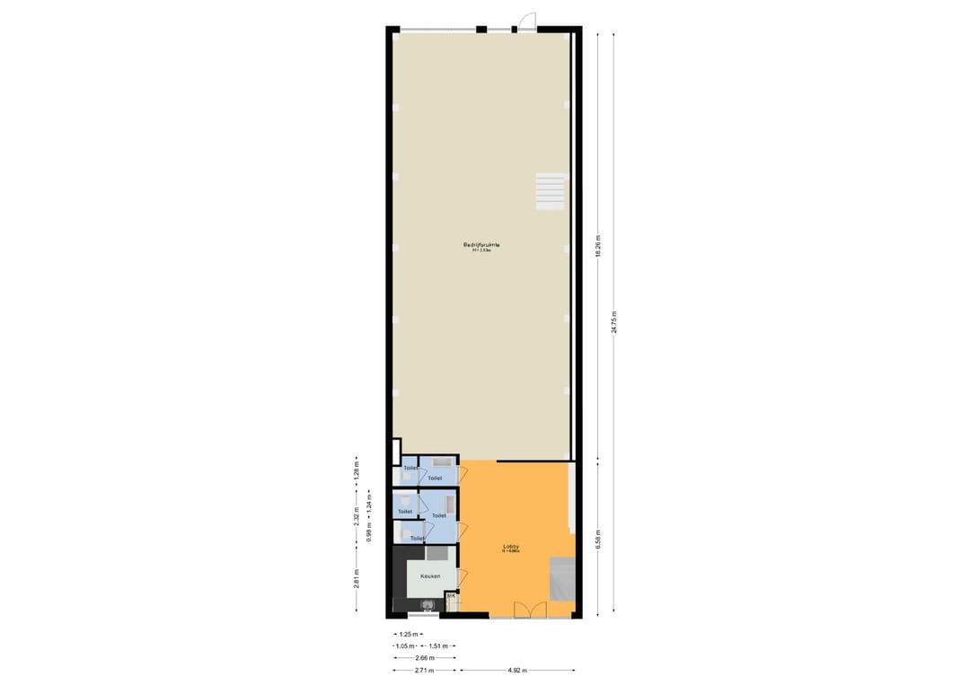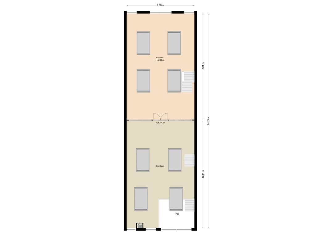 De begane grond, met een oppervlakte van 184 m², is ingericht als bedrijfsruimte. Op de eerste verdieping bevindt zich een kantoorruimte van 174 m². Op de tweede verdieping is een extra kantoorkamer van 48 m².