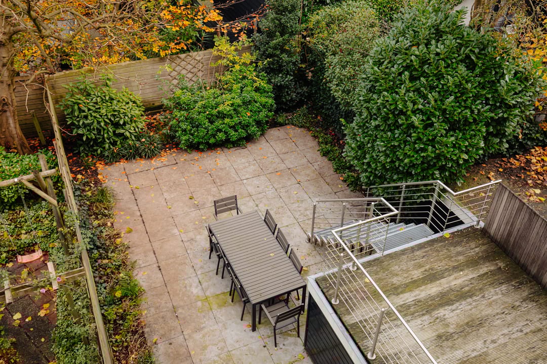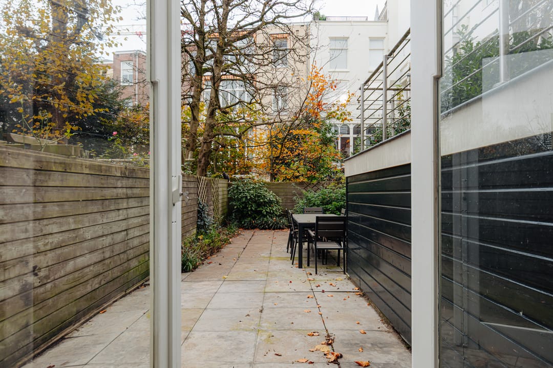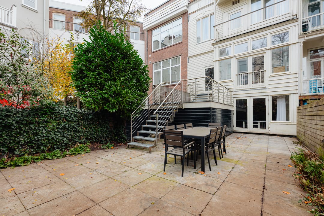 Er is een ruime achtertuin welke gelegen is op het noordwesten. Hierdoor is er in de late middag en in de avond zon in de tuin. De tuin is toegankelijk vanuit het souterrain via de openslaande deuren en vanaf de bel-etage waar er een verhoogd terras is met moderne trapopgang. De fraai aangelegde tuin is ideaal voor informele overleggen, lunchmomenten of een korte werkpauze.