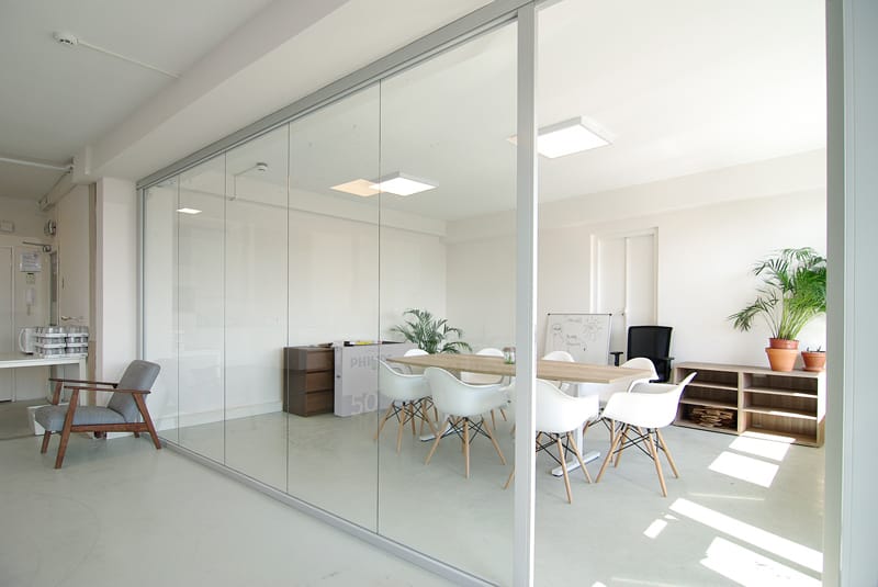 For meetings or focused creative sessions, the space includes two glass-walled boardrooms that offer privacy while maintaining the office's sense of openness, though the layout can be adapted to your own preferences.
