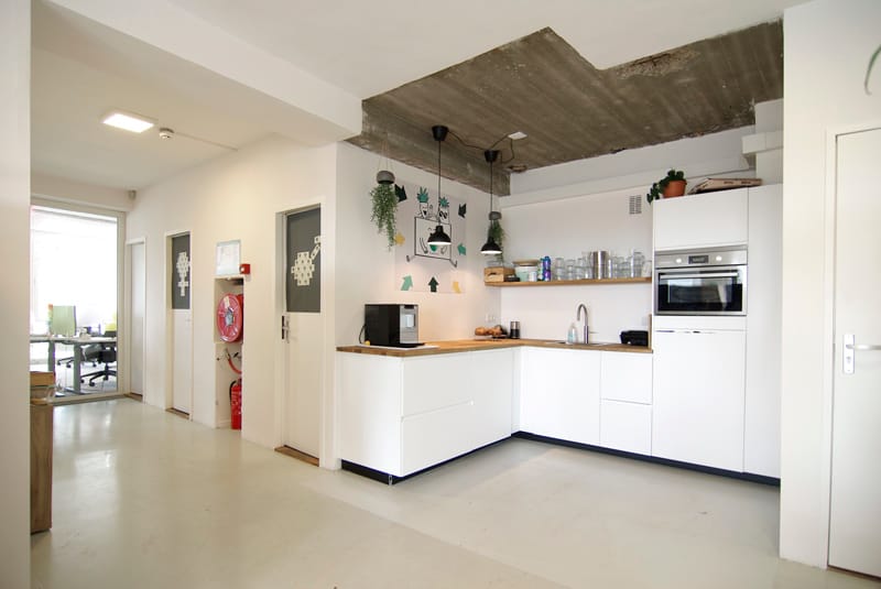 The floor is also equipped with a modern corner kitchen featuring a warm wooden countertop and built-in appliances, making it the perfect spot for a team lunch or a premium coffee break between tasks.