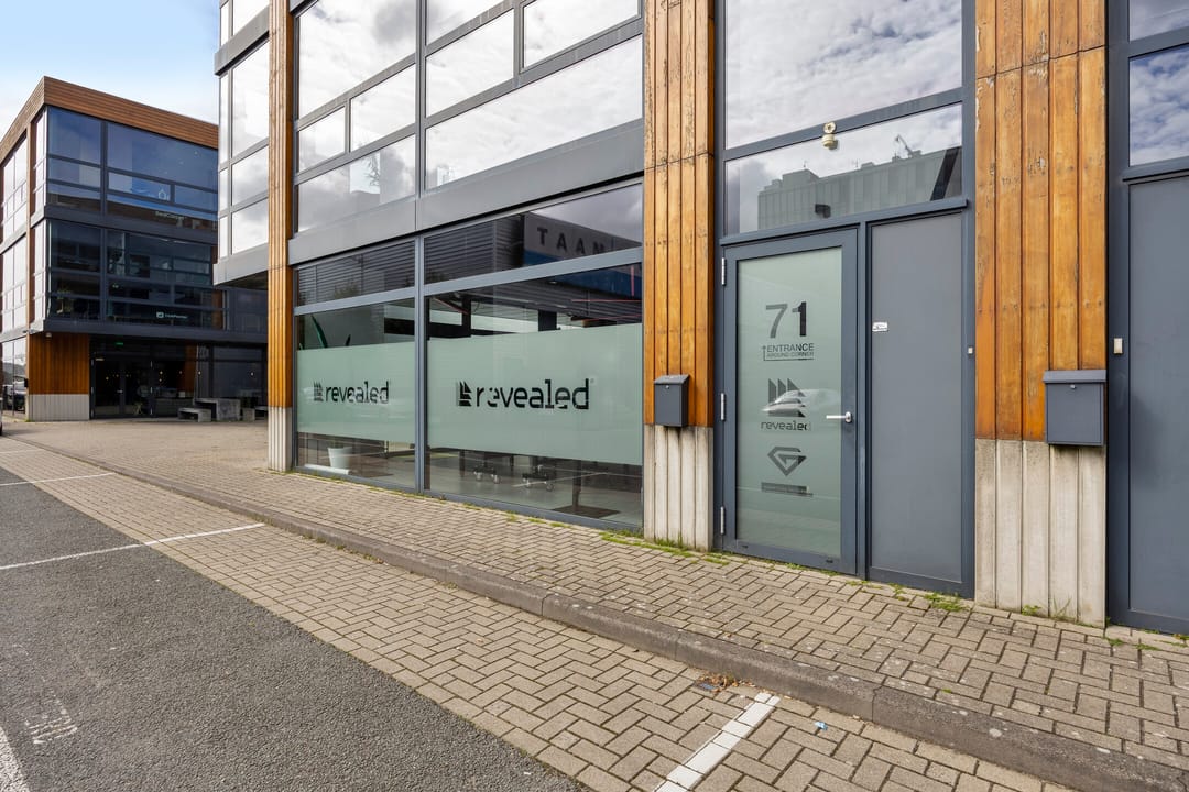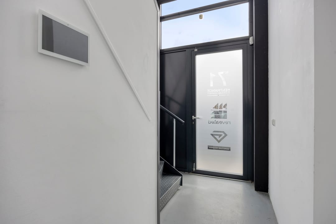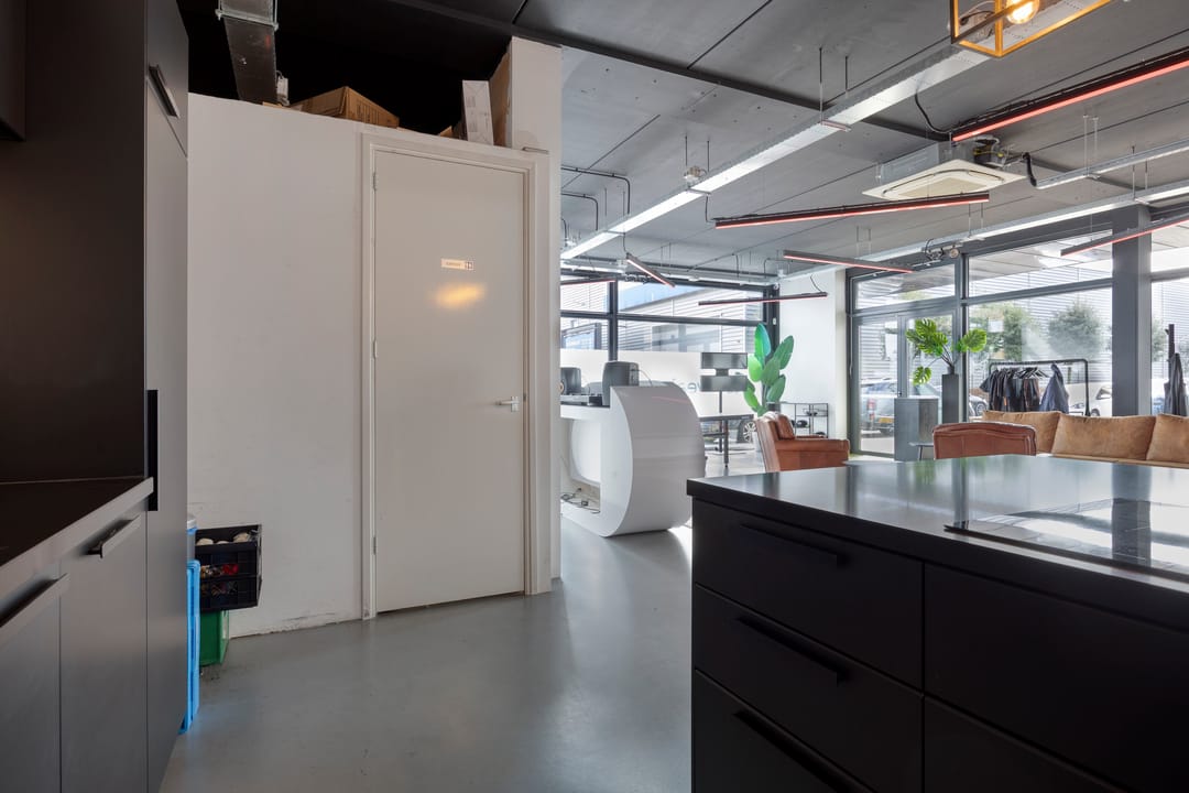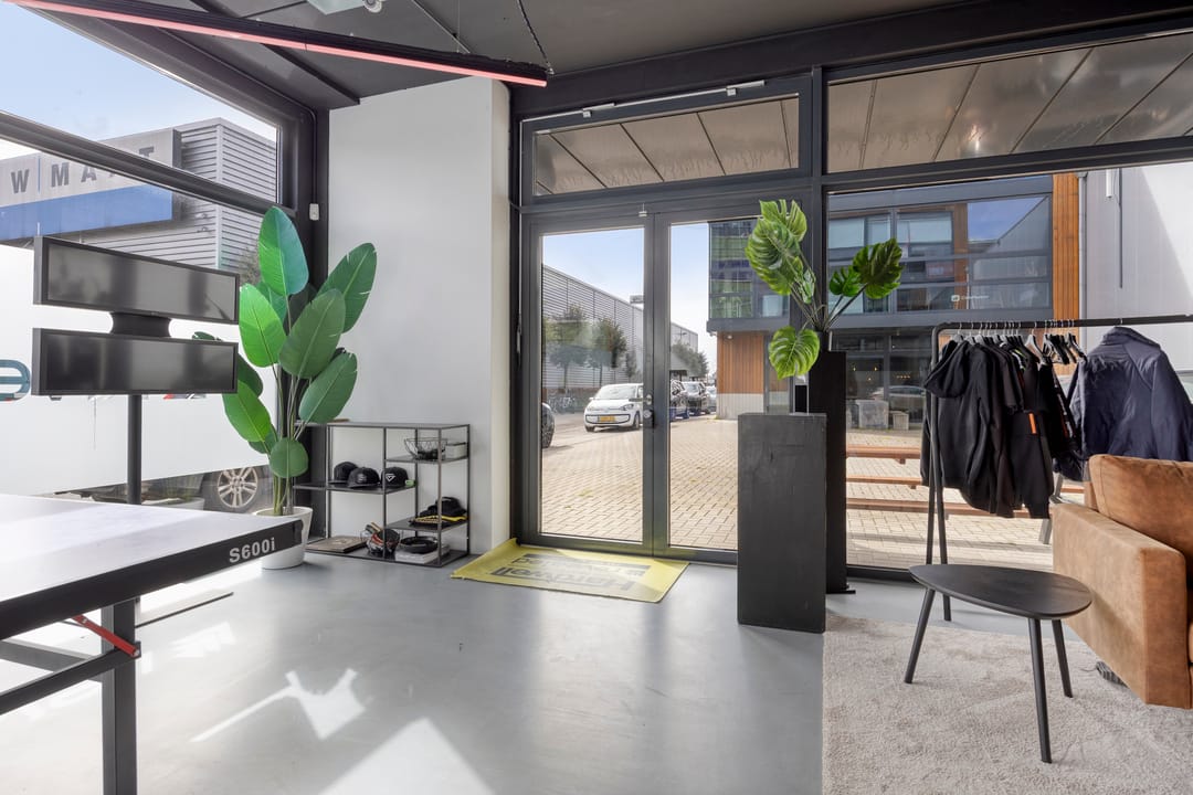 Dubbele entree (terraszijde en parkeerterrein) met toegang tot een ruime, multifunctionele vloer. Geschikt als ontvangst-, vergader- of showroomruimte, voorzien van pantry en toilet.