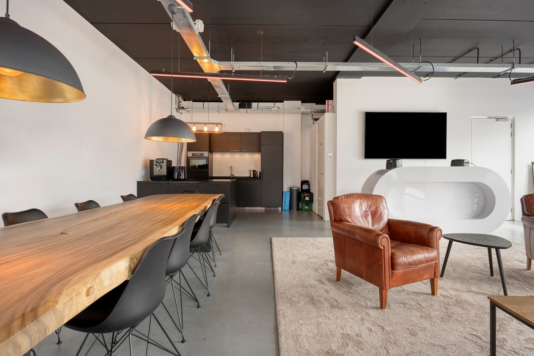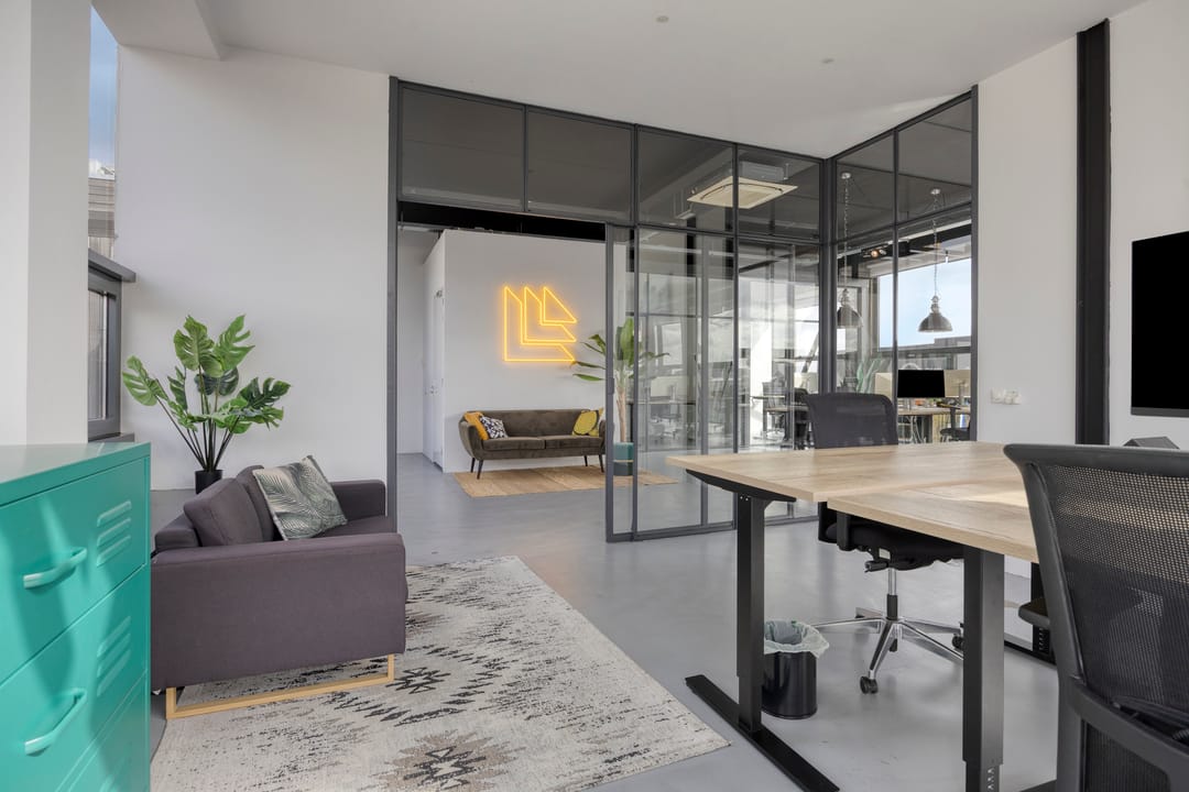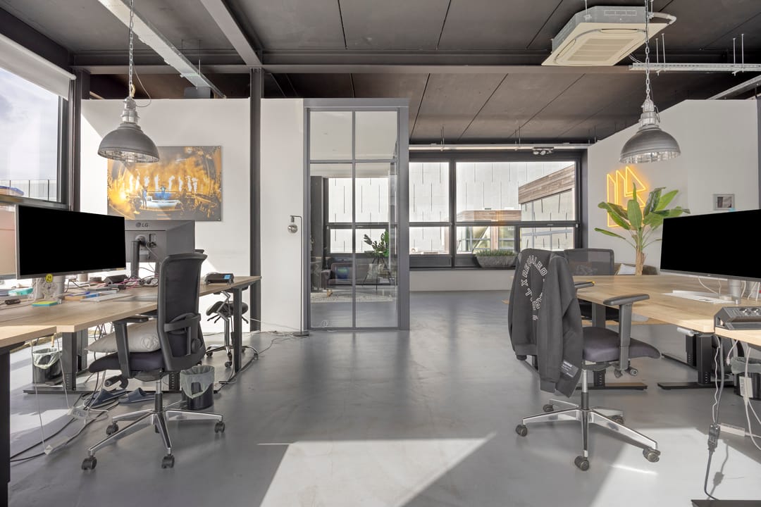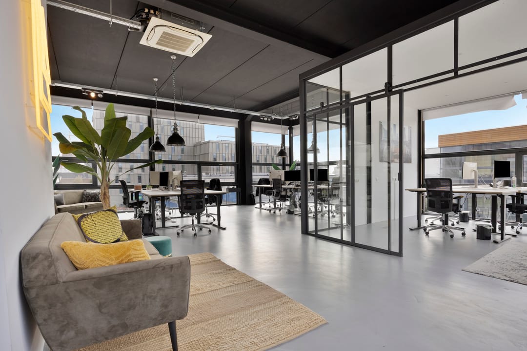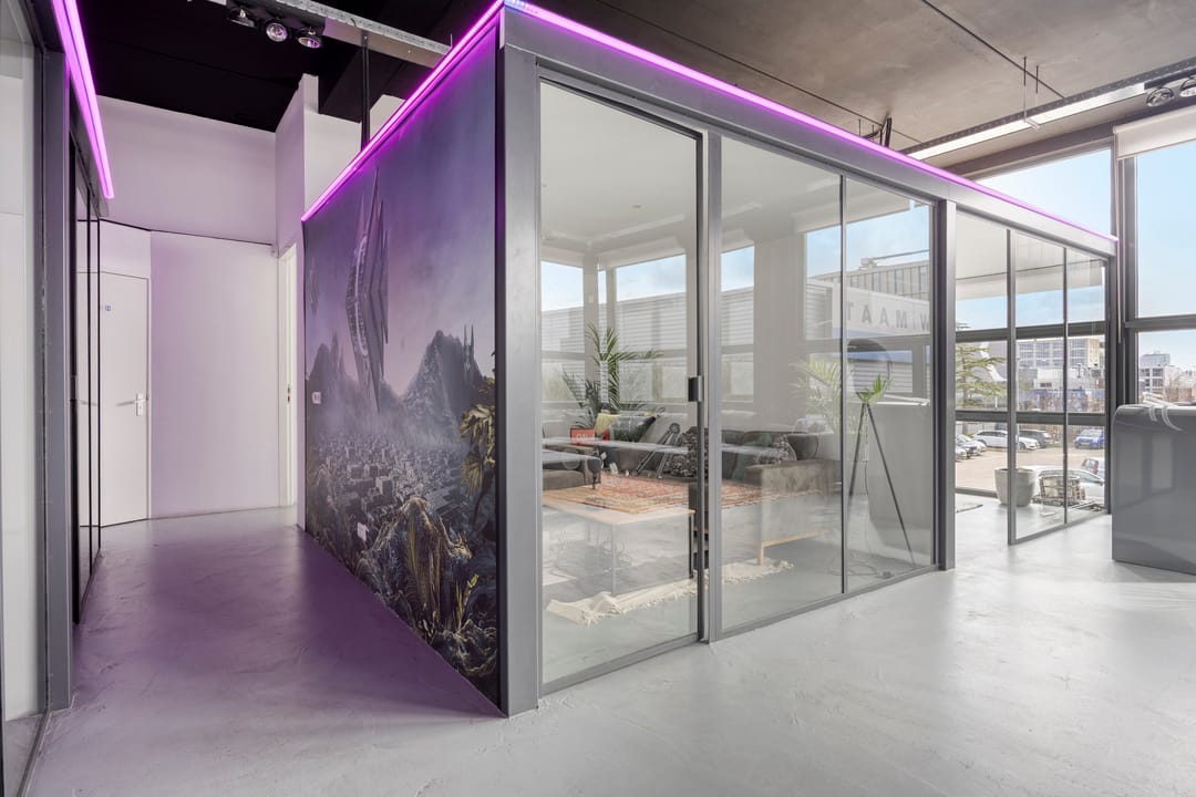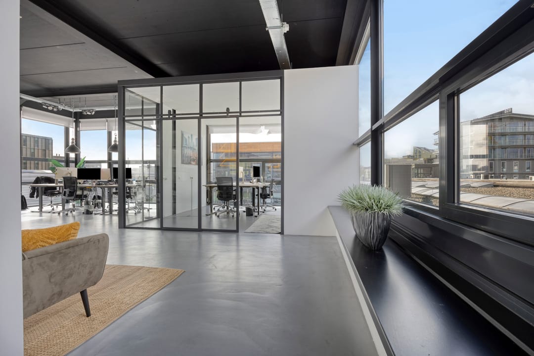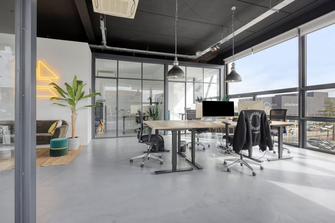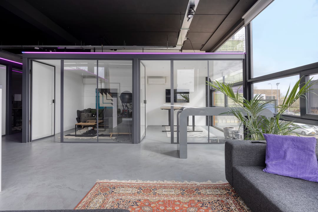 Drie afgesloten kantoorruimten gecombineerd met een ruime open werk- of loungeomgeving. Ideaal als directieverdieping, creatieve studio of flexibele werkruimte.