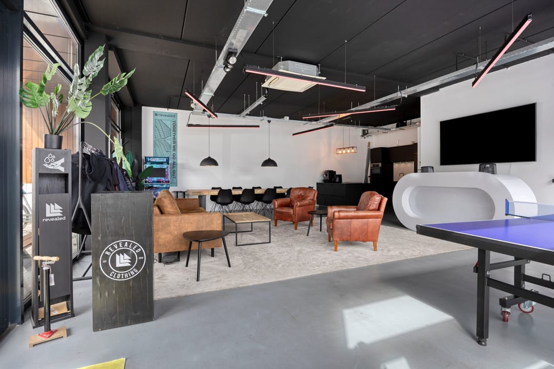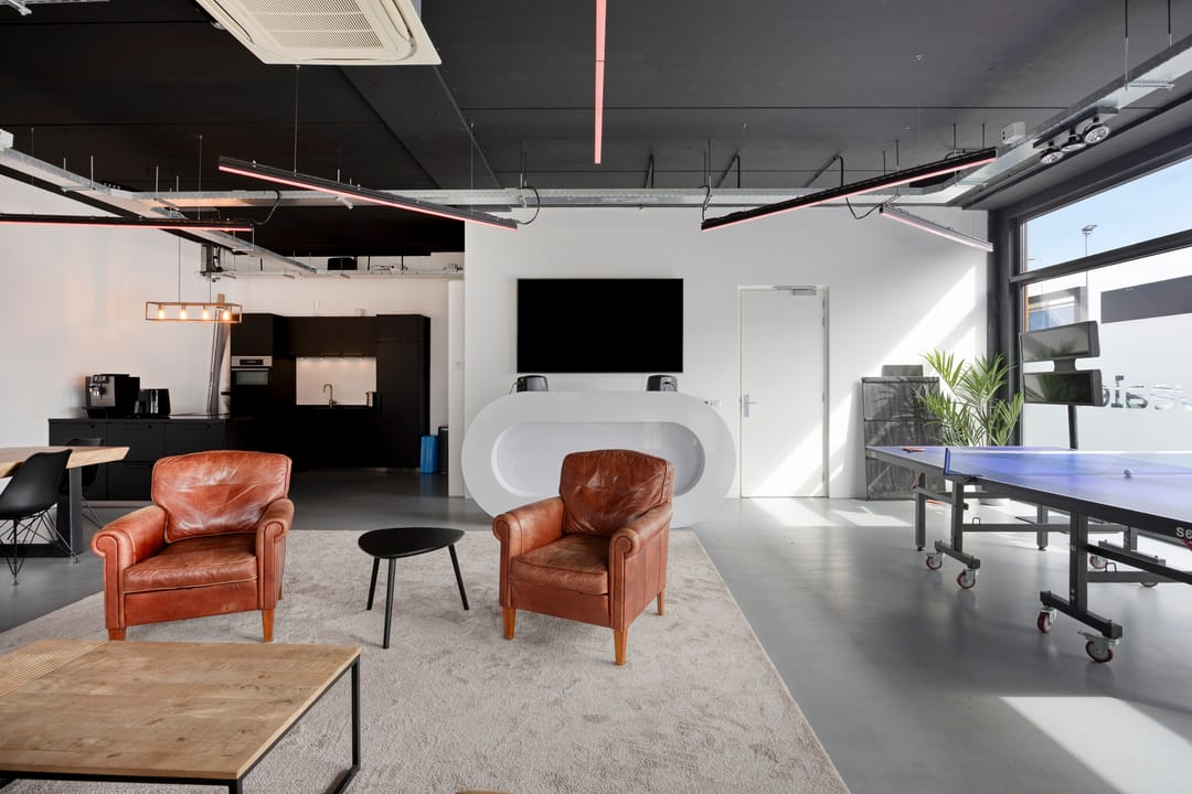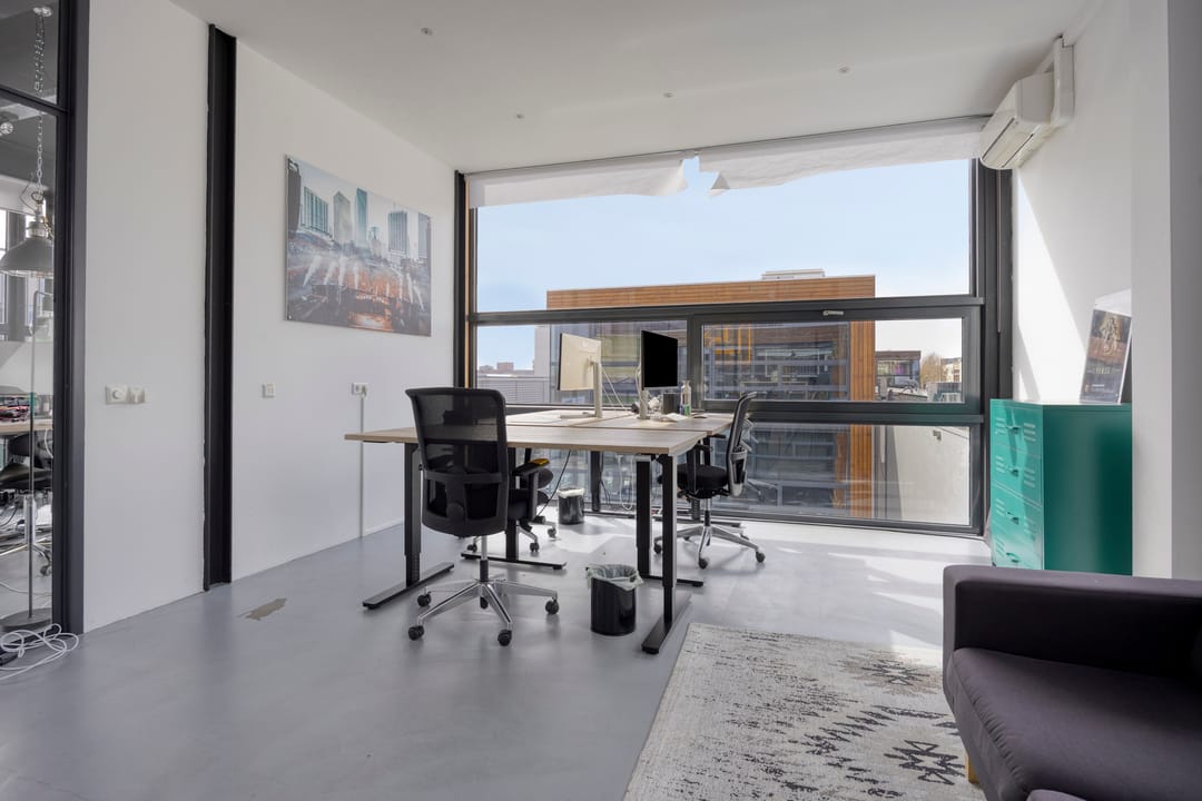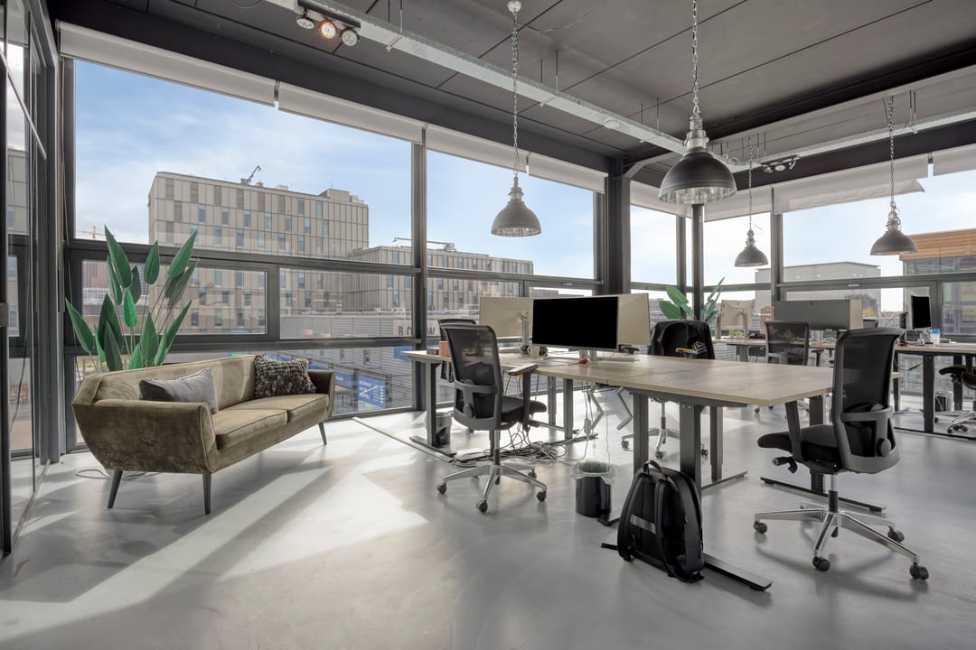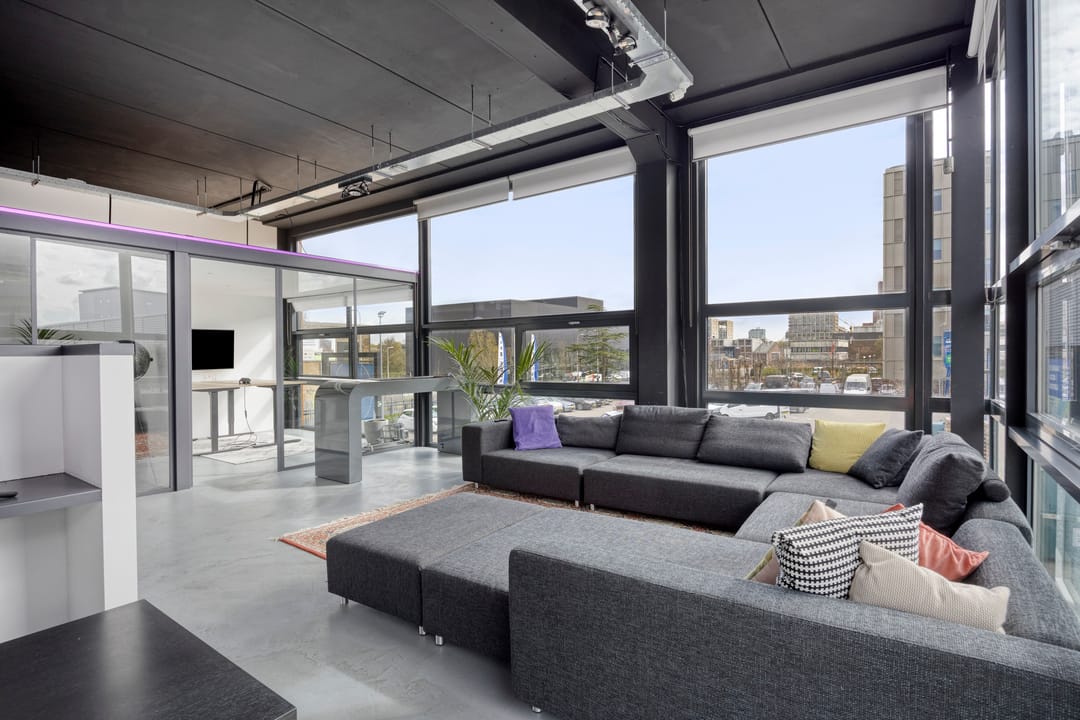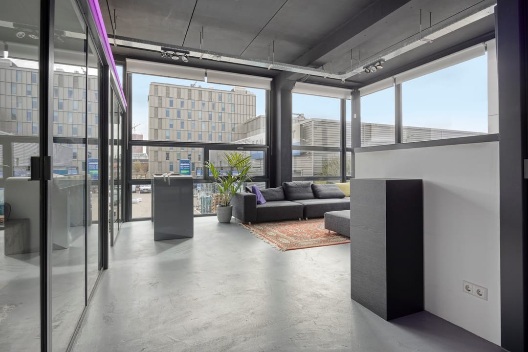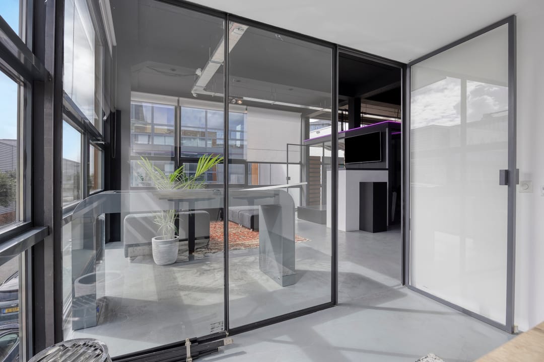 Drie afgesloten kantoorruimten gecombineerd met een ruime open werk- of loungeomgeving. Ideaal als directieverdieping, creatieve studio of flexibele werkruimte.