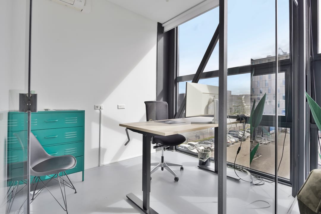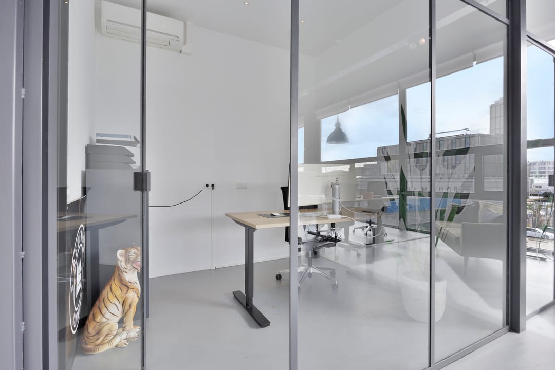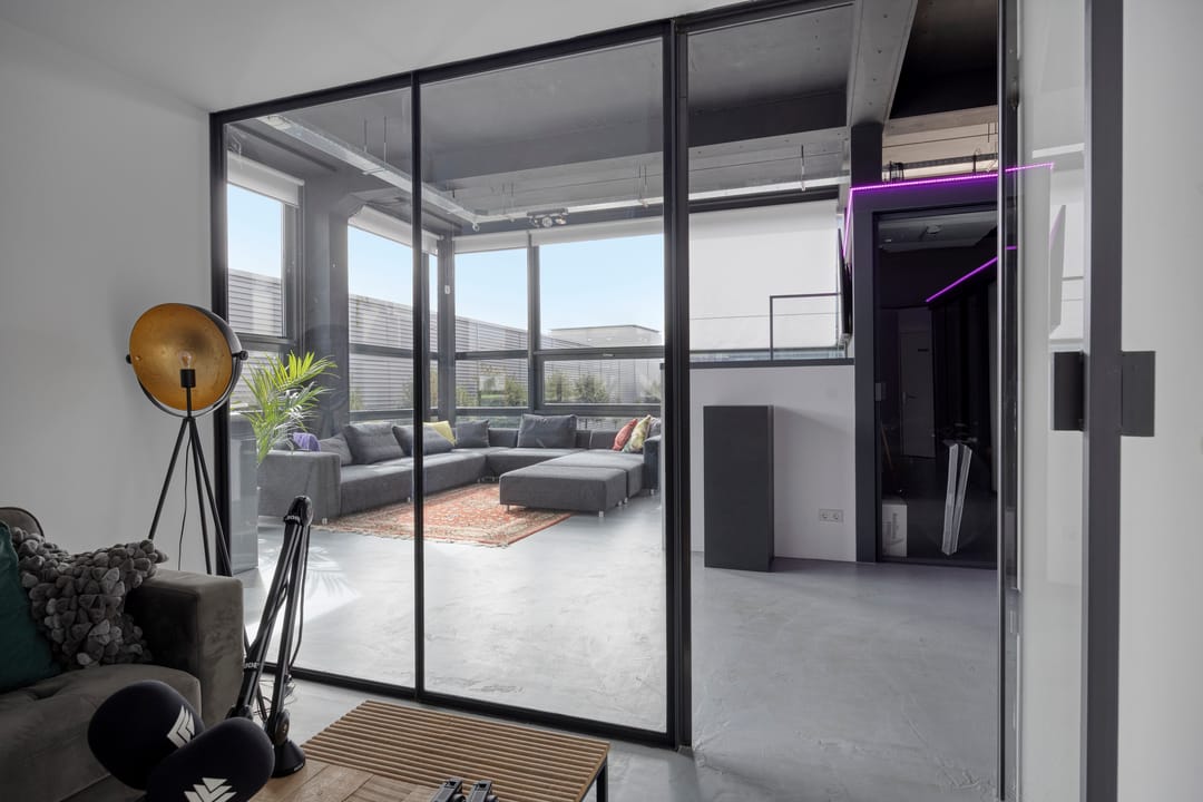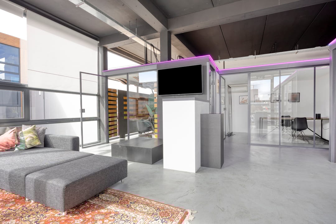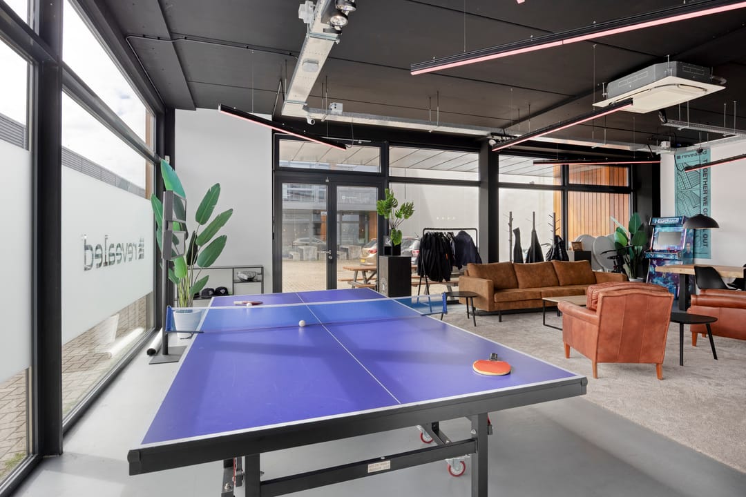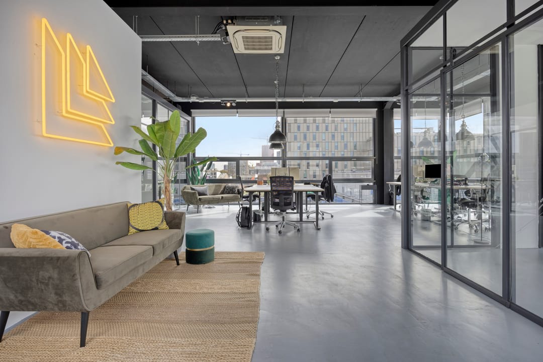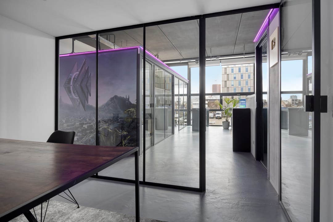 Drie afgesloten kantoorruimten gecombineerd met een ruime open werk- of loungeomgeving. Ideaal als directieverdieping, creatieve studio of flexibele werkruimte.
