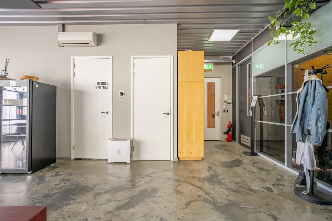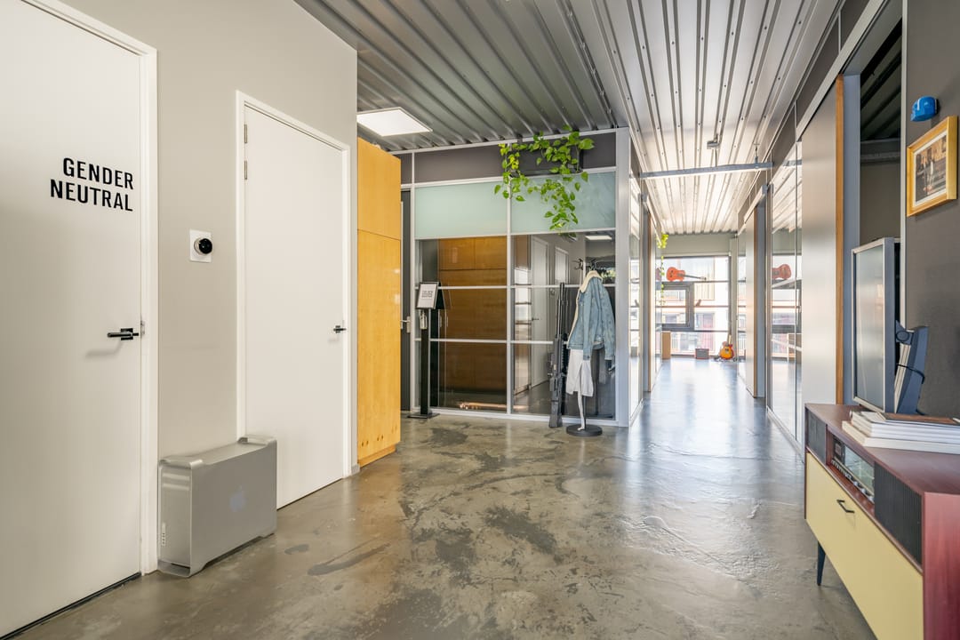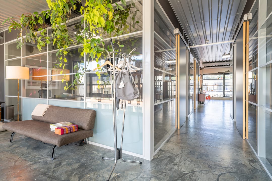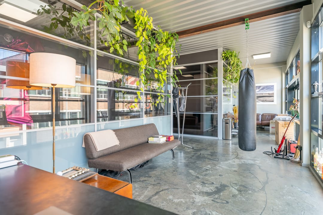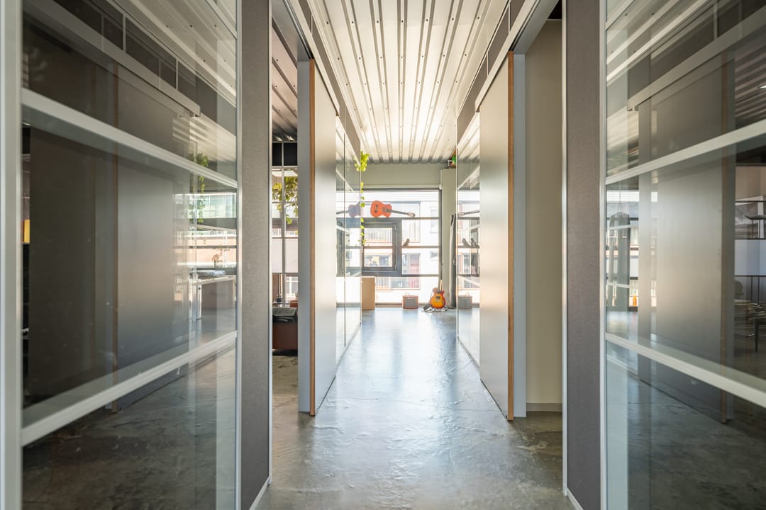 De voorzijde en de achterzijde worden gescheiden door een glazen vergaderkamer in het midden van de ruimte.