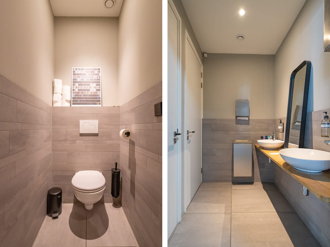 Aan de achterzijde bevinden zich de toiletgroep, de pantry en openslaande deuren naar het terras,