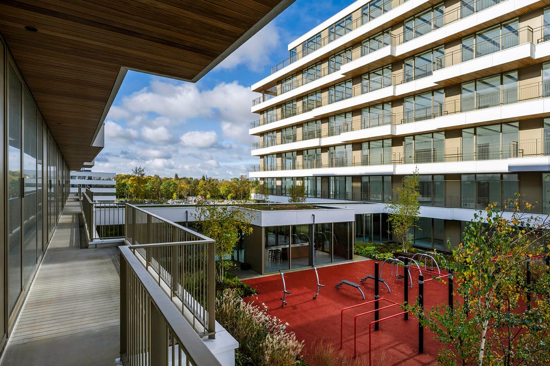Dit opvallende gebouw, een samensmelting van glas, staal, hout en beton, staat als symbool voor kracht en innovatie. Met zijn robuuste ontwerp en 1,5 kilometer strekkende balkons/terrassen, straalt het vertrouwen uit en nodigt het uit tot nieuwe ideeën en creativiteit.