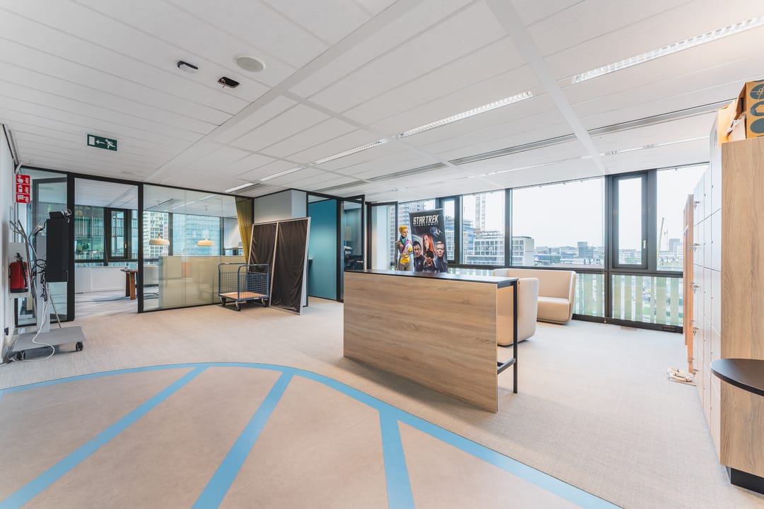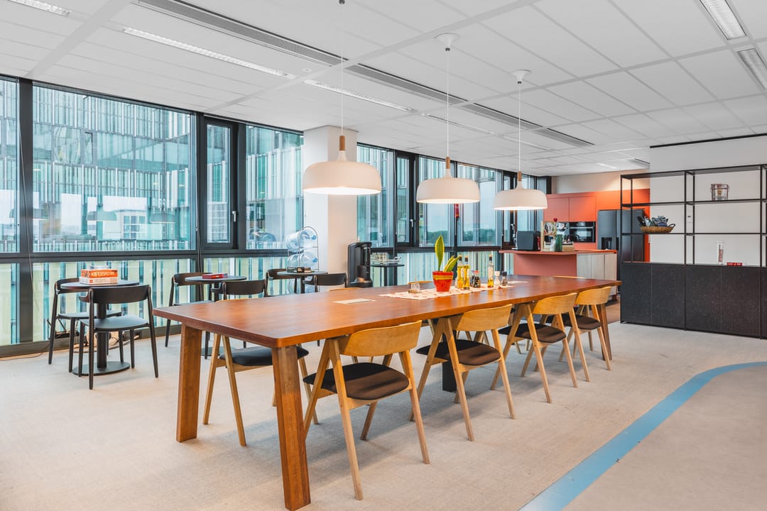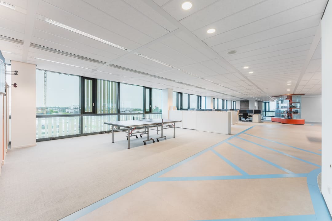 The available office space is situated on the fourth floor and benefits from abundant natural light thanks to large windows, creating an open and pleasant working environment. The space comprises approximately 616 m² and is offered fully furnished and turn-key. With its flexible layout featuring open work areas, meeting rooms, and a modern pantry, this office is perfectly suited for medium to larger organizations seeking a ready-to-use workspace in a representative setting.