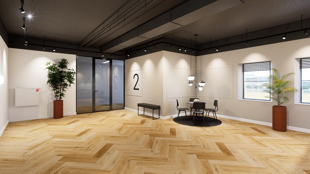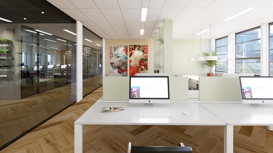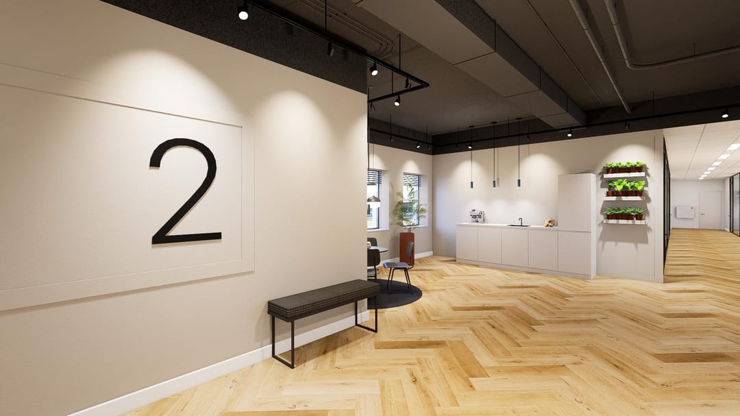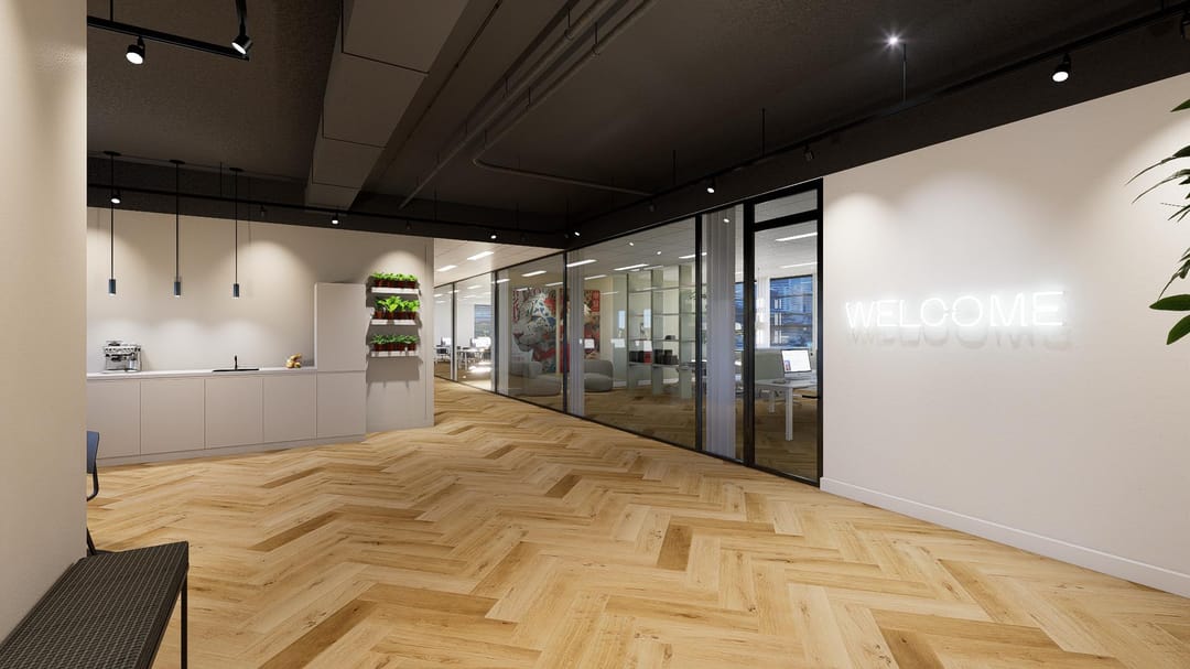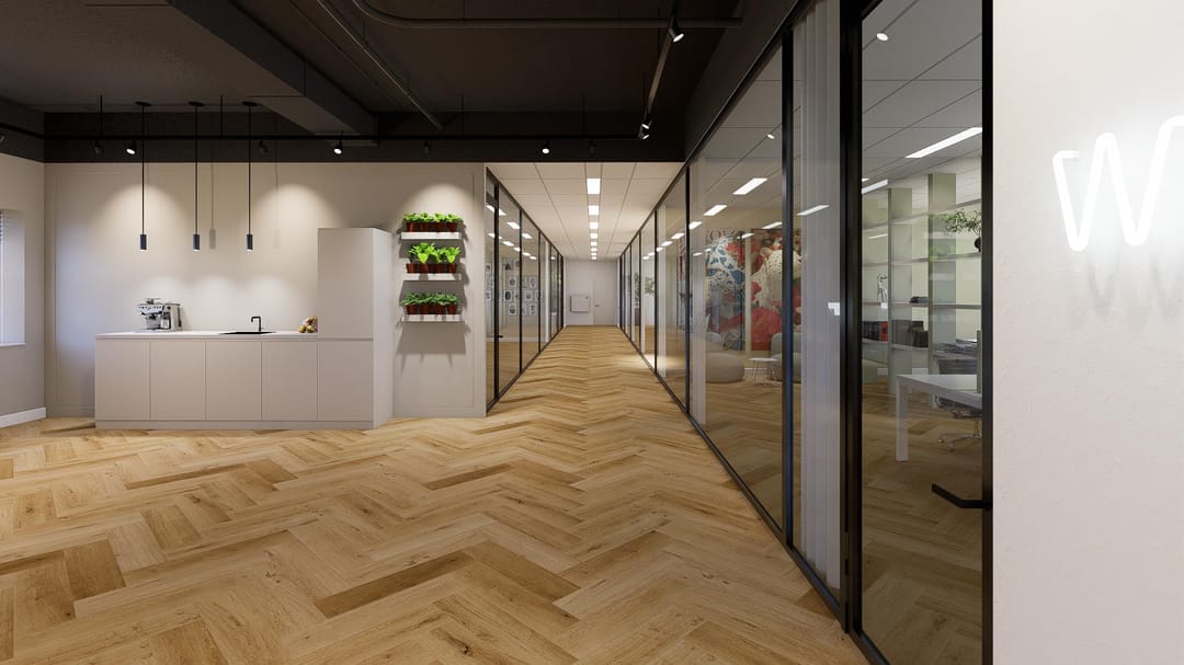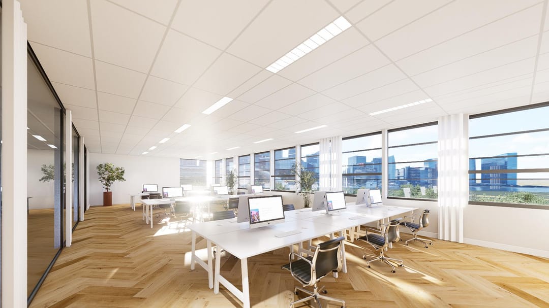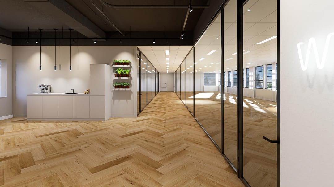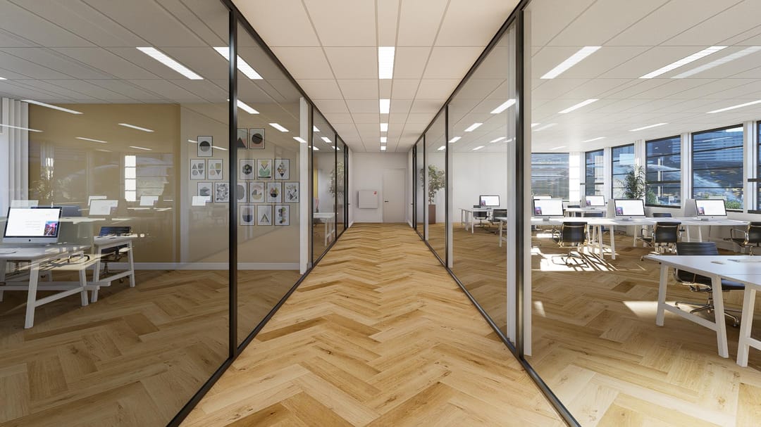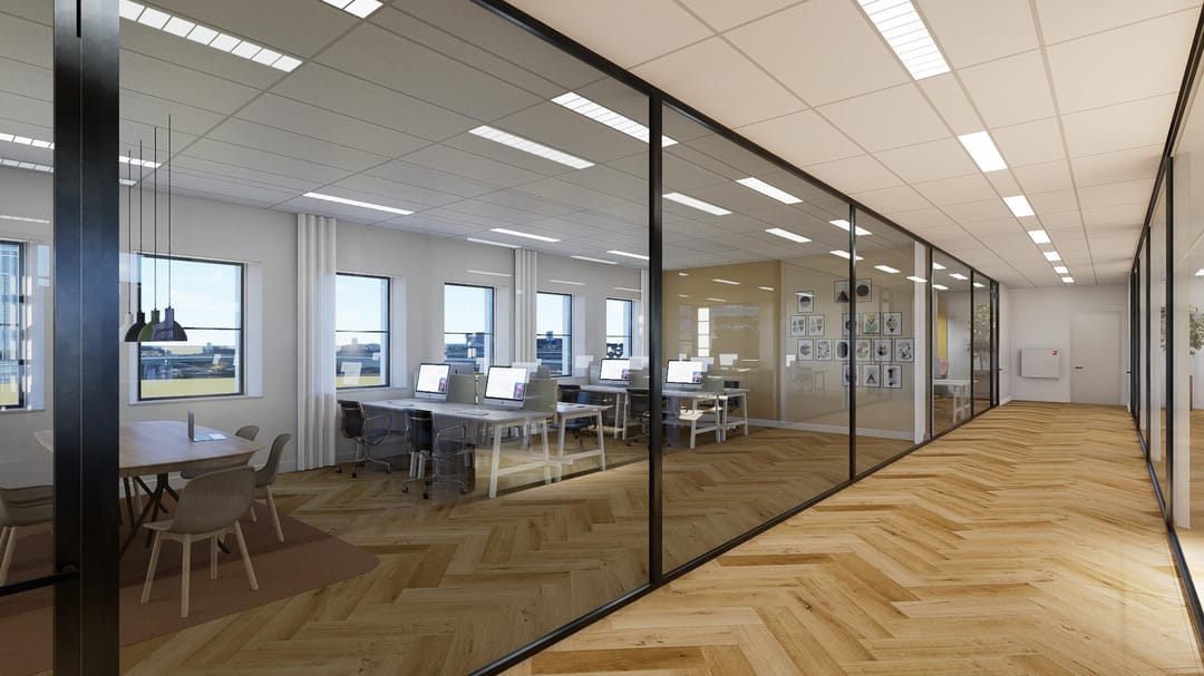 This floor comprises approximately 481 sq. m. LFA of modern and sustainable office space, featuring extensive glazing that creates a bright and open atmosphere.