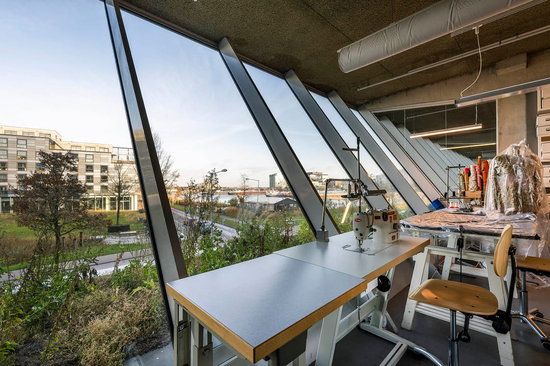 uit glas bestaat (floor to ceiling) met spectaculair uitzicht over het IJ.