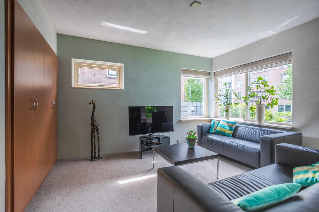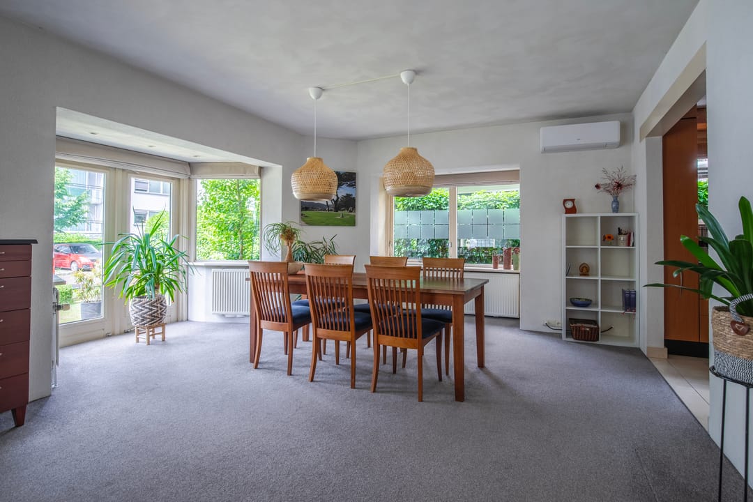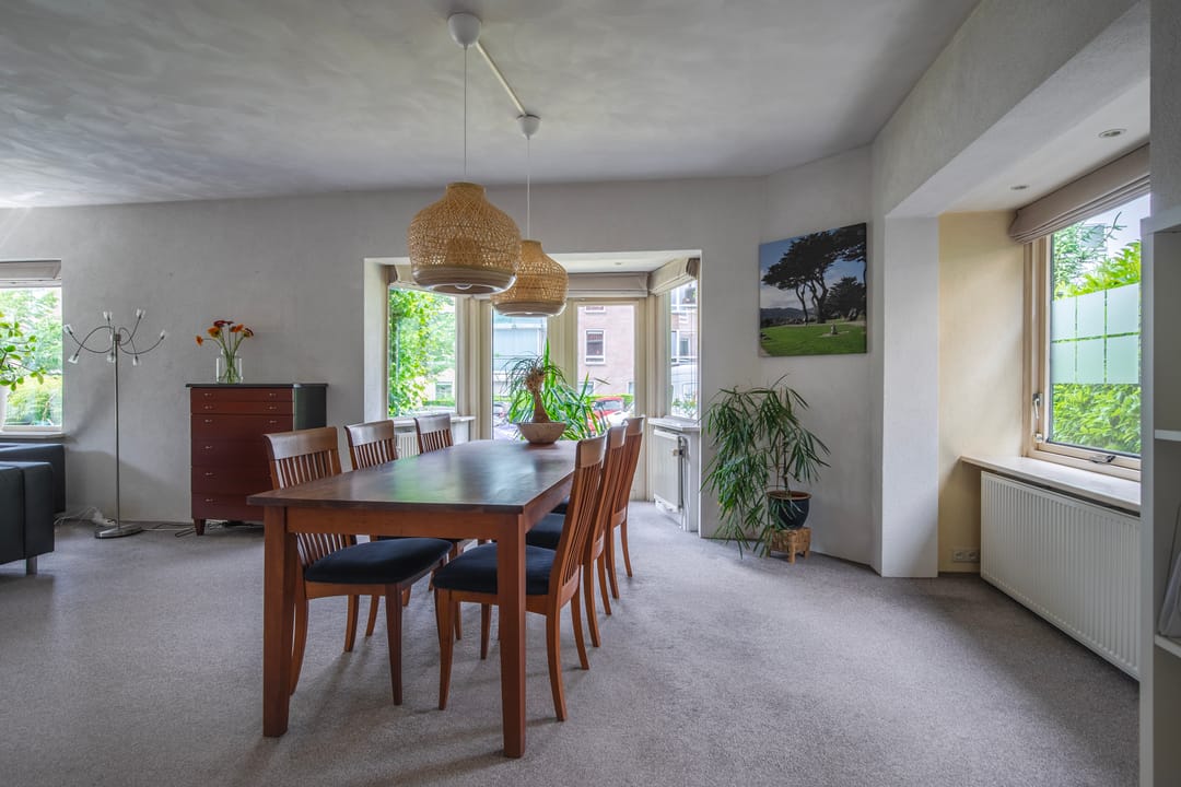 Via de entree betreedt u de voorhal met toiletruimte voorzien van staand toilet en fonteintje. Via de hal bereikt u de trap naar de eerste etage en de royale woonkamer, die zich uitstrekt over de volledige breedte van de woning. De ruimte beschikt over twee charmante erkers – aan de voorzijde en de zijkant – en is uitgerust met airconditioning. Aansluitend bevindt zich de open keuken in hoekopstelling, compleet uitgerust met diverse inbouwapparatuur, vaste kasten en een trap naar de kelder.