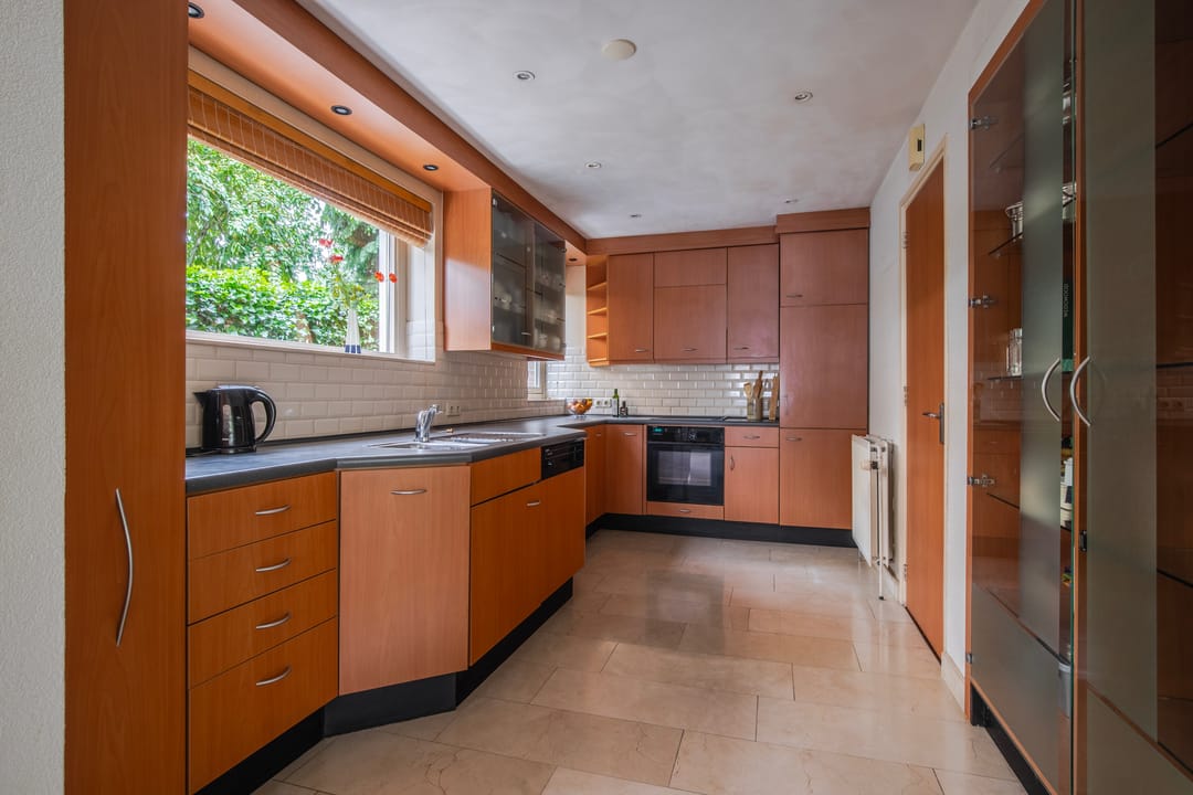 De eerste verdieping van het aangebouwde deel beschikt over een overloop met toegang tot een separate toiletruimte, een ruime slaapkamer met vaste bergkast, en een praktische bijkeuken voorzien van een functioneel keukenblok.