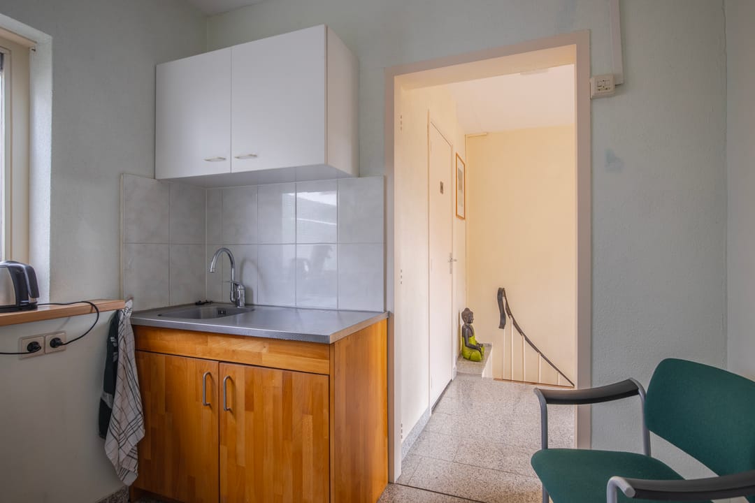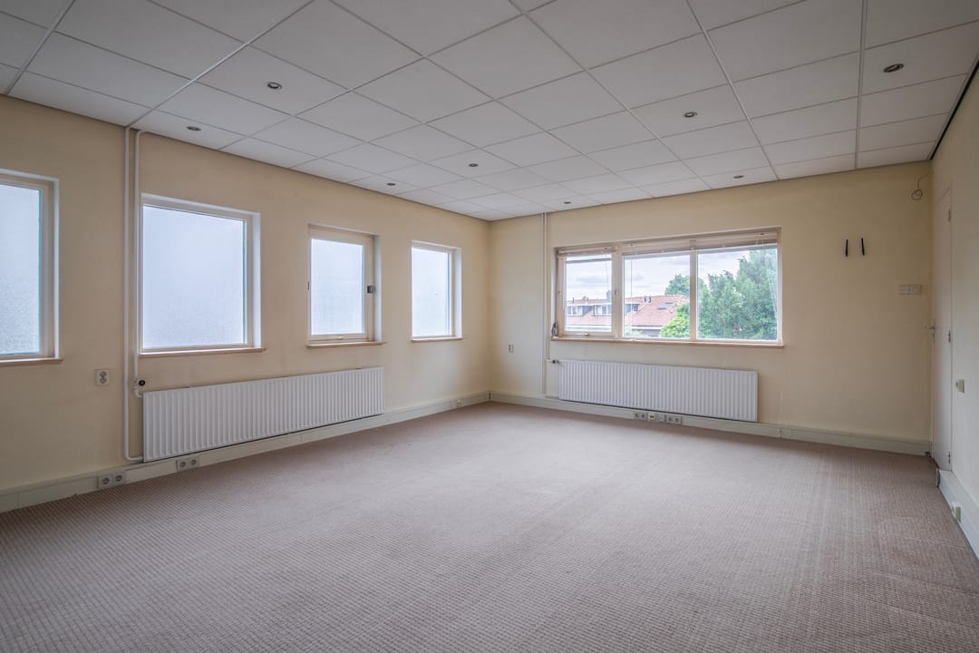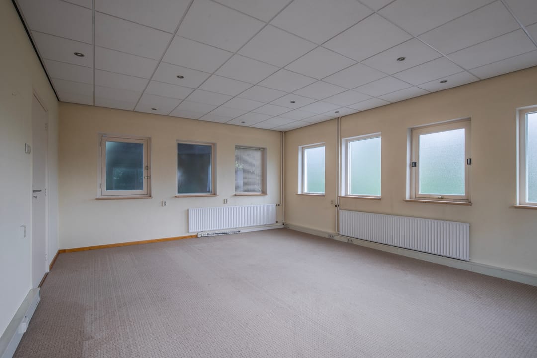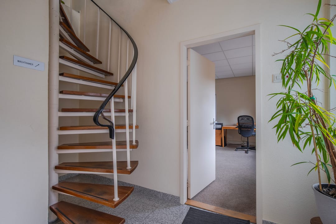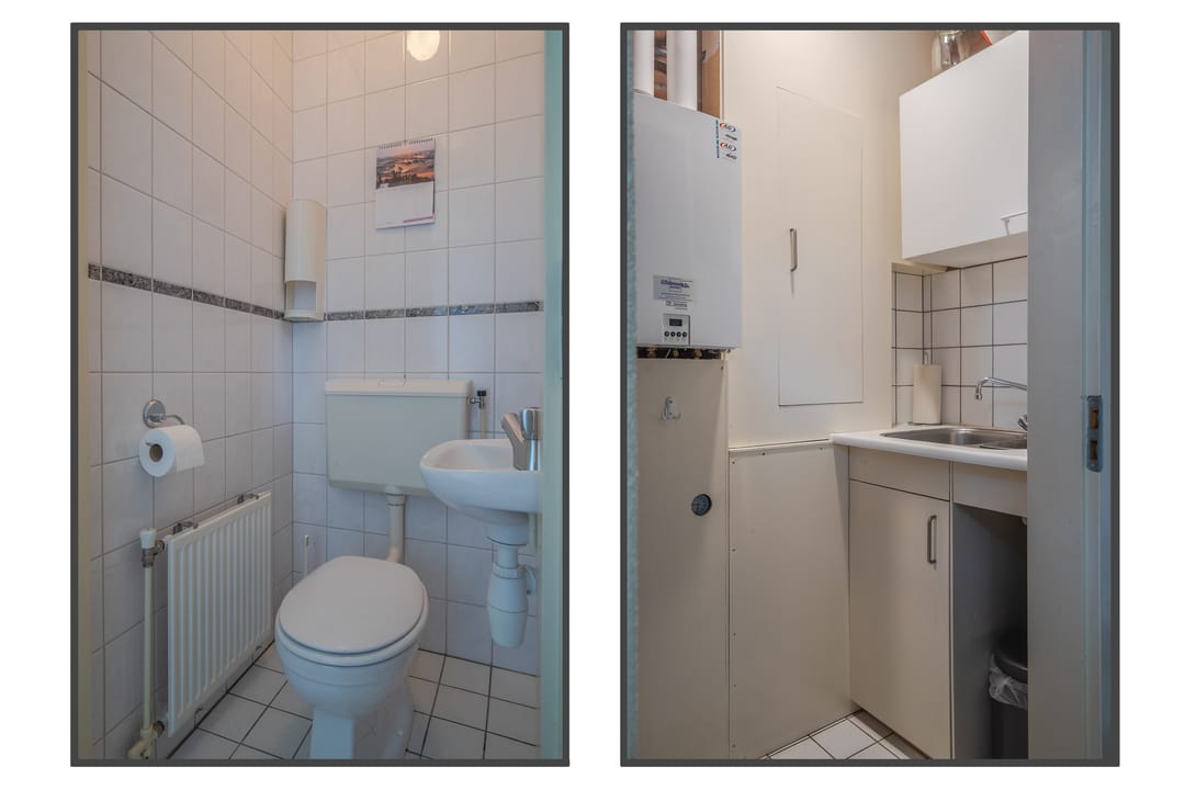 Entree, hal met toegang tot drie goed bemeten kantoorruimtes. Tweede hal met toiletruimte en CV ruimte met wastafel.