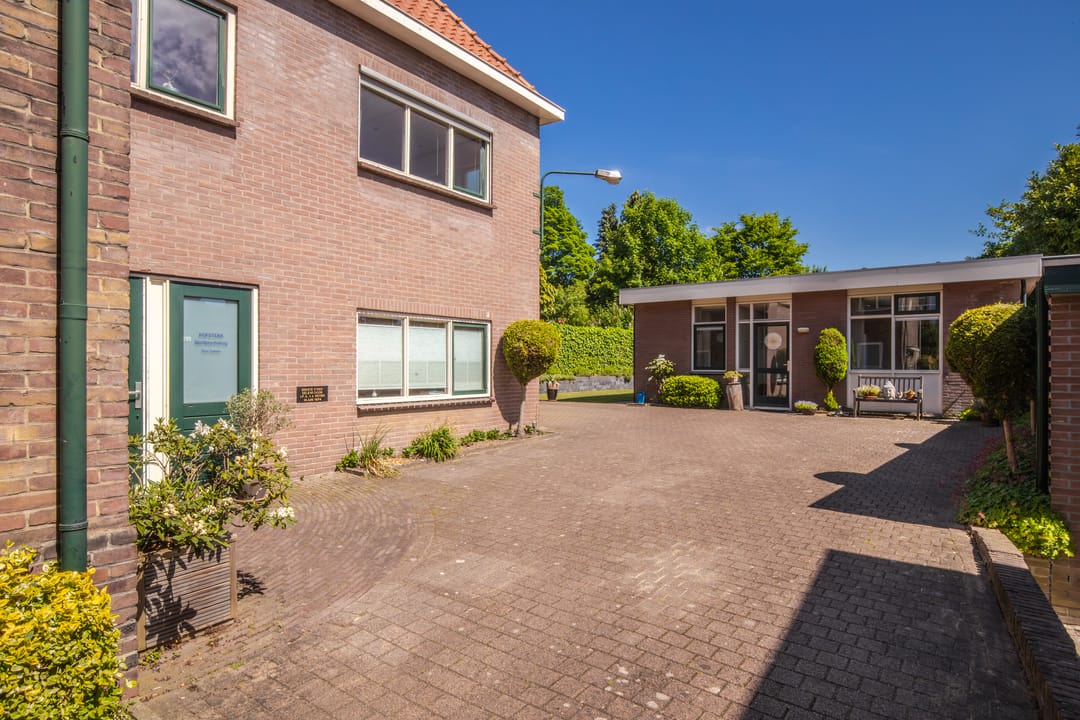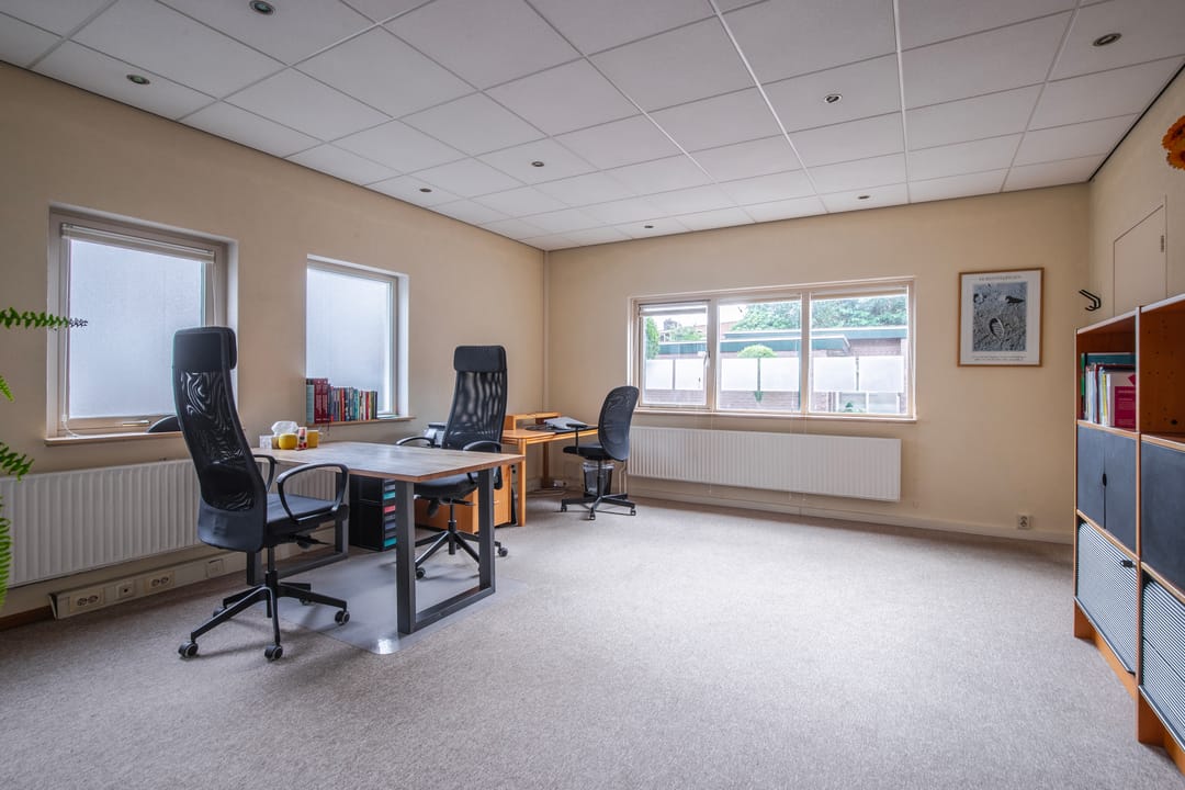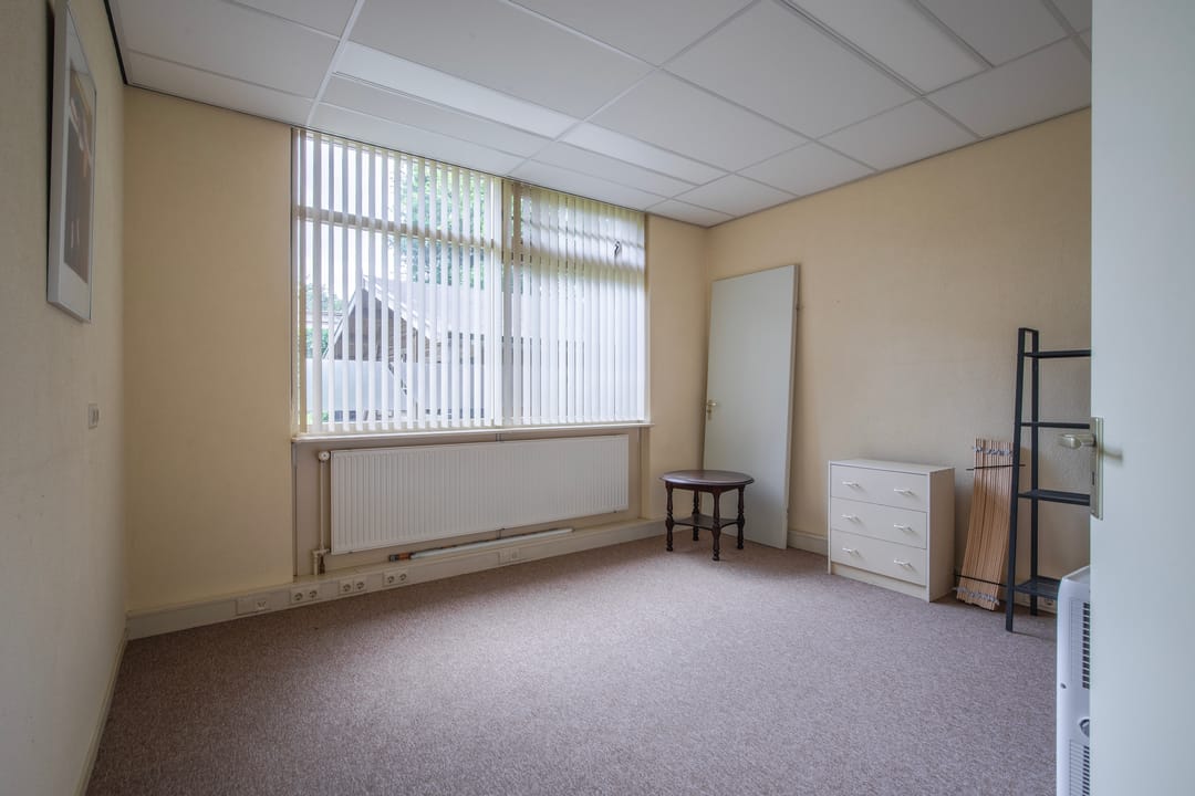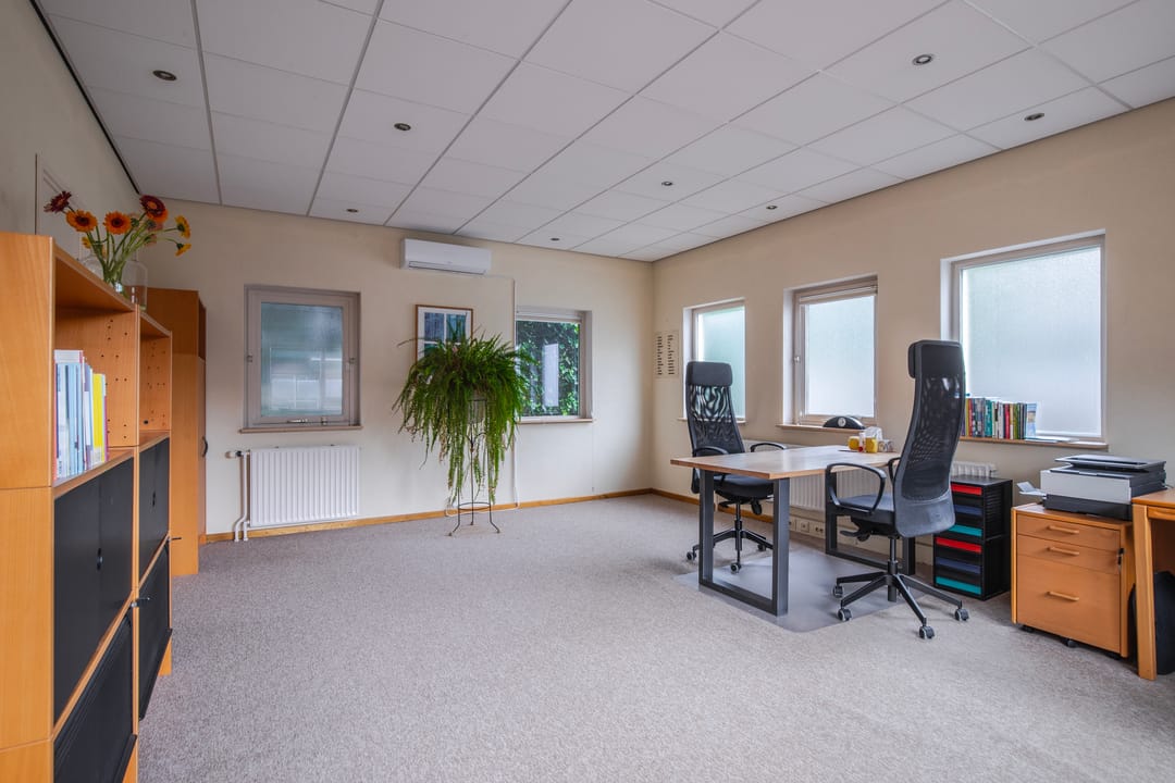 Aan de achterzijde van de woning bevindt zich een aangebouwd gedeelte met een eigen opgang vanaf de oprit. Hier komt u binnen in een hal met wenteltrap naar de verdieping. Deze ruimte is flexibel in gebruik en momenteel ingericht als royale kantoorruimte met bergkast, maar biedt tal van mogelijkheden. Er bestaat bovendien een uitstekende optie om deze verdieping te verbinden met de begane grond van het oorspronkelijke woonhuis.