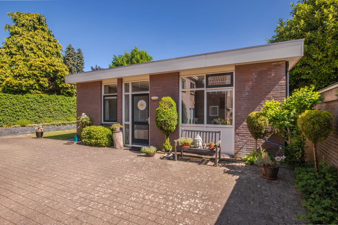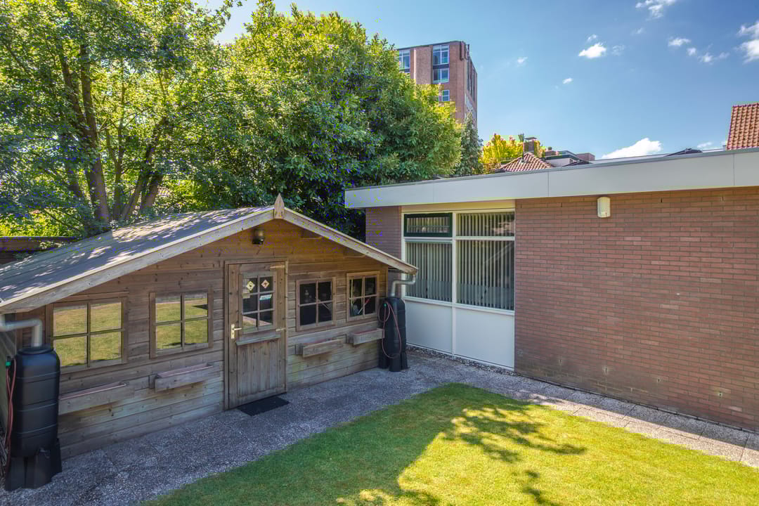 Het perceel is uitzonderlijk ruim en biedt een groene voortuin met een verzorgd gazon en gevarieerd ingerichte borders. De oprit leidt naar het achtergelegen bijgebouw en de praktijkruimte, waar ruim voldoende parkeergelegenheid is. De achtertuin is eveneens fraai aangelegd met een gazon, kleurrijke borders, een verhoogd terras, en charmant tuinhuis. De gehele buitenruimte wordt omheind door een groene haag.