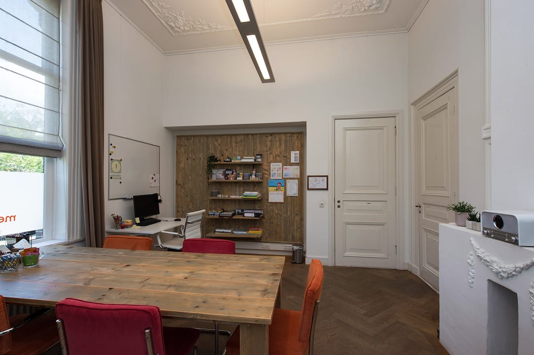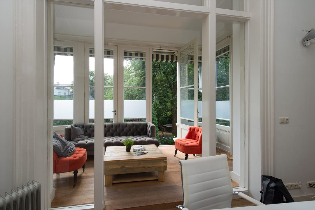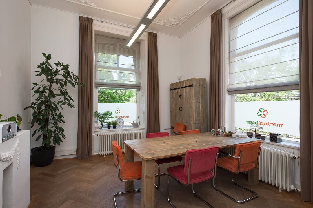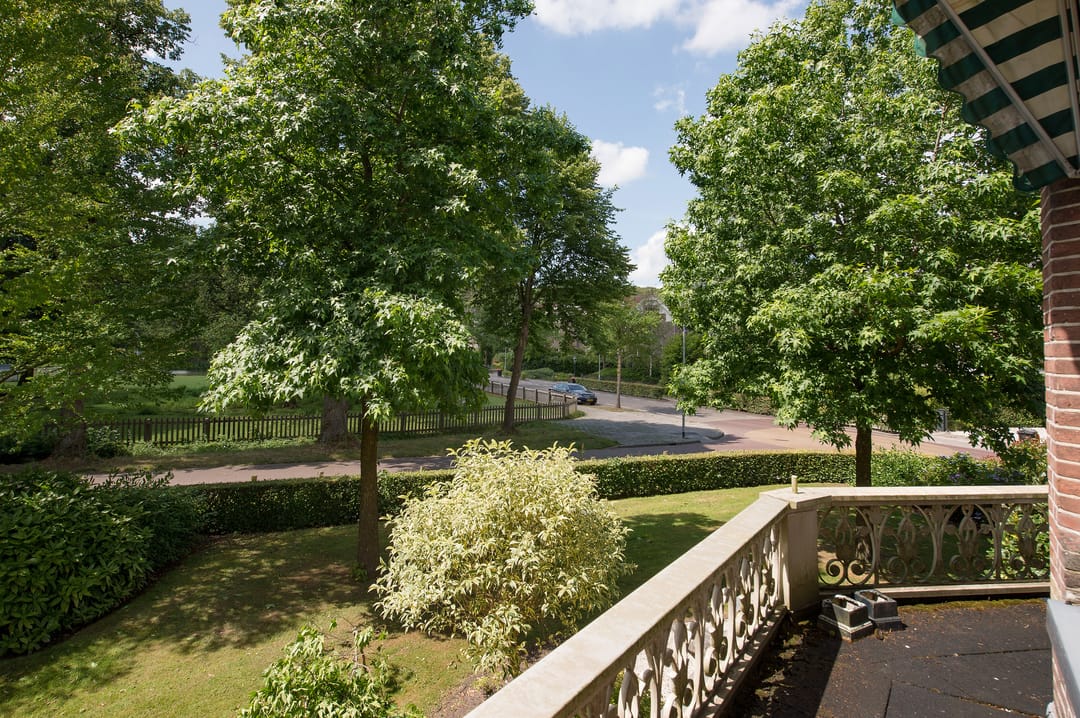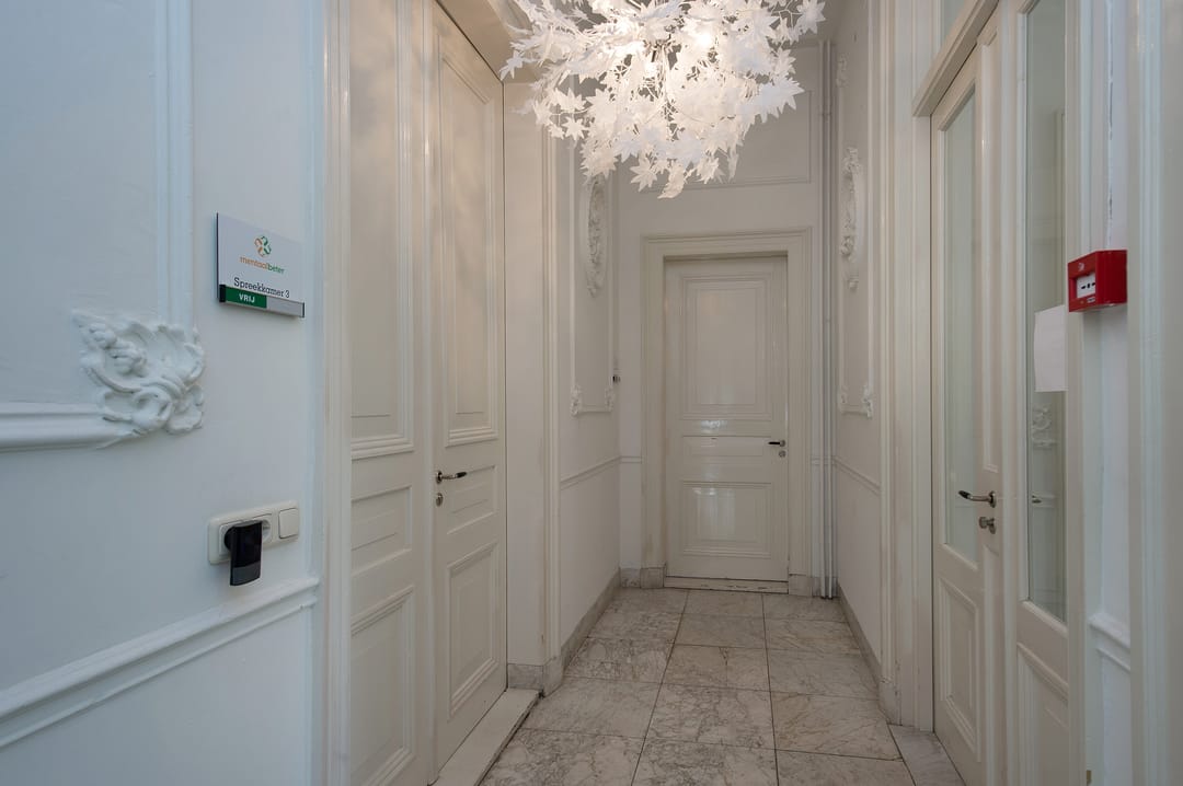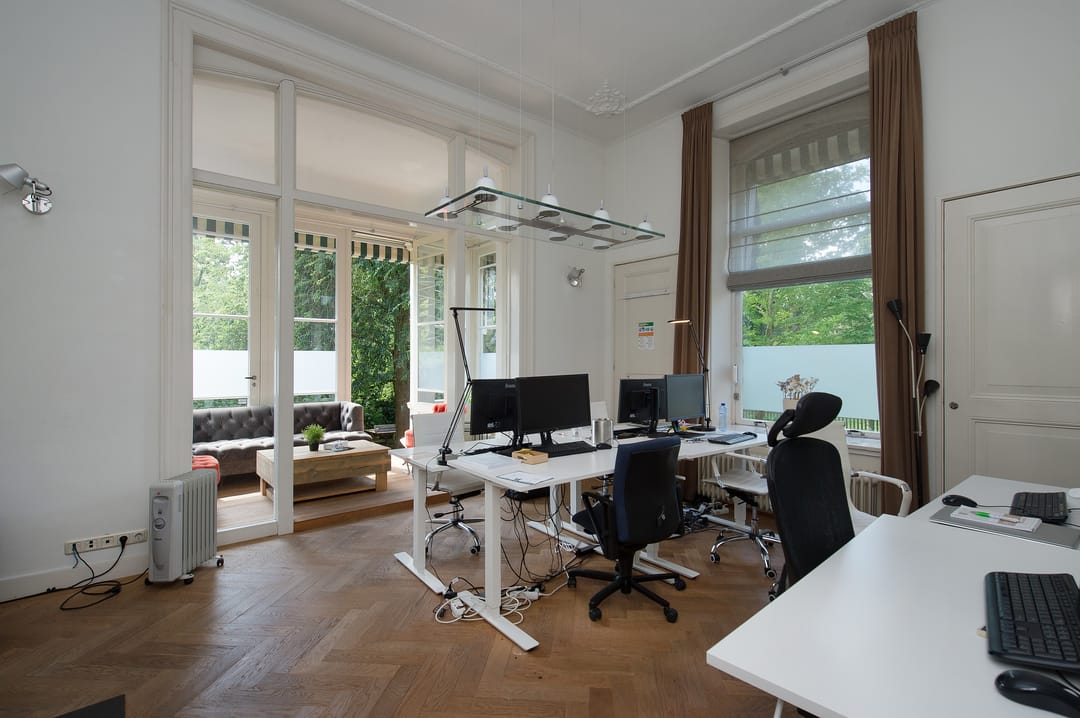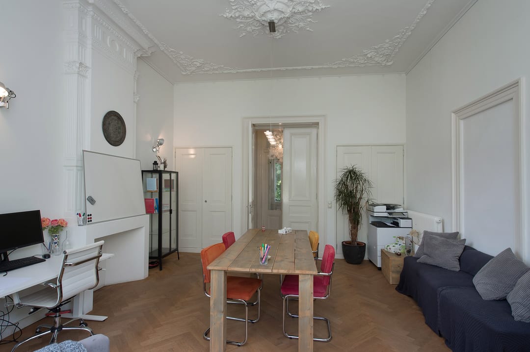 • Begane grond ca. 120 m² VVO Representatieve vestibule en hal met hoge plafonds en karakteristieke details; groot kantoor met balkon via openslaande deuren; kamers voorzien van visgraat eiken vloer en databekabeling; zicht op de Hertenkamp.