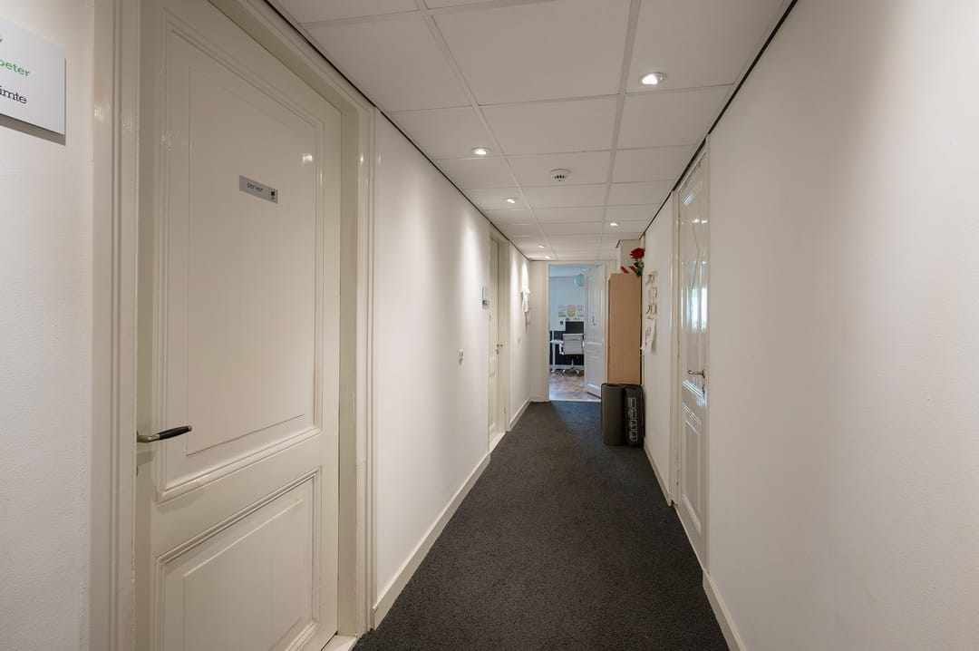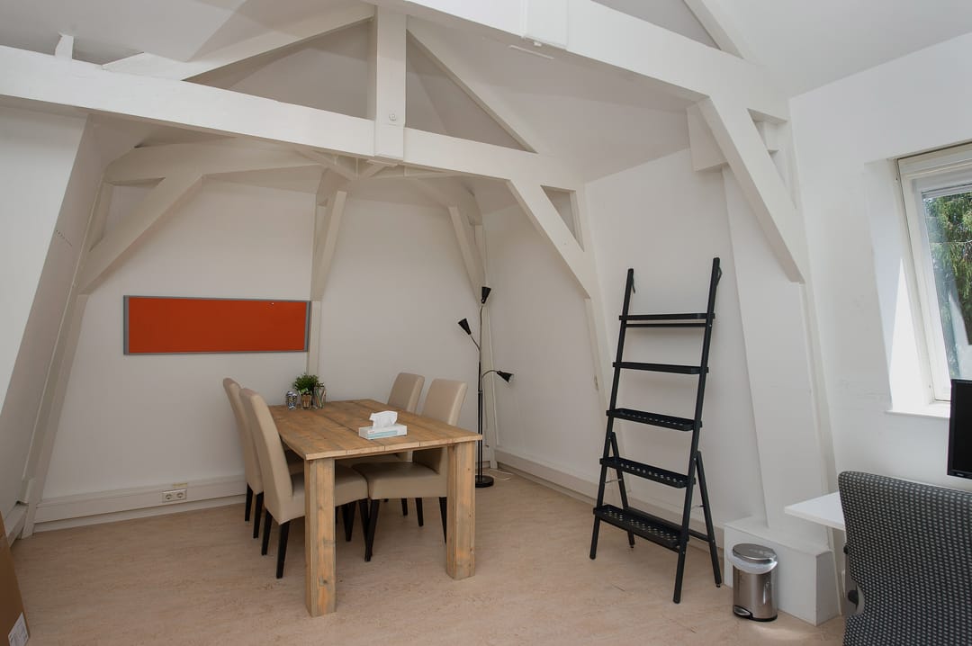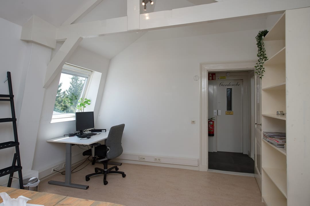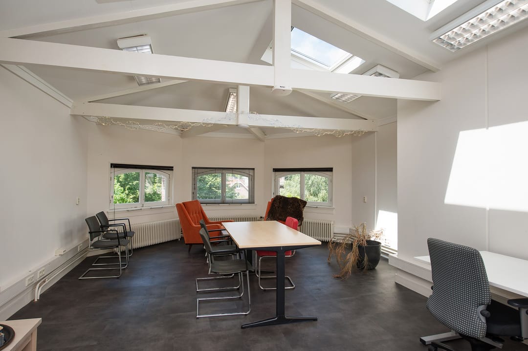 • Tweede verdieping ca. 65 m² VVO Overloop, 2 kantoren; grootste ruimte met veel daglicht (gevel- en dakramen) en zichtbare originele dakspanten.