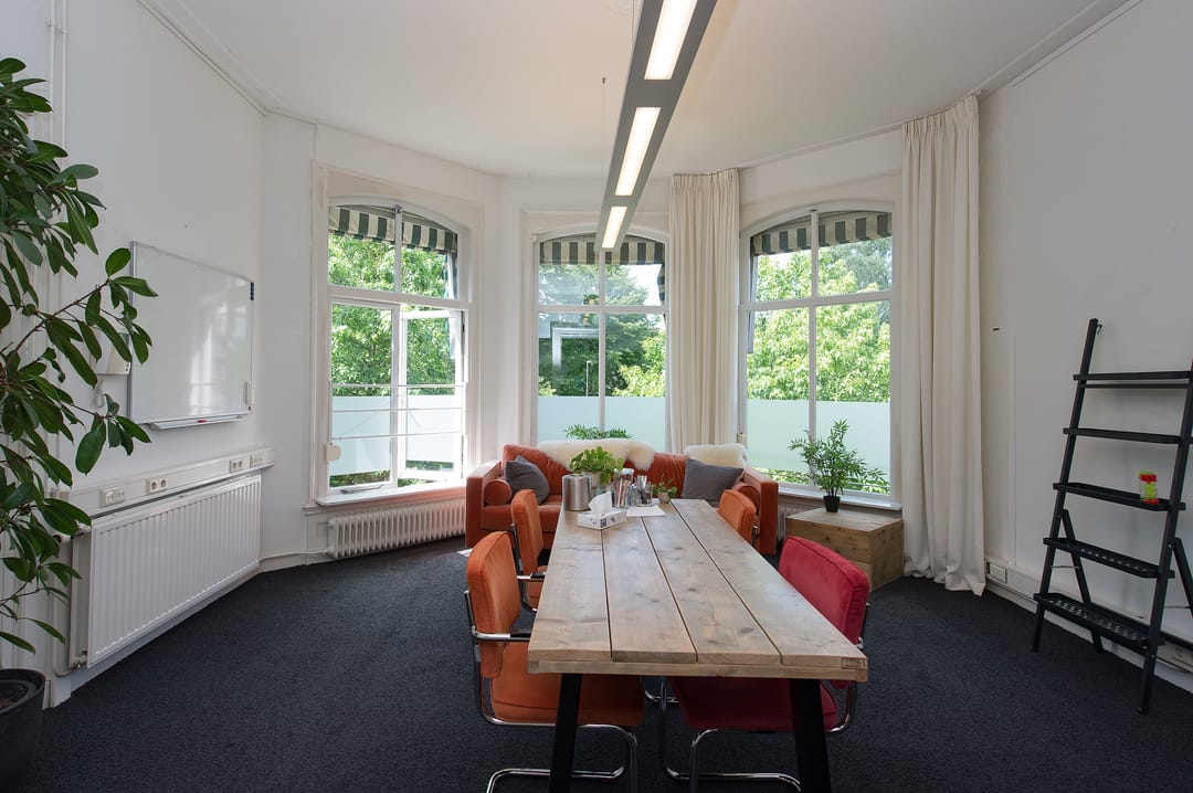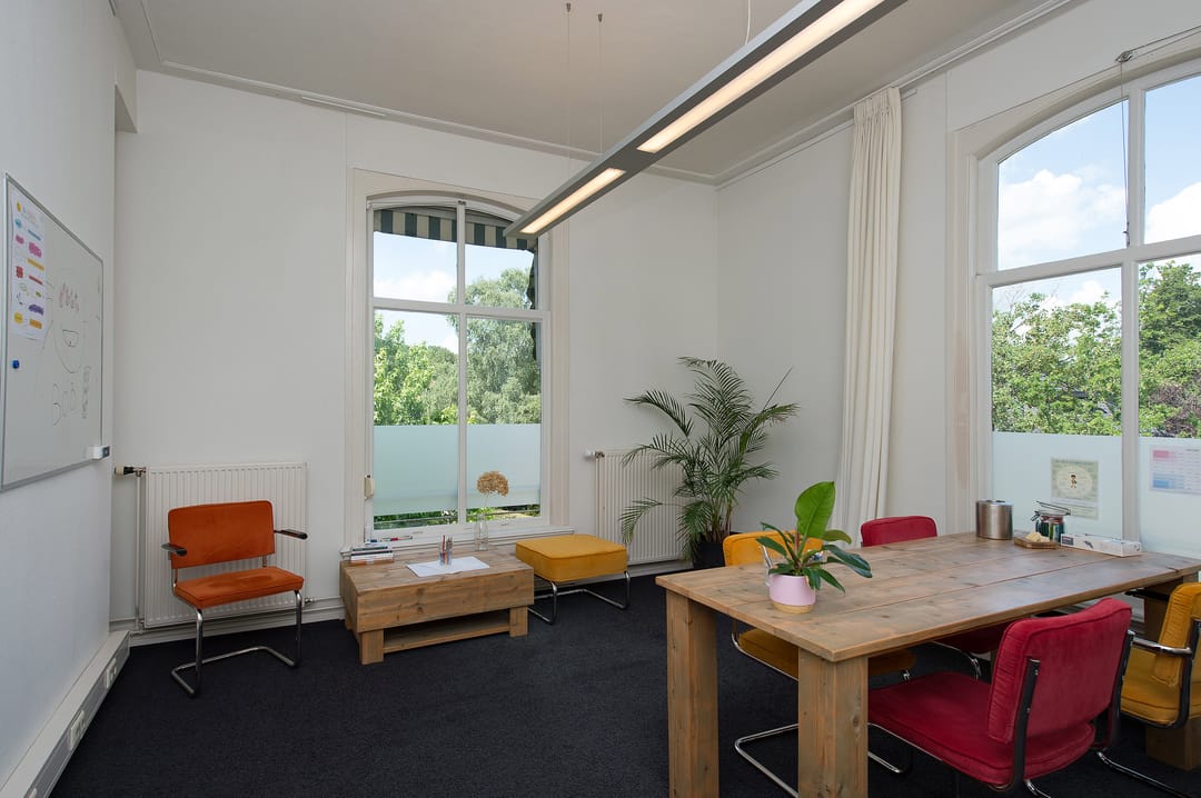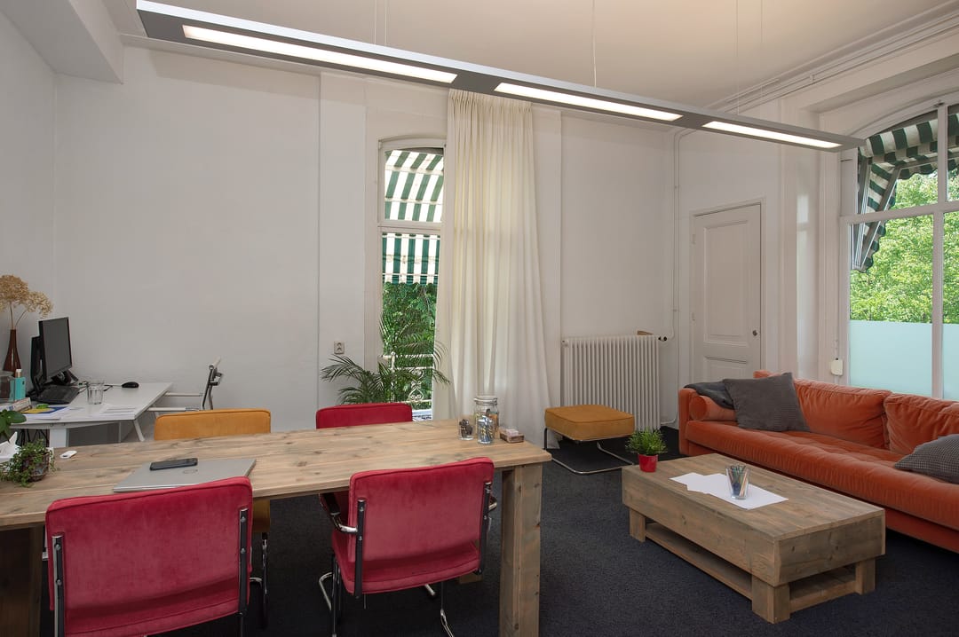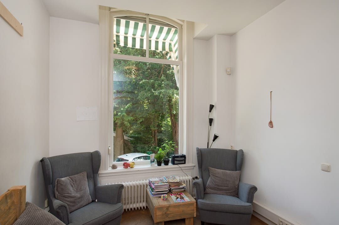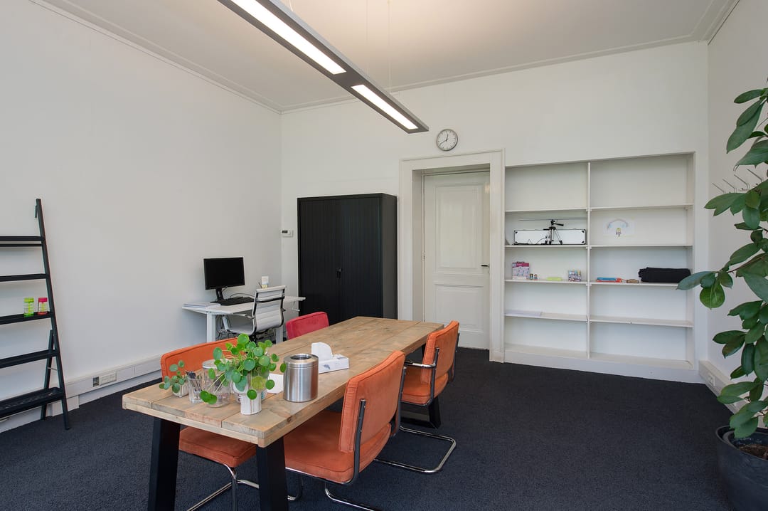 • Tweede verdieping ca. 65 m² VVO Overloop, 2 kantoren; grootste ruimte met veel daglicht (gevel- en dakramen) en zichtbare originele dakspanten.
