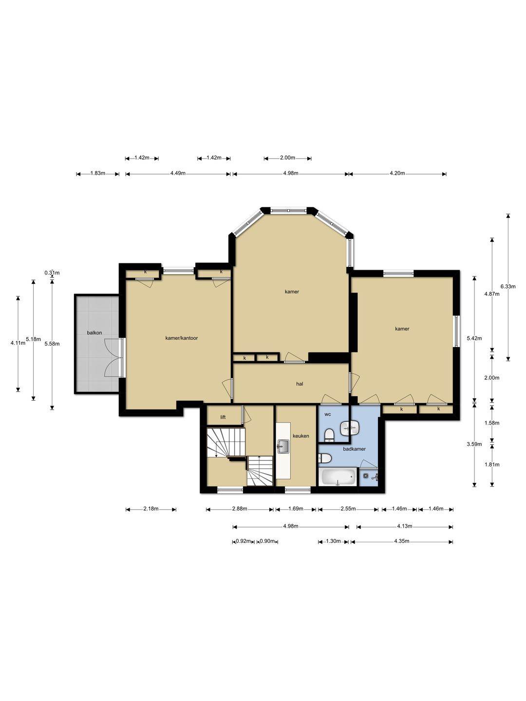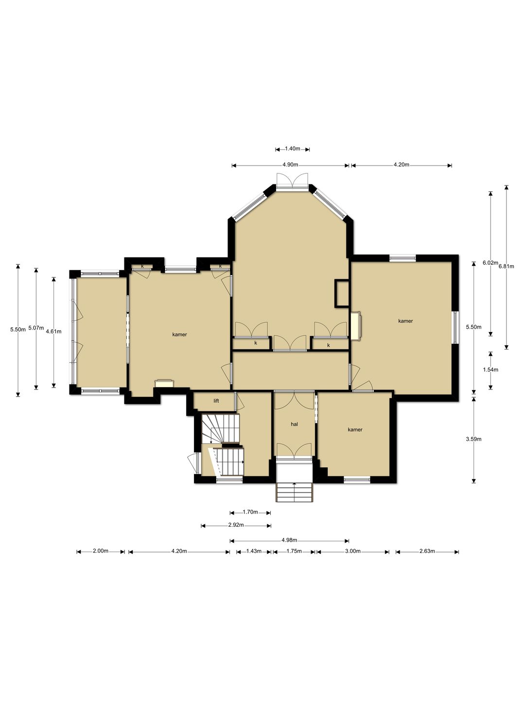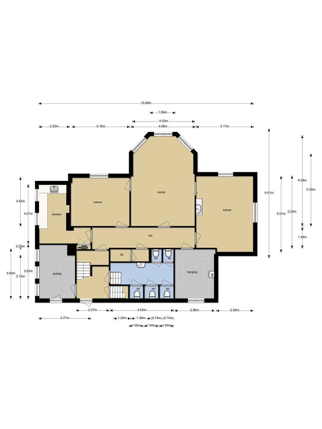 • Souterrain ca. 140 m² VVO Royale hoogte met daglicht op maaiveldniveau; toiletgroep (5 toiletten), 2 ruime kamers, patchruimte, pantry, berging en toegang tot de lift.