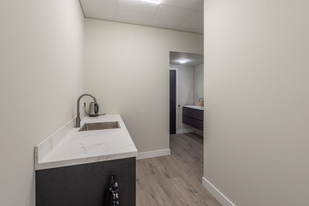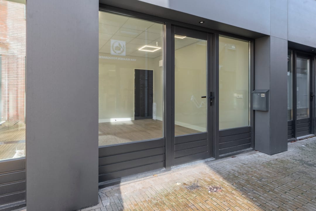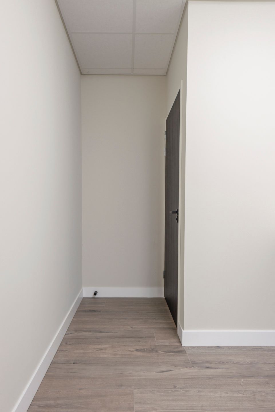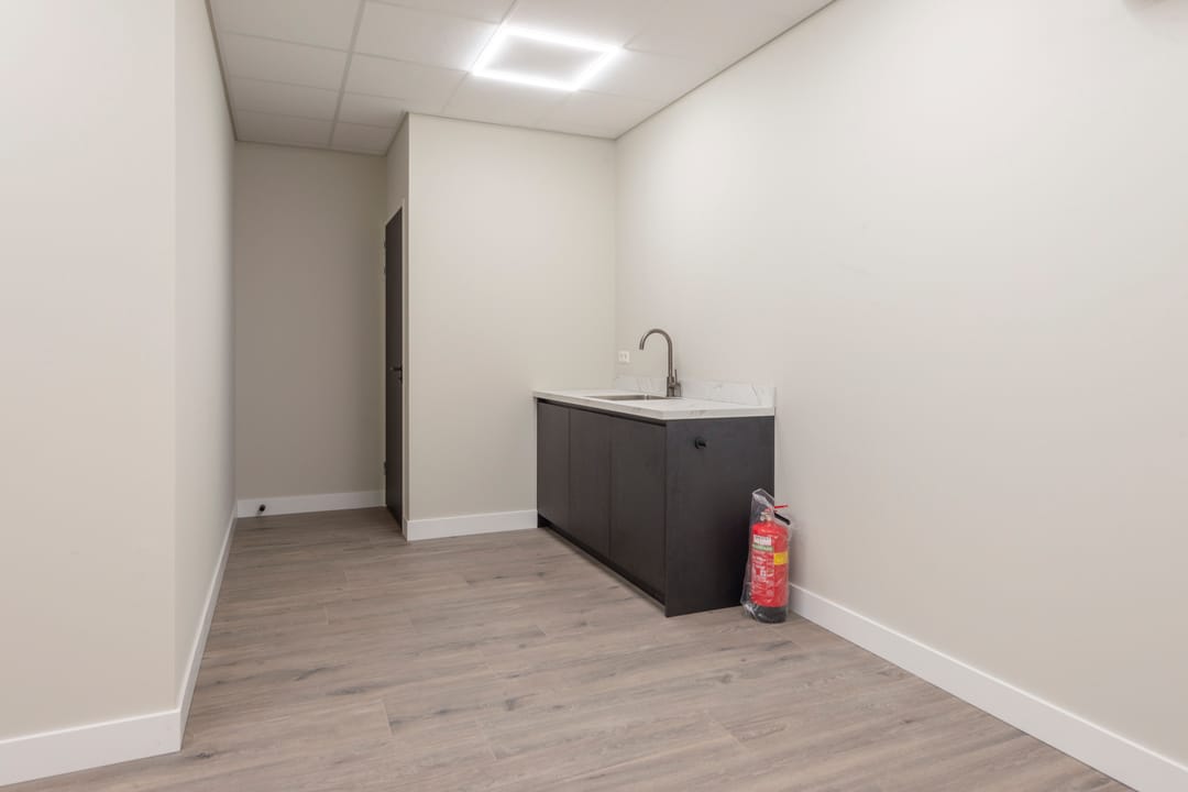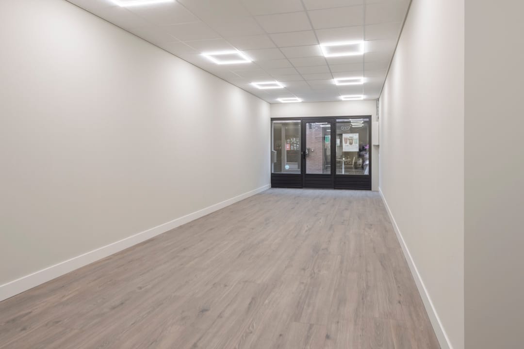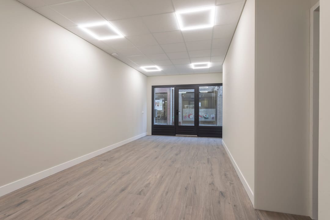 Aan de straatzijde liggen de kantoorkamers, direct aan de voorgevel met veel lichtinval. Daarachter bevindt zich de algemene ruimte met een pantry en doorgang naar de sanitaire voorzieningen.