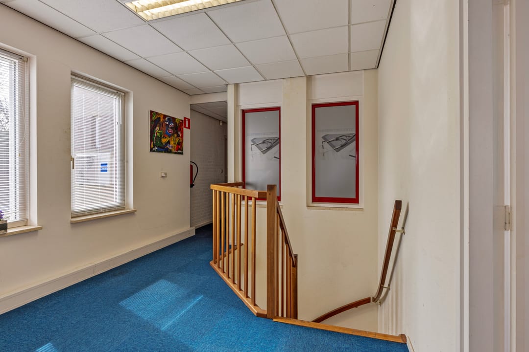 Middels de entree op de begane grond is er toegang tot de gedeelde hal, via een trap is de eerste verdieping bereikbaar. De gehele eerste verdieping wordt te huur aangeboden. Op deze verdieping zijn in totaal 4 kantoorruimtes en één toilet gelegen.