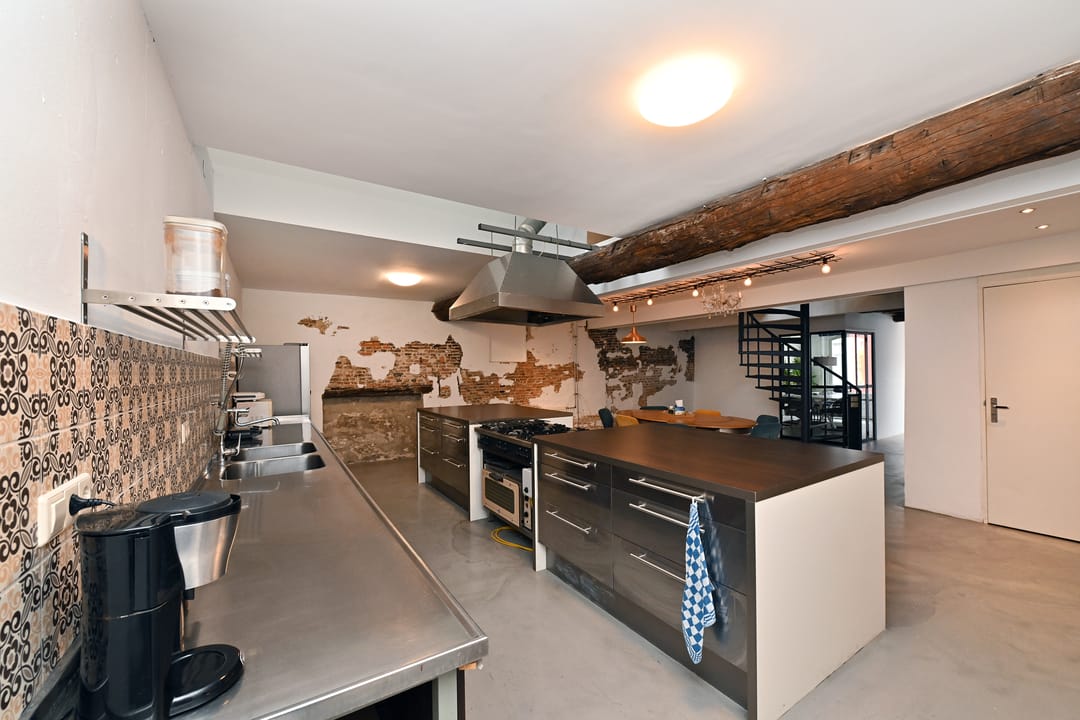 Open keuken aan achterzijde met rechte opstelling én kookeiland, voorzien van 6-pits gasfornuis, oven, vaatwasser, afzuigkap in schouwmodel en robuuste metselwerkdetails