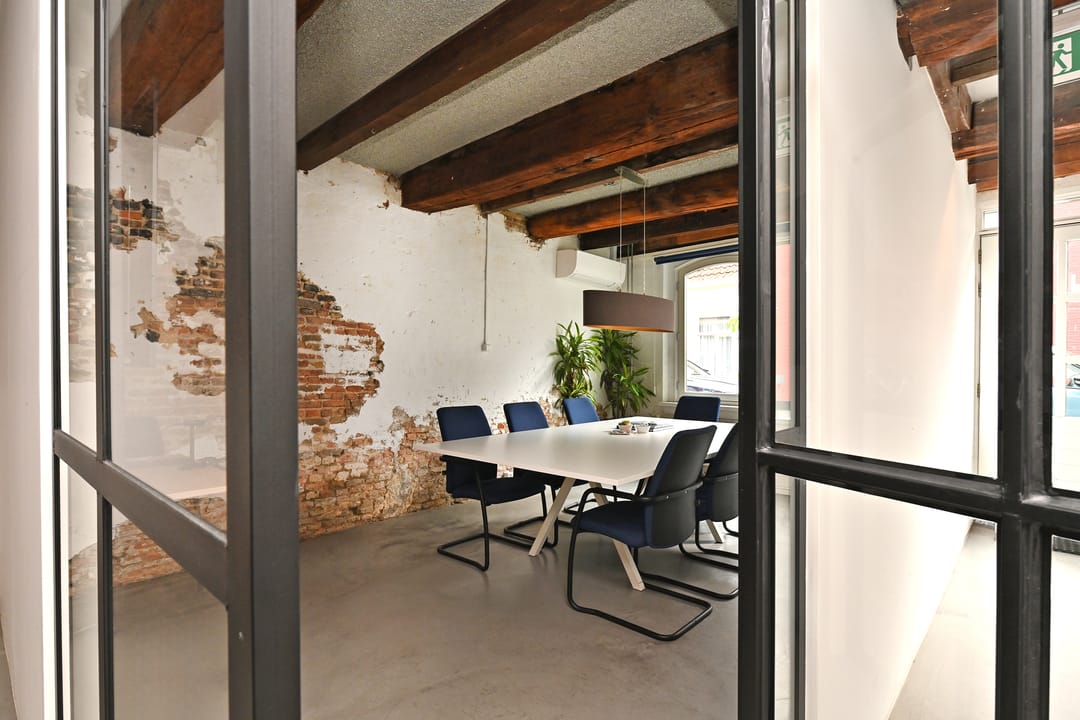 Grote open ruimte met airco, open haard (sier- of functioneel), houten balkenplafond, in gebruik als kantoorruimte maar perfect in te richten als woonkamer of teamruimte