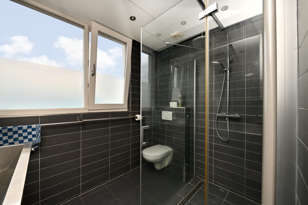 Tweede badkamer met dubbele wastafel, douche en toilet