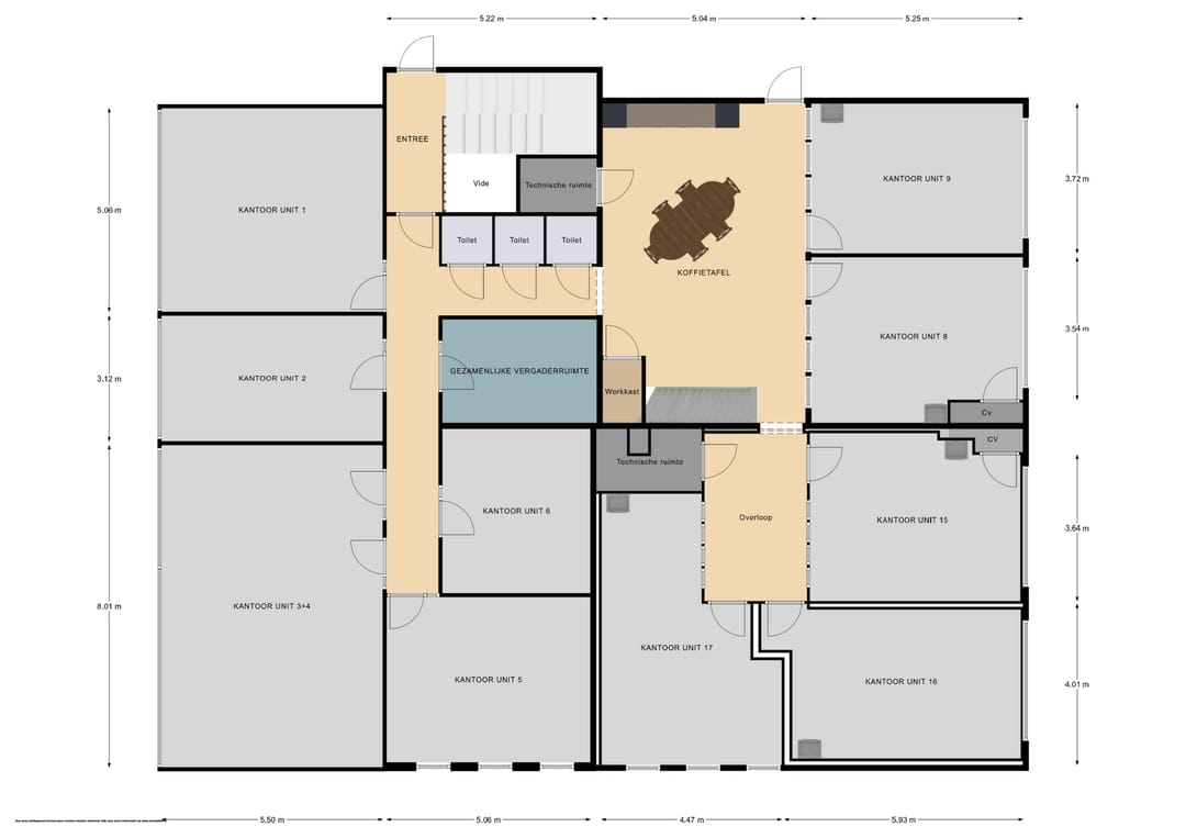 The entrance has a luxurious appearance, has recently been painted and has a beautiful PVC floor. The communal kitchen has recently been renovated and is equipped with a refrigerator, dishwasher and also accommodates the coffee machine. The three toilets are luxurious and have also been recently renovated. The common meeting room can be reserved and used in consultation with the other users.