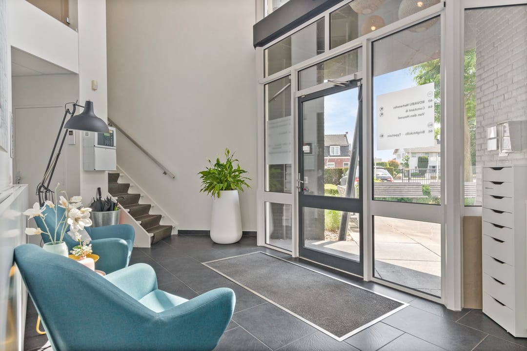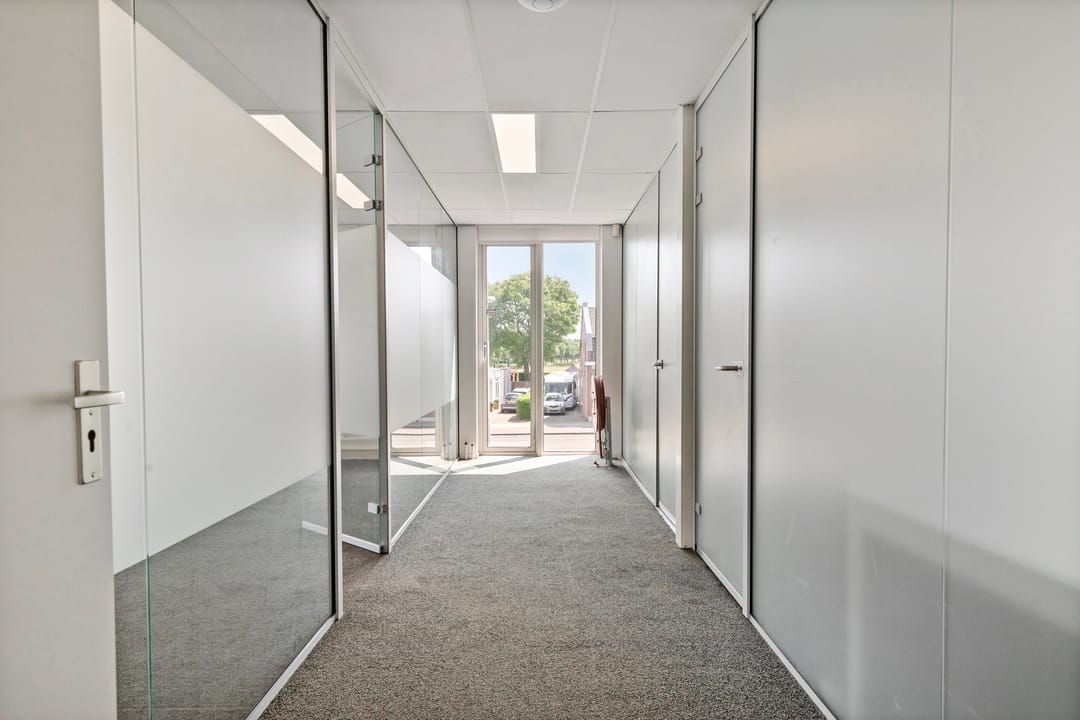 Centrale entree met wachtruimte. Diverse gangen welke toegang geven tot de verschillende kantoorkamers en kantoorvleugels.