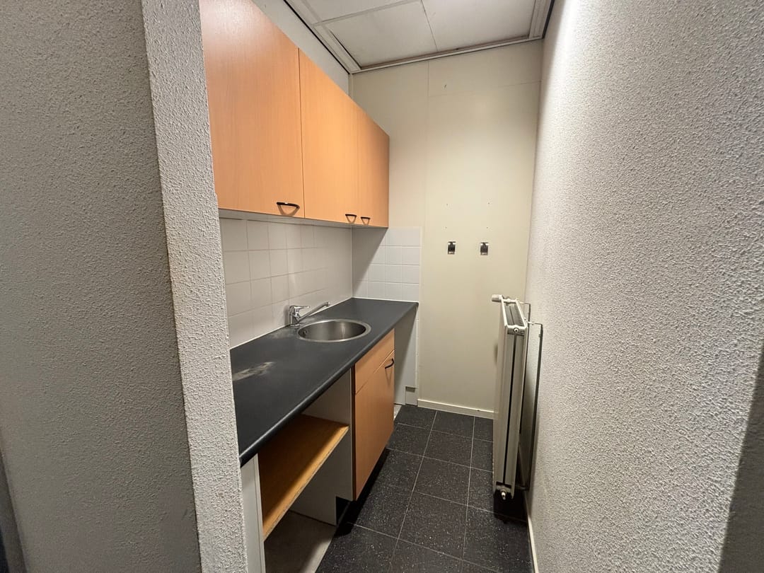Daarnaast is er een spreekkamer, eveneens afgewerkt met vloerbedekking, spuitwerk, systeemwanden en een systeemplafond. Ook deze ruimte beschikt over tl-inbouwarmaturen en airconditioning. Verder zijn er twee toiletgroepen aanwezig, elk voorzien van een wandcloset en een fonteintje. De pantry is ingericht met een keukenblok in wandopstelling, voorzien van een kunststof werkblad, een rvs-spoelbak en diverse bergkasten. Het gebouw is opgetrokken uit steen, heeft een plat dak met bitumineuze dakbedekking en betonnen vloeren. De ramen zijn uitgevoerd met isolerende beglazing in aluminium kozijnen.