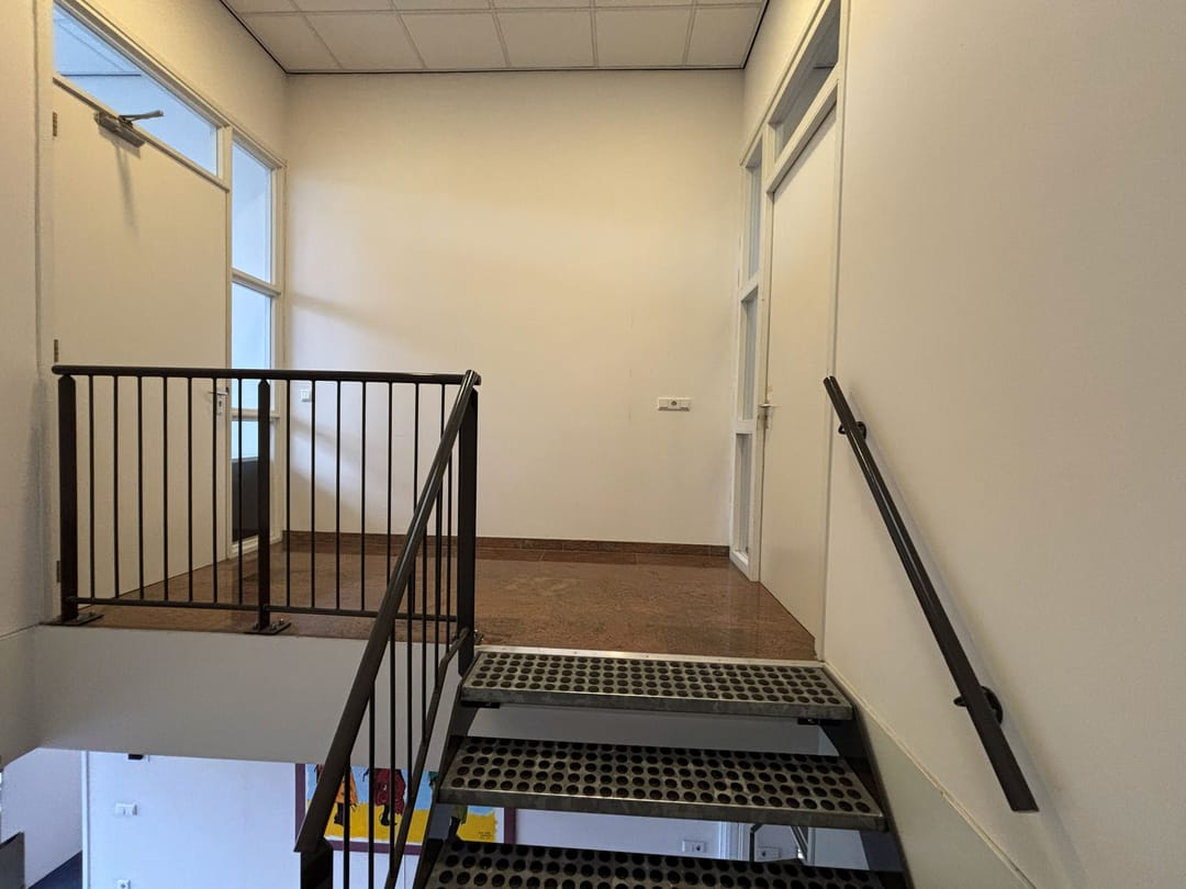 Vanuit de gezamenlijke entree biedt een hal met trapopgang toegang tot de hal op de verdieping. Deze hal geeft toegang tot de 2 kantoorruimten op de verdieping alsmede een gezamenlijke keuken en toiletruimte.