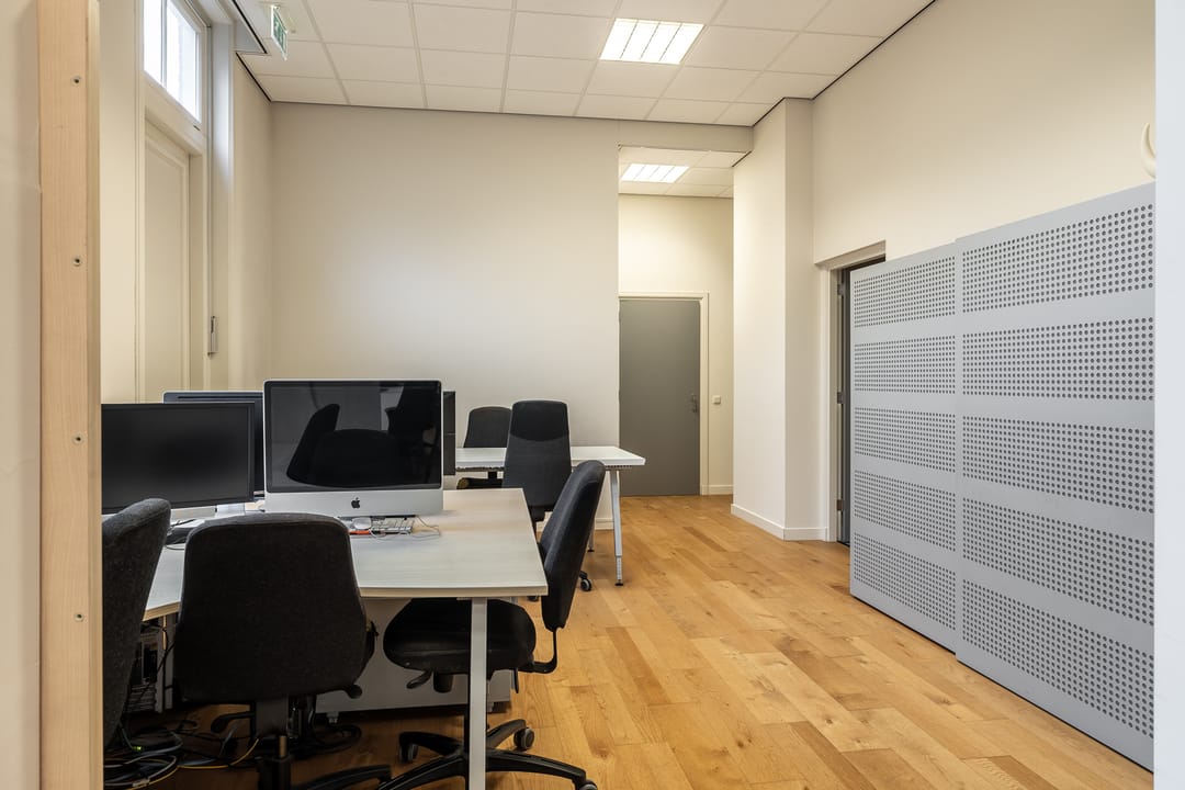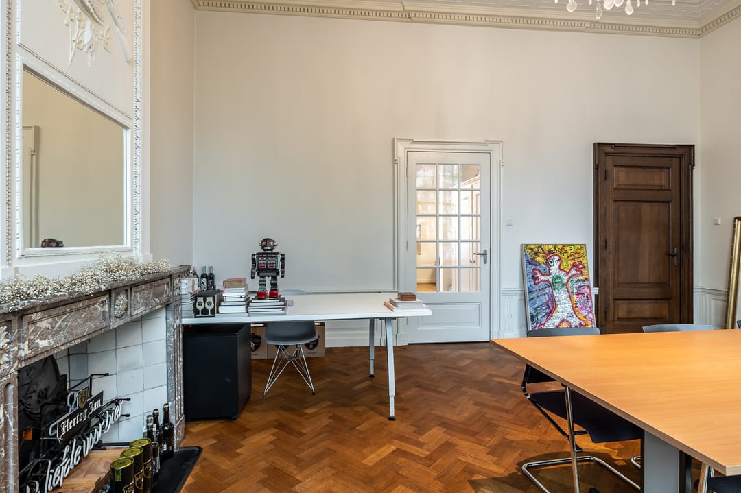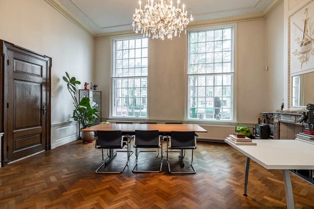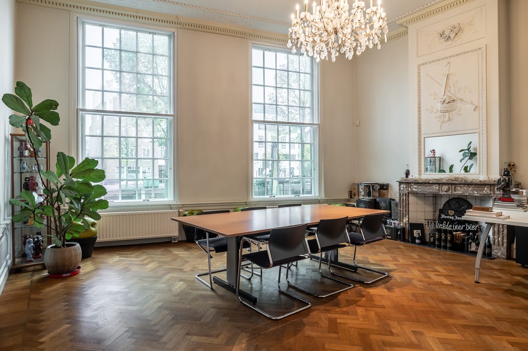De ruimte is bijzonder licht vanwege de grote raampartijen in de zijgevel.