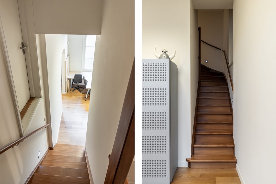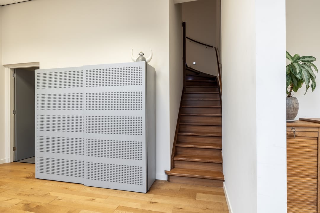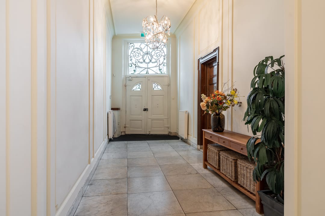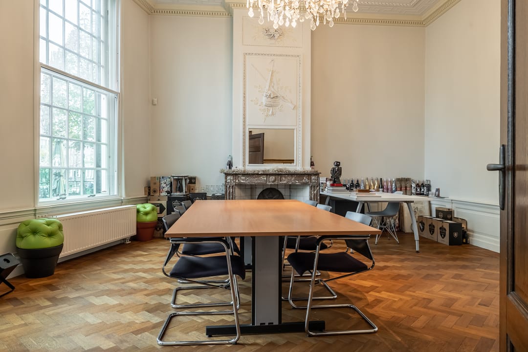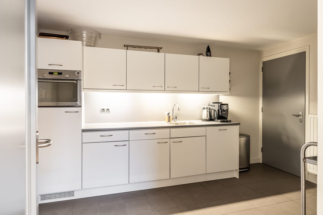 De ruimte is bijzonder licht vanwege de grote raampartijen in de zijgevel.