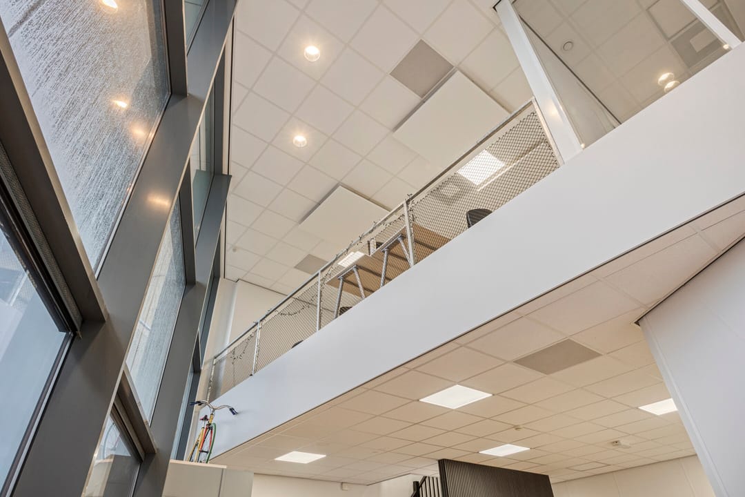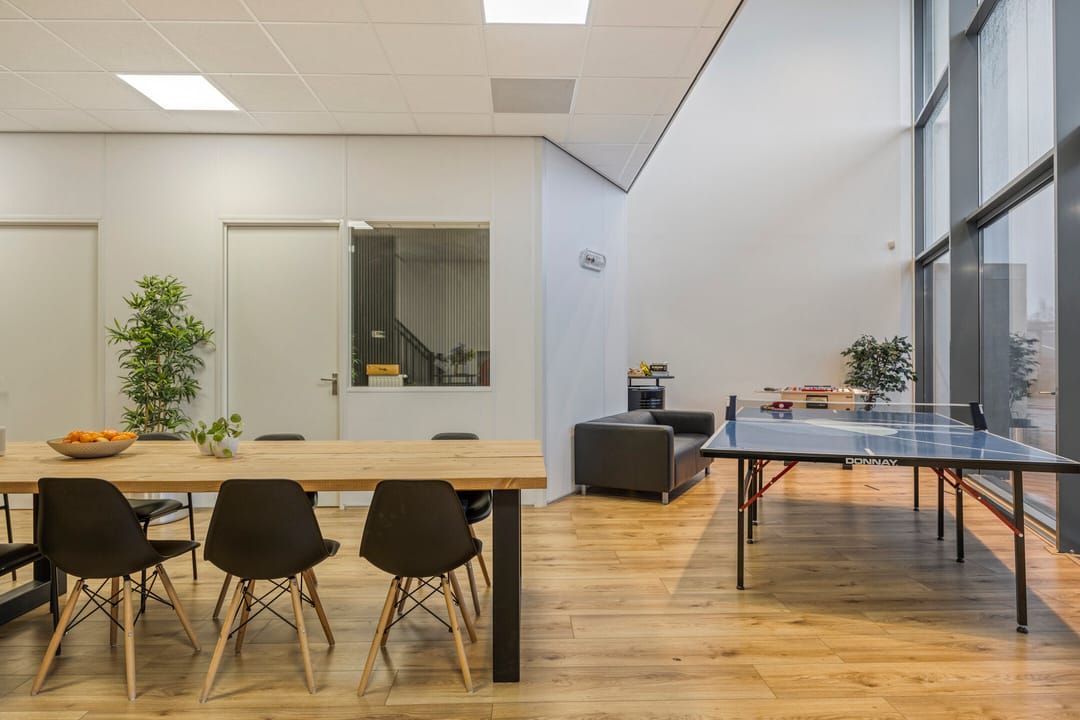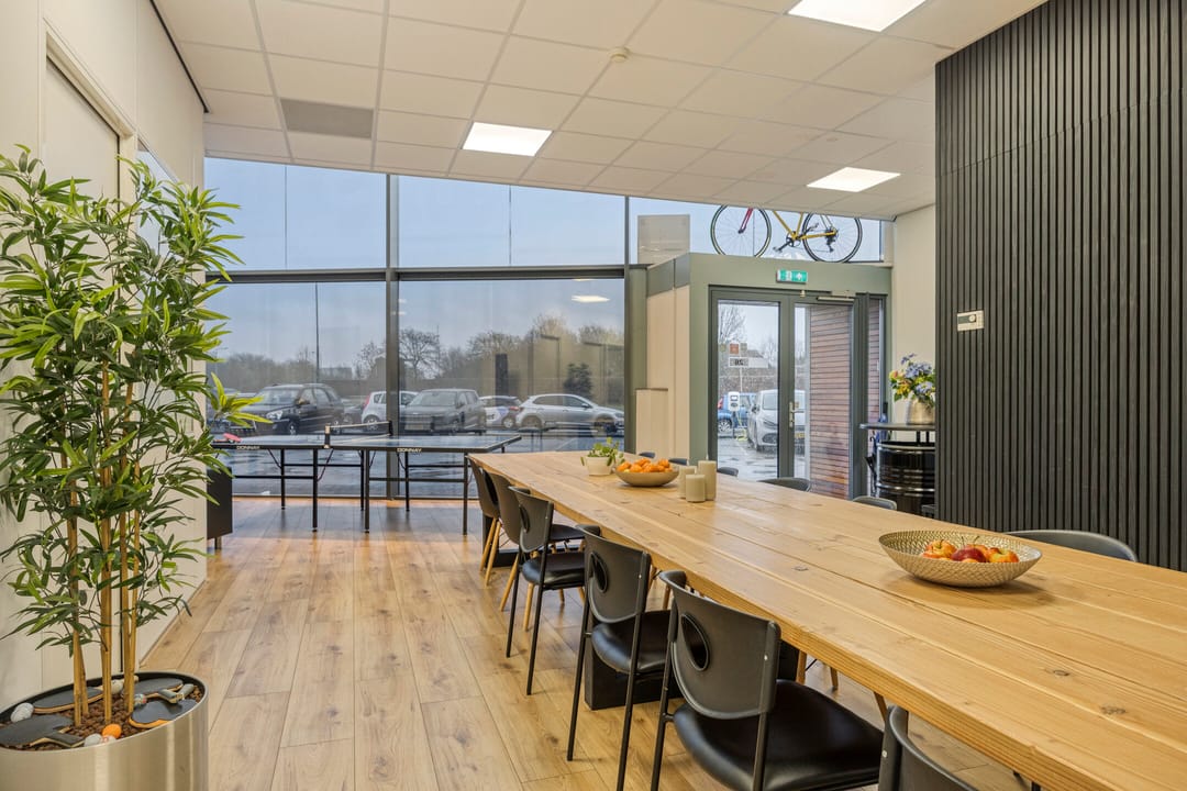 Open ruimte aan de voorzijde met een indrukwekkende glazen pui met een hoogte van 6,5 meter. In het pand is een indeling aangebracht waarbij op de begane grond en op de verdieping een combinatie is van grote open ruimtes en enkele kleinere kantoorkamers. Toiletgroep met dames- en herentoilet, keuken met diverse keukenapparatuur en archiefruimte.