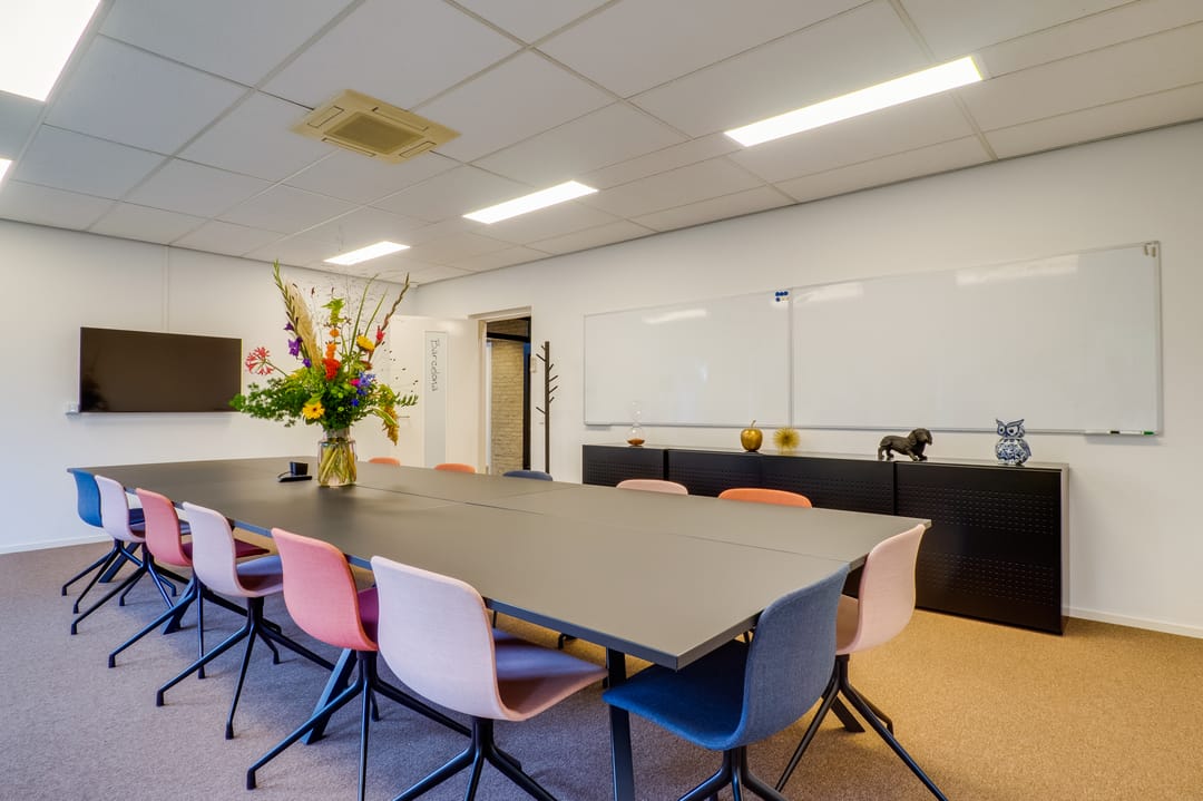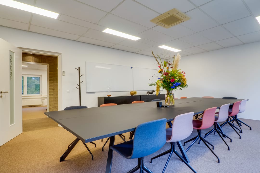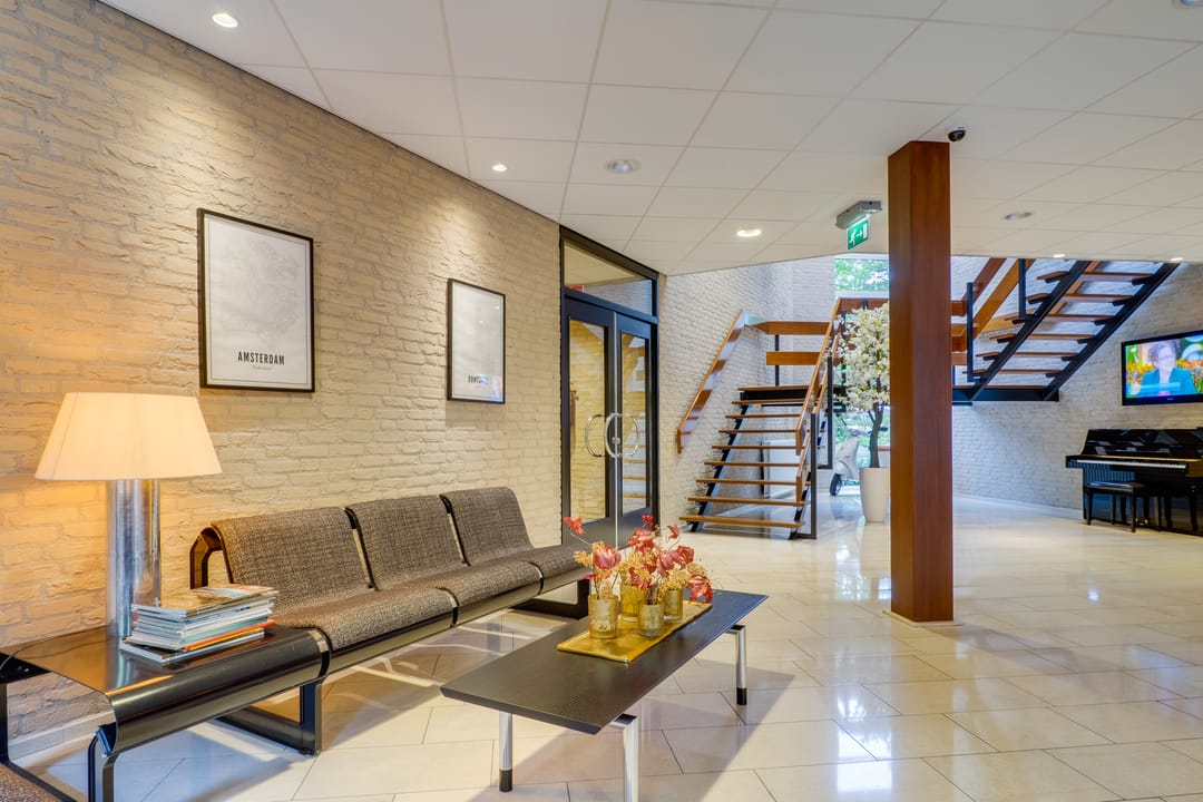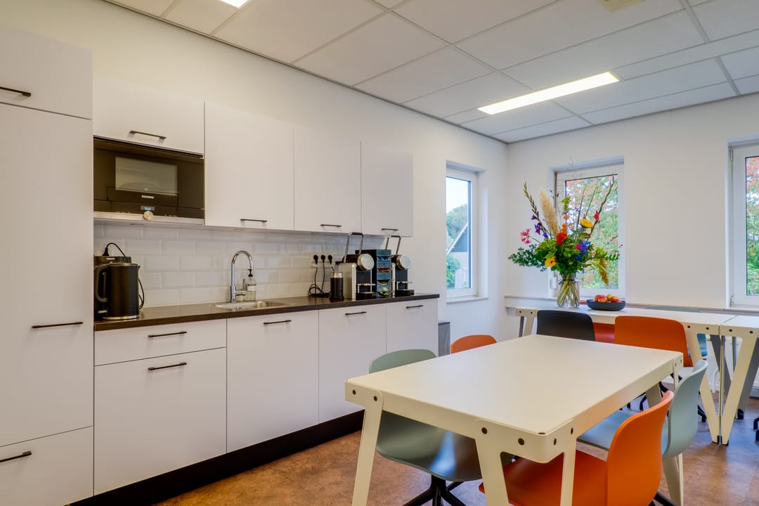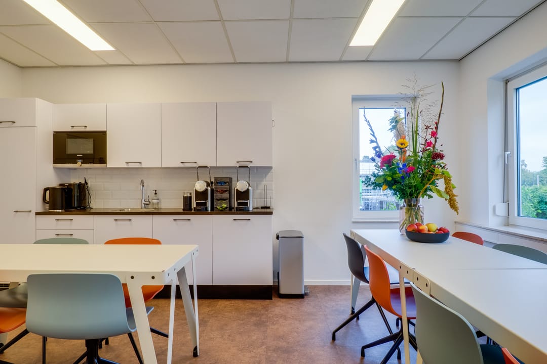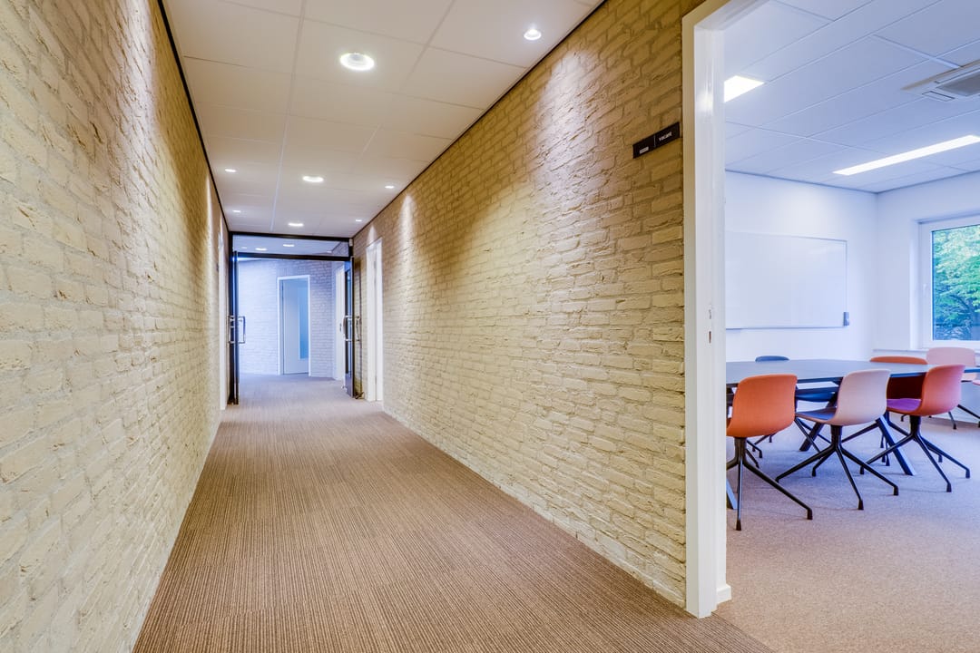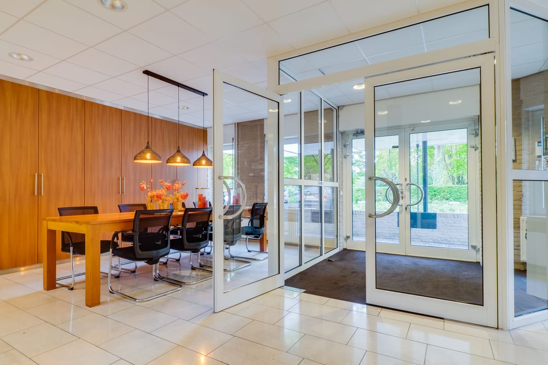 Men komt binnen in een ruime centrale entree met zithoek en leestafel. Hiervandaan is toegang tot de eerste verdieping (links). In de vleugel zijn diverse kantoor-/vergaderkamers van verschillende maten beschikbaar en tevens een eigen lunchruimte met pantry.