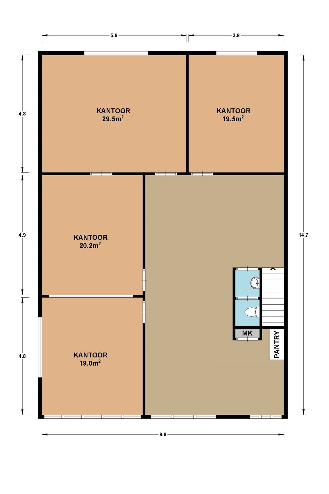 entree met meterkast en opgang, hal, toilet met fontein, centrale ruimte met pantry en 4 royale, in grootte variërende kantoorkamers.