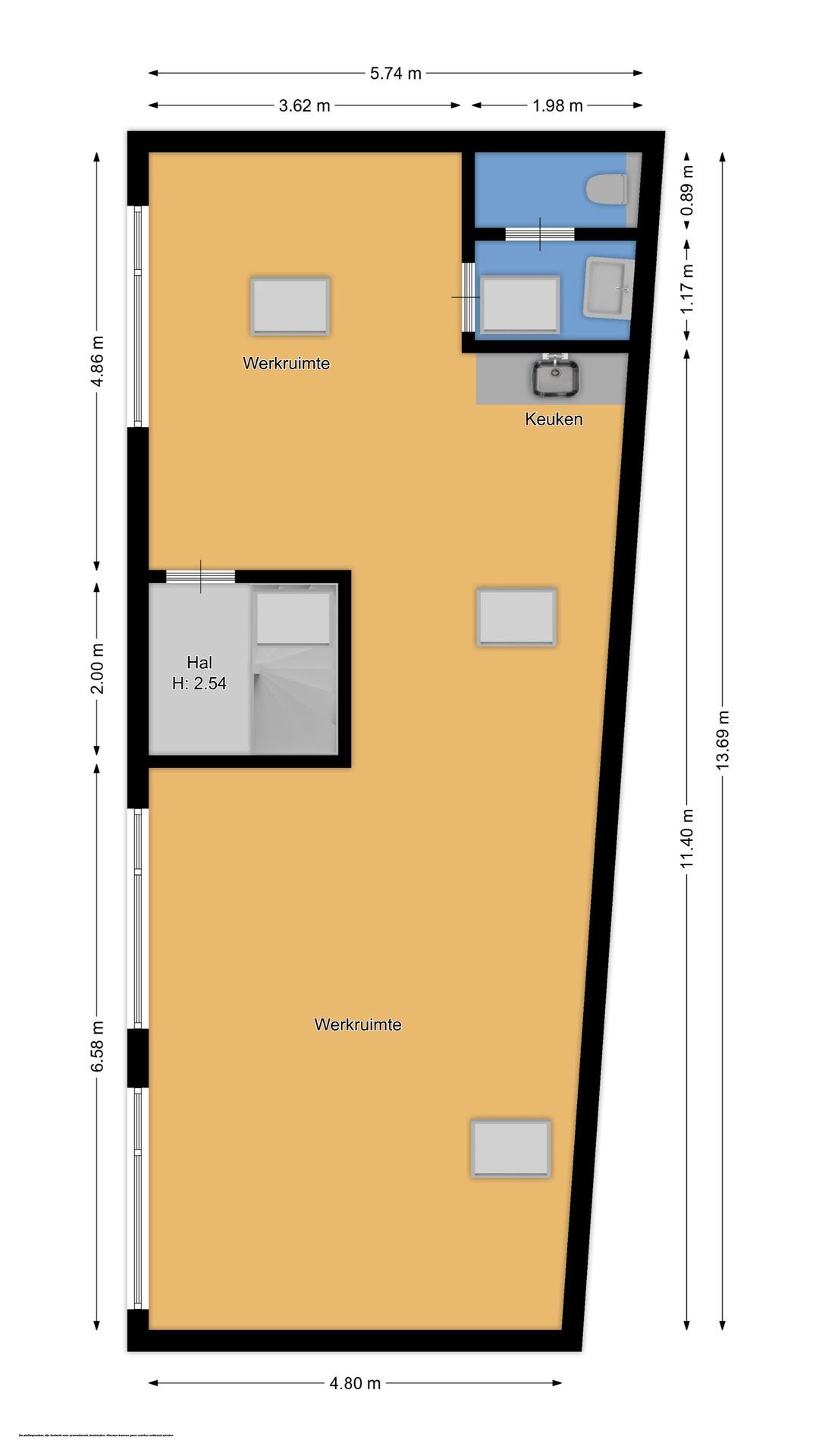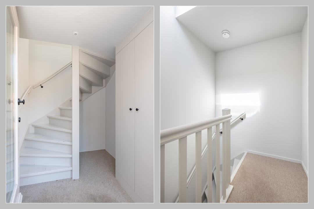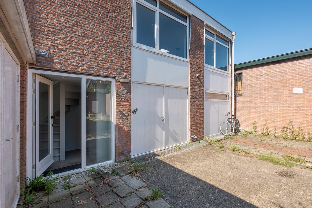 Eigen entree met hal en meterkast en ruimte voor garderobe en opslag. Het kantoor ligt boven een ateliertje en heeft geen directe aangrenzende buren, wat optimale privacy biedt.