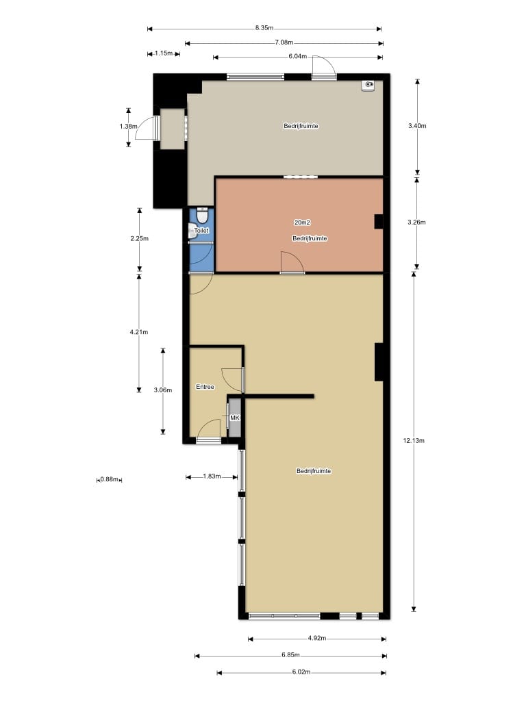 Het pand beschikt over een eigen toegang en is intern verdeeld in twee afzonderlijke ruimtes van circa 130 m² en circa 65 m². Beide ruimtes hebben een eigen entree, afzonderlijke meters, een eigen pantry en een eigen toilet. Verwarming en koeling geschieden middels een airco-installatie. Het pand wordt opgeleverd in de huidige staat.