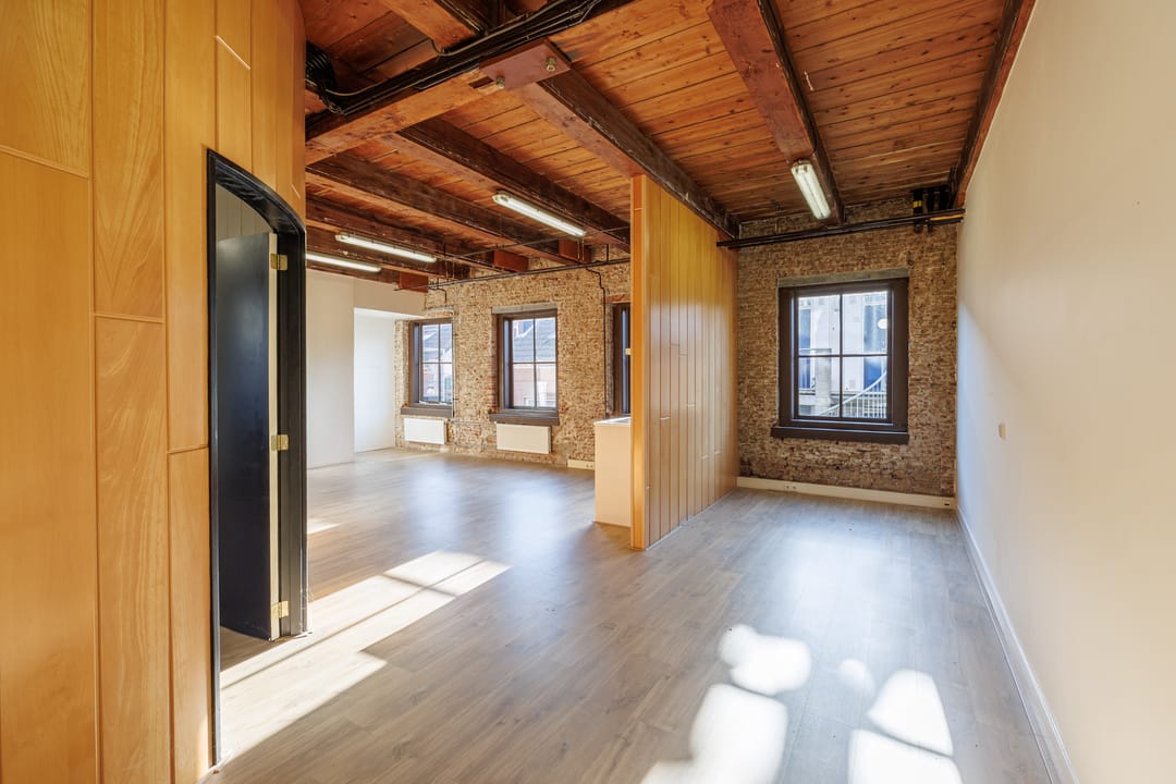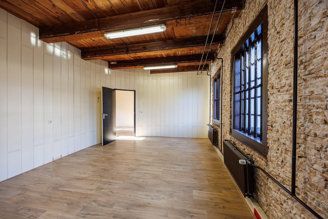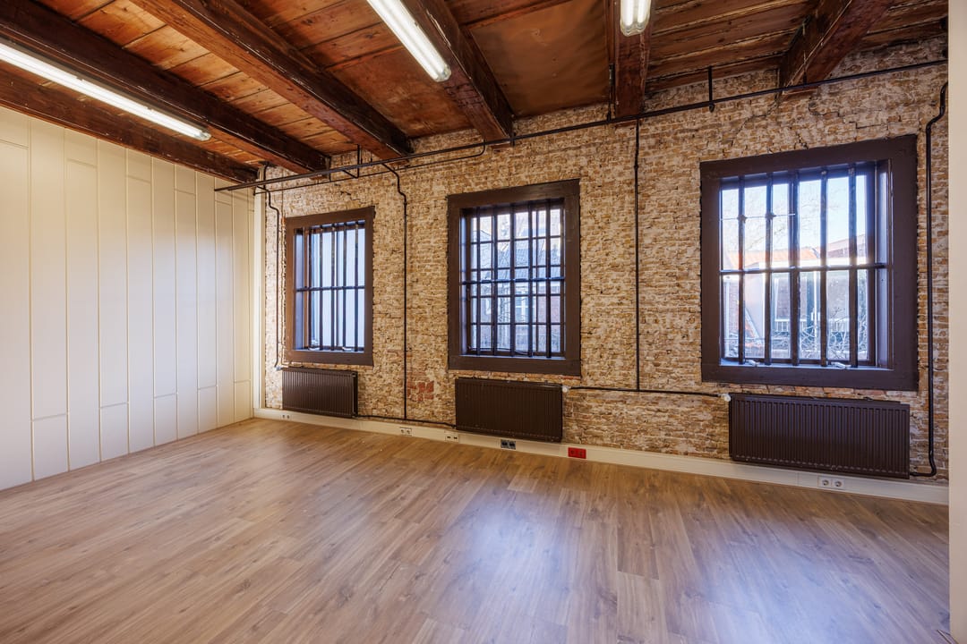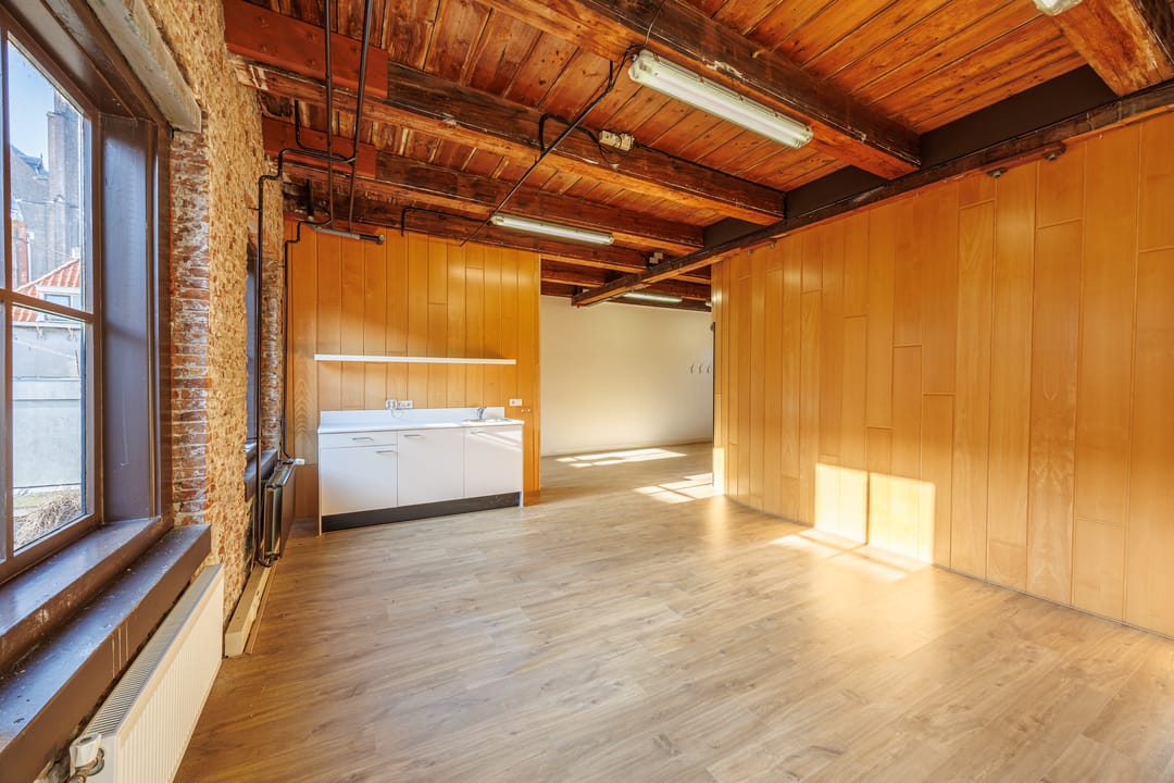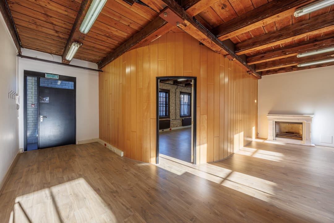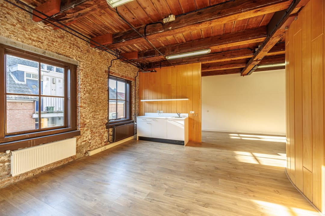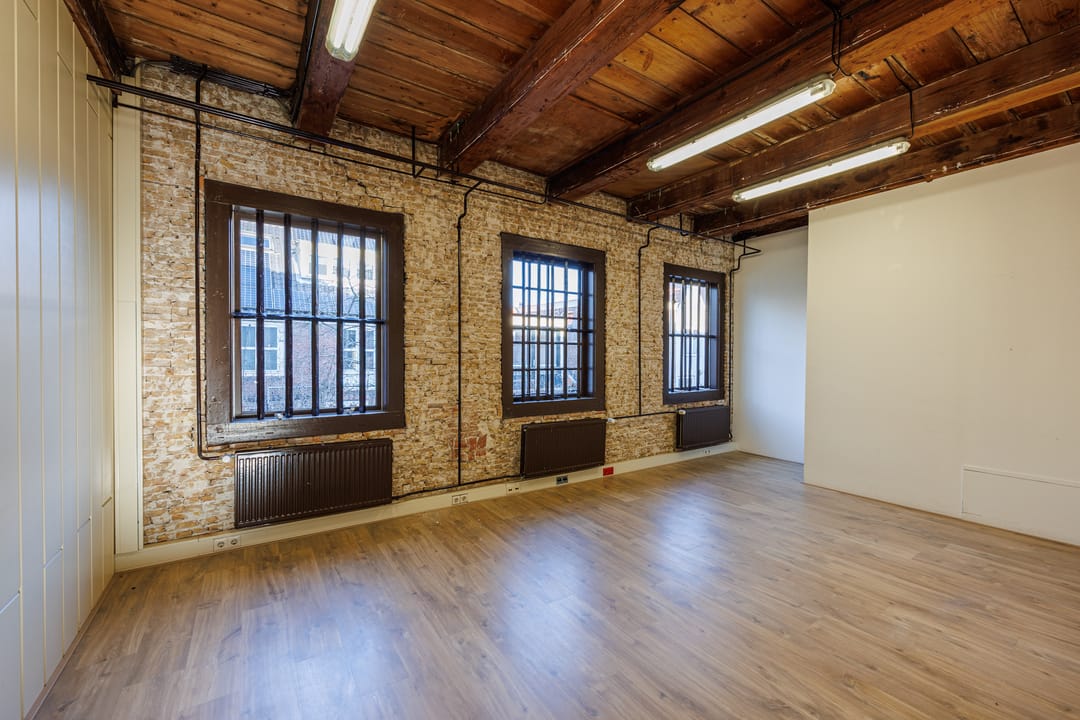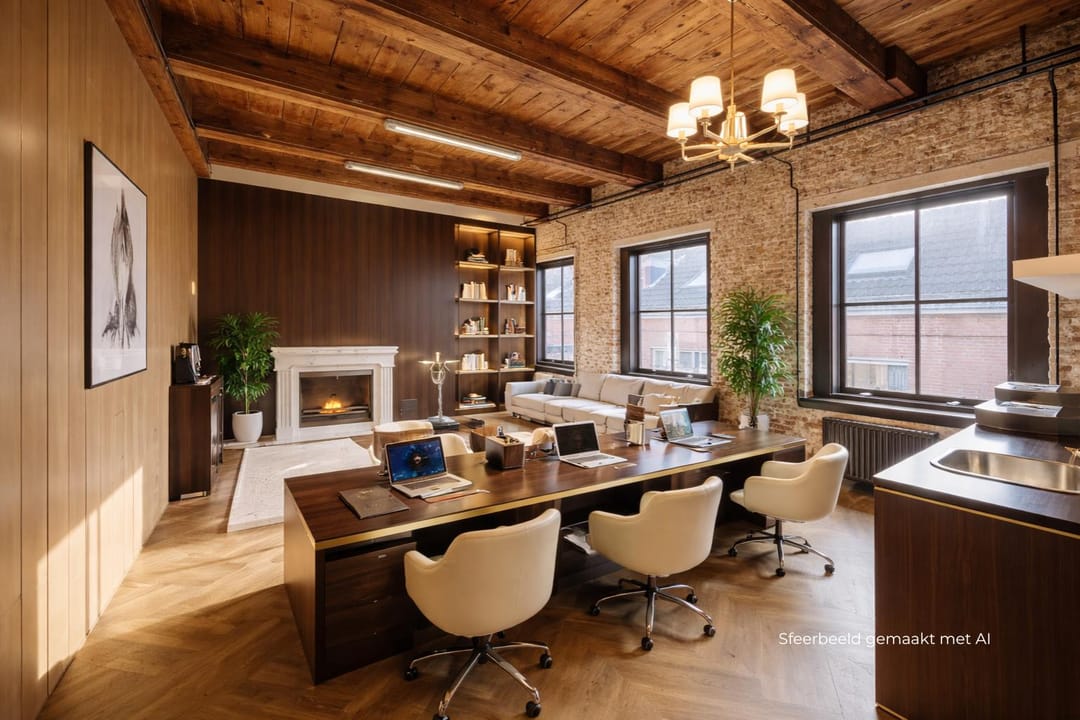 Dit karakteristieke kantoor is een absolute eyecatcher dankzij de prachtige mix van historische details en moderne afwerking. De houten balken, het hoge plafond en de stoere bakstenen wanden geven de ruimte een authentieke uitstraling. De grote ramen zorgen voor veel natuurlijk licht, waardoor de ruimte ruim en prettig aanvoelt.