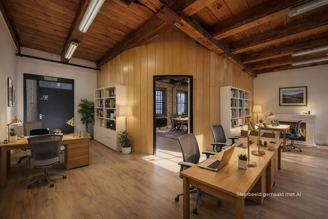 De indeling met een centrale houten tussenwand, meerdere ruimten en een sfeervolle open haard geeft het kantoor een unieke, bijna huiselijke charme. Ideaal voor ondernemers die graag werken in een inspirerende en warme omgeving. Het lichte vloerwerk en de open structuur maken het kantoor geschikt voor diverse werkopstellingen, van creatieve studio tot rustig kantoor. Een bijzondere plek die sfeer, historie en functionaliteit op een natuurlijke manier samenbrengt.