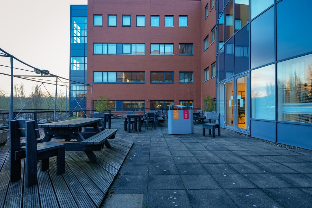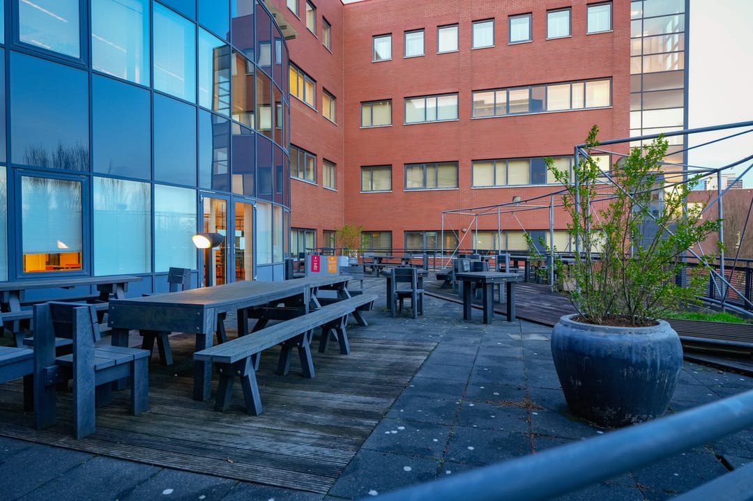 Het kantoorgebouw beschikt over een ruim parkeerterrein aan de achterzijde. Daarnaast bevindt zich hier een groene buitenruimte met een terras en een sfeervolle waterpartij. Deze buitenruimte vormt een natuurlijke verlenging van de kantooromgeving en draagt bij aan een prettige werk- en verblijfsbeleving. Bovendien beschikt het gebouw over een royaal dakterras, wat extra mogelijkheden biedt voor ontspanning en informeel overleg. Samen zorgen deze faciliteiten voor een optimale werkomgeving.