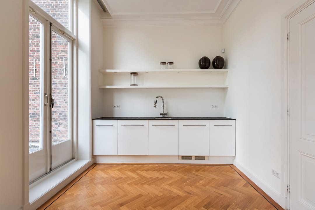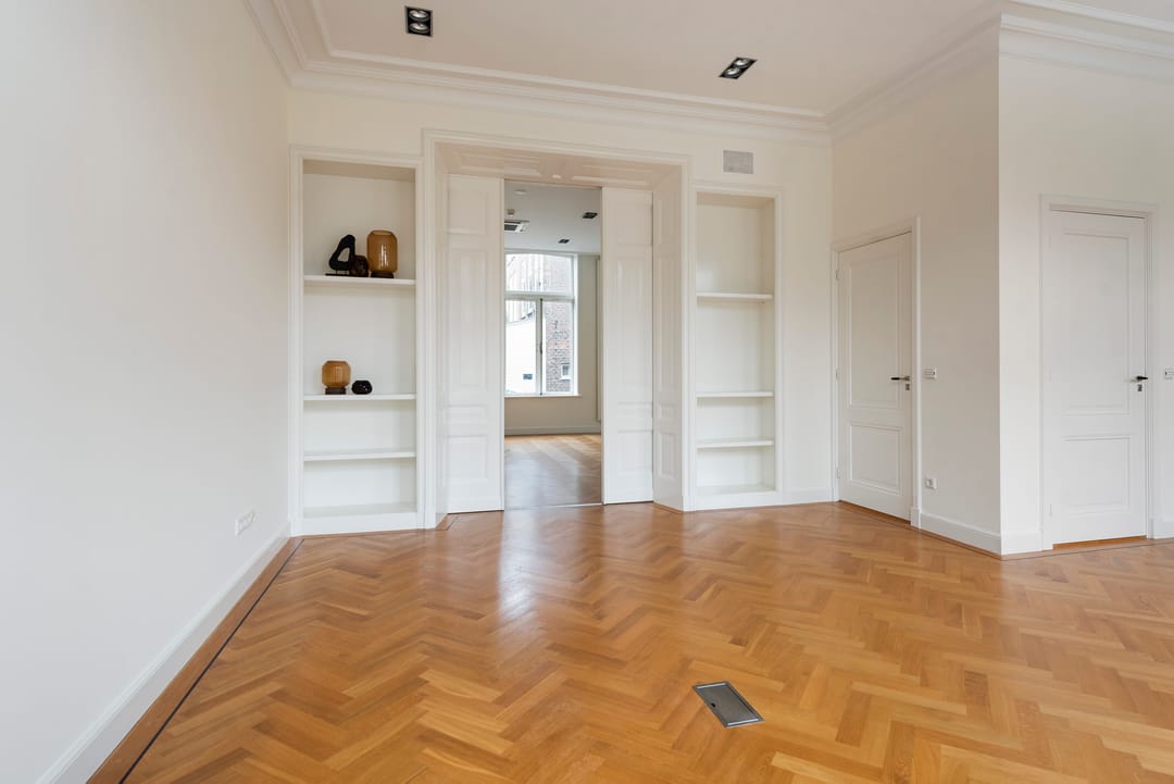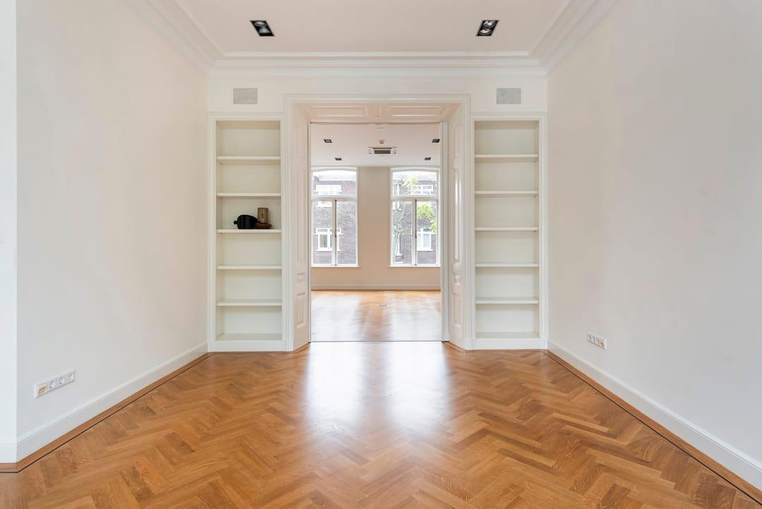 A classic office space featuring beautiful wooden floors and tall windows that provide ample natural light. The layout consists of generous en-suite rooms, highly suitable for offices or meeting rooms. This floor also includes a private toilet.