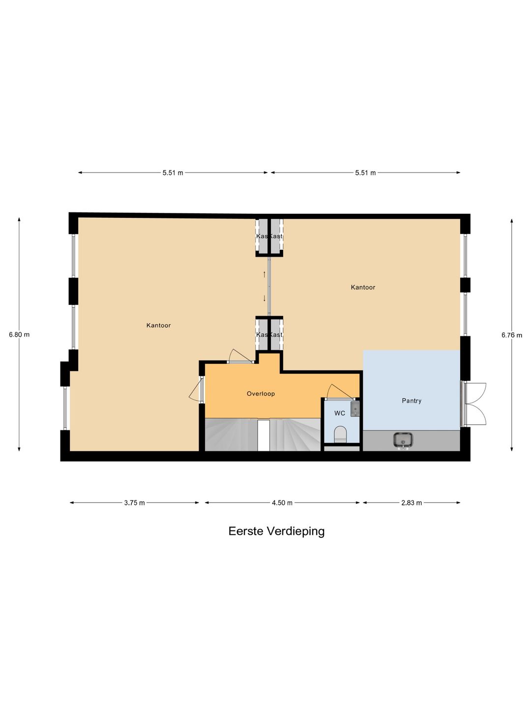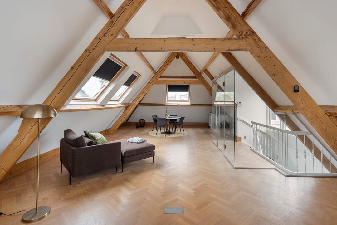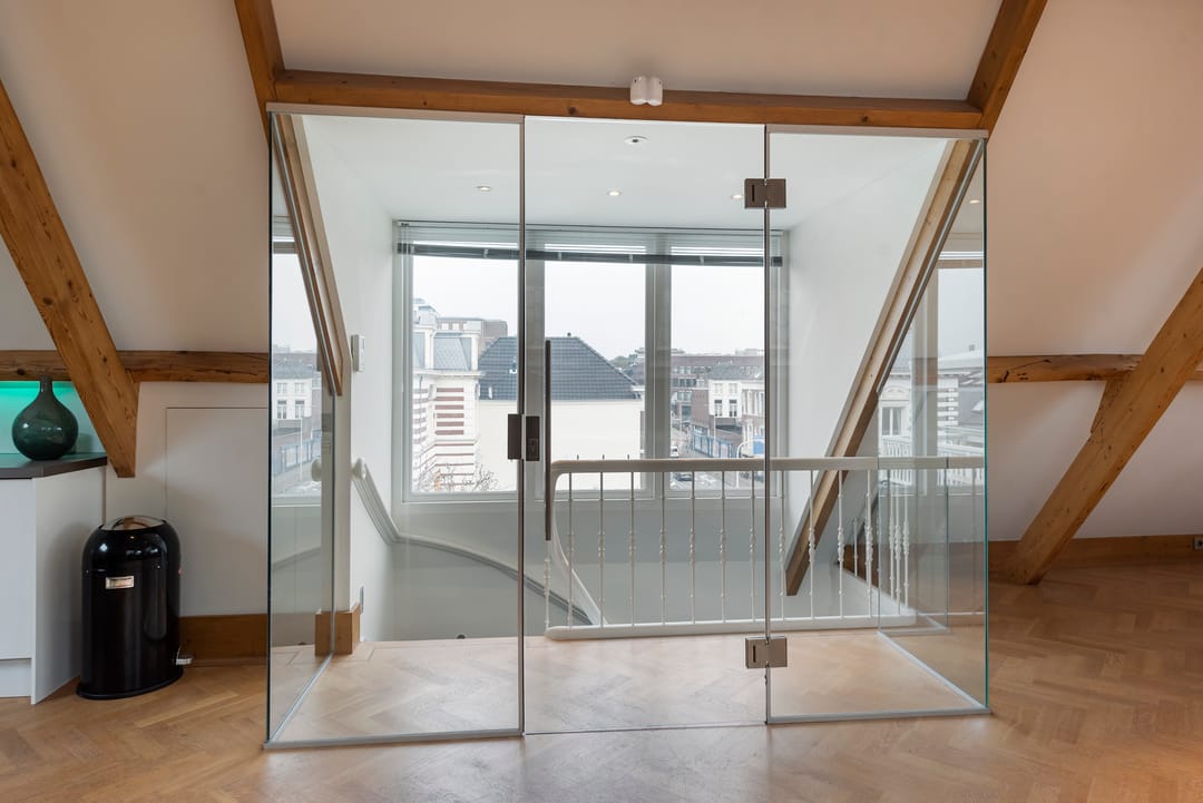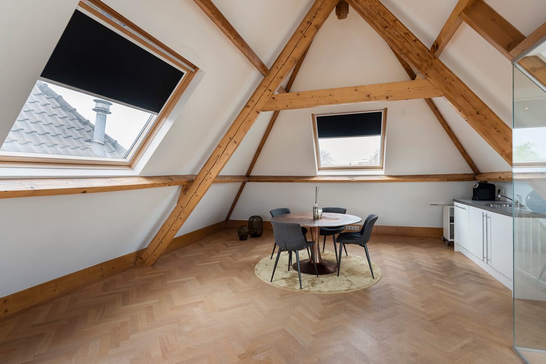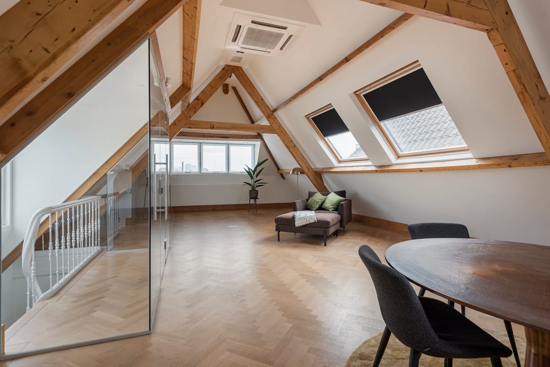 A unique office space located under the roof, with exposed wooden beams and abundant daylight through several skylights. The open-plan layout is perfectly suited as a creative workspace or meeting area. A modern glass partition near the staircase enhances the sense of openness and light. The toilet for the third floor is located on the second floor.