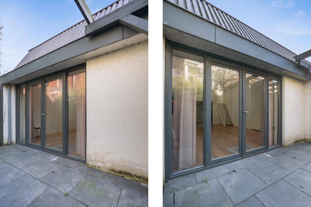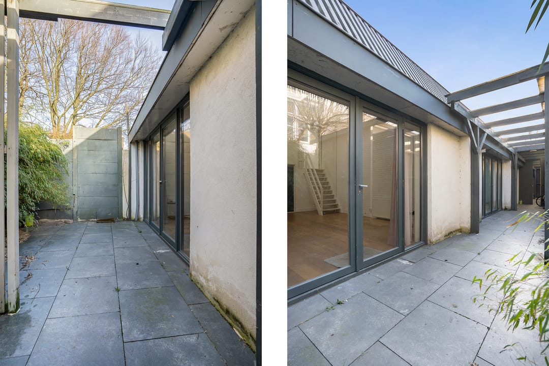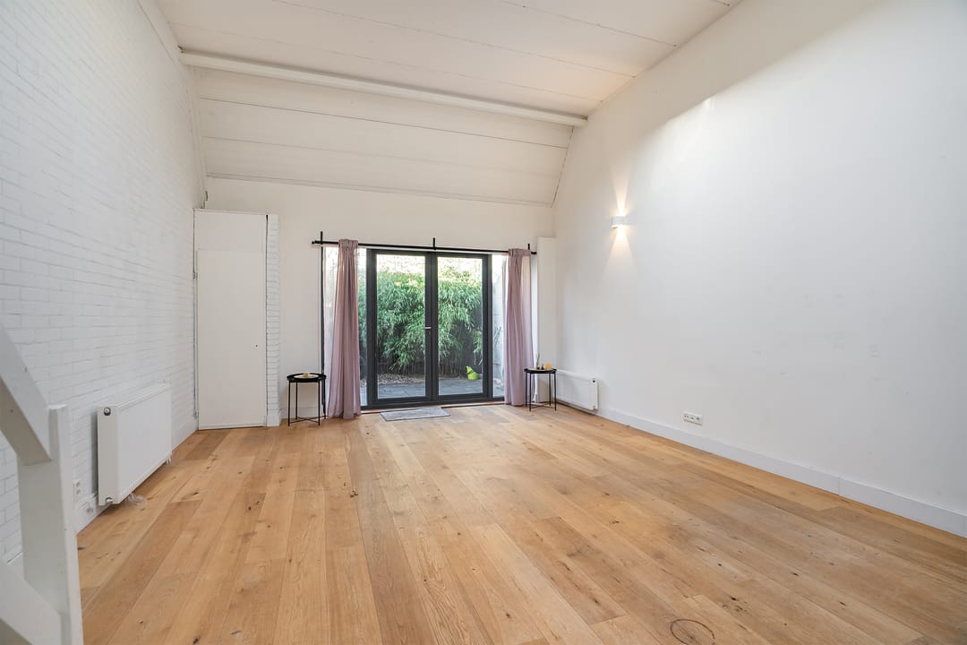 Via poort aan de straat toegang tot een binnenplaats met doorloop naar de achterliggende bedrijfsruimtes. Entree ruimte via pui met openslaande deuren; grote voorruimte ca. 6.00x4.57 (hoogte 3.84) met lamelparket vloer; achterkamer/eetruimte/vergaderruimte ca. 3.21x2.71 met lamelparket en met glazen pui afgescheiden van de voorruimte