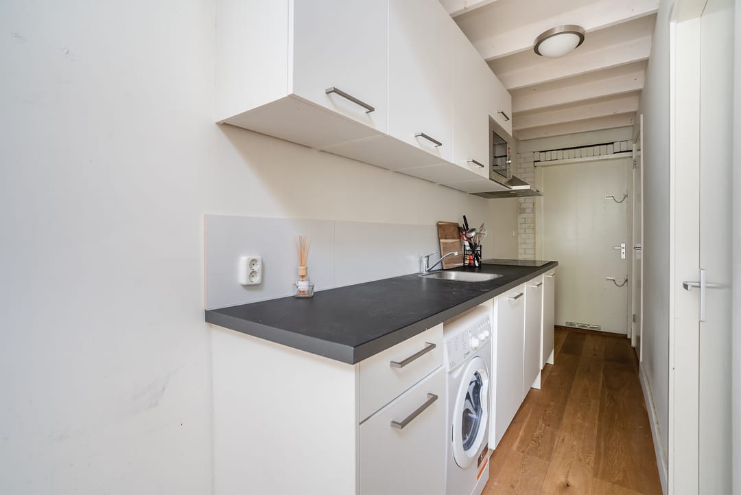 trap naar bovengelegen bergruimte; open keuken met apparatuur; wasruimte met toilet/douche en wastafel.