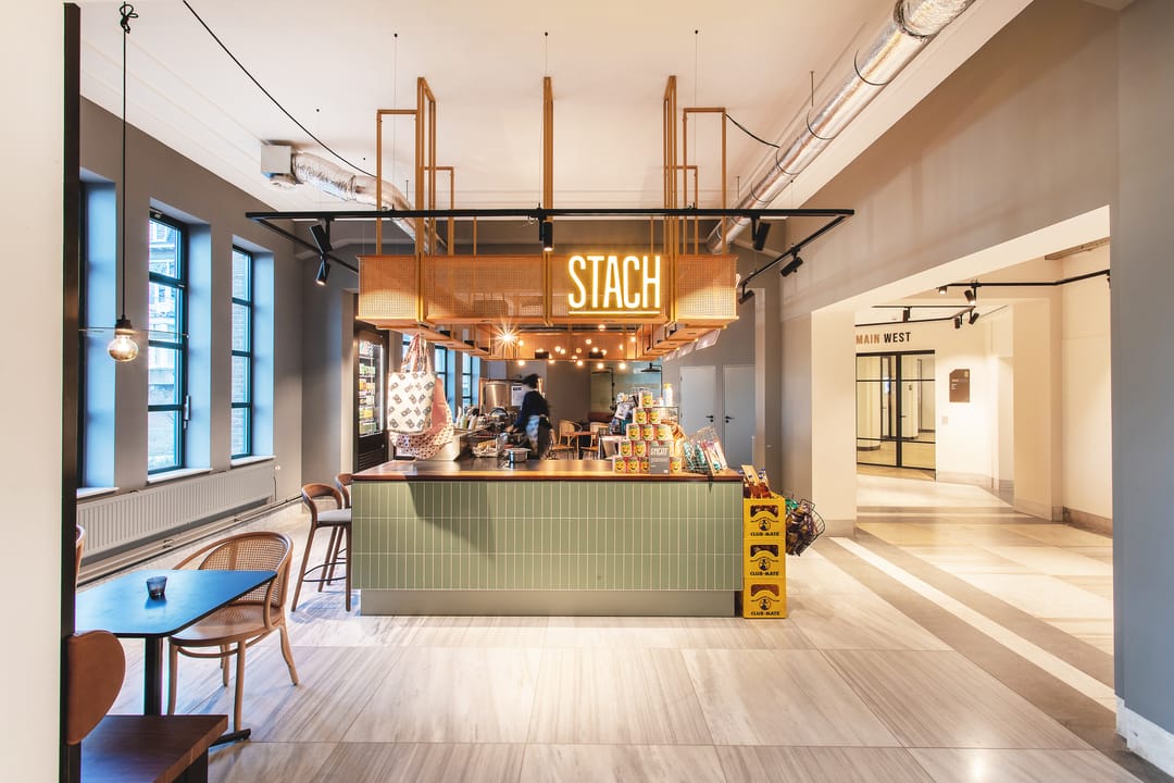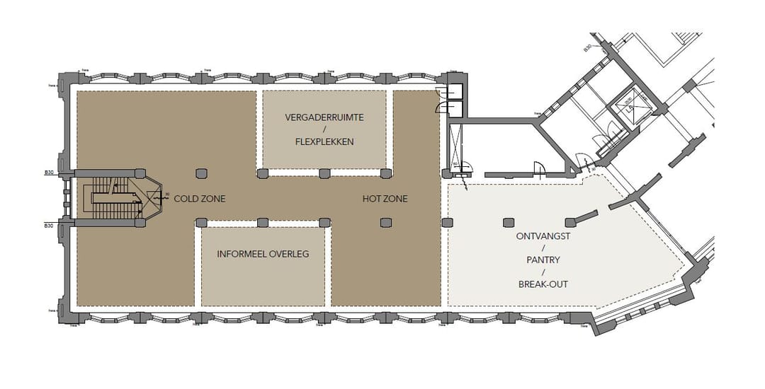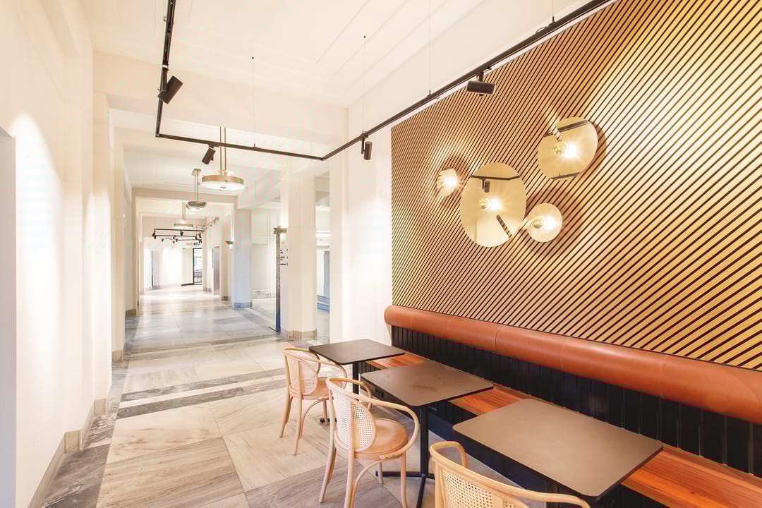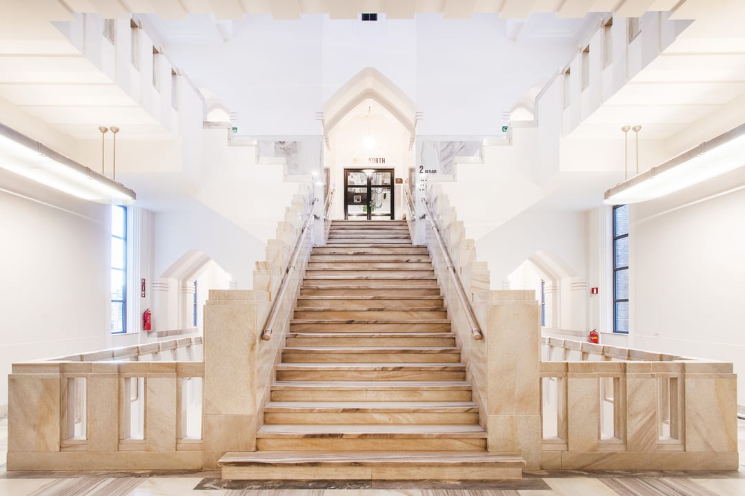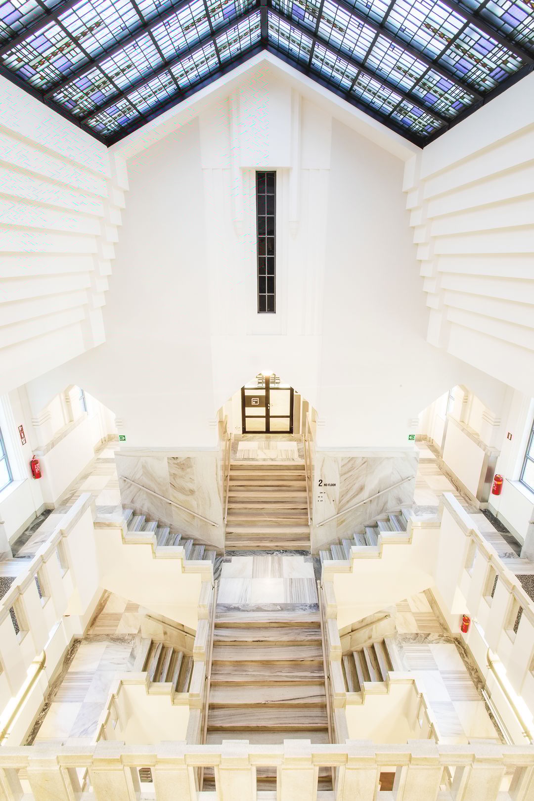 MAIN Offices is a distinctive office complex built around 1921. The former headquarters of the Post, Cheque and Giro Service was constructed in impressive monumental architecture. While the exterior of the building is classical, the interior is remarkably modern. Inside the spacious central hall, the staircase immediately stands out, with its walls clad in glossy polished marble. In addition, the monumental staircase is crowned by a generous atrium featuring a beautiful stained-glass skylight.